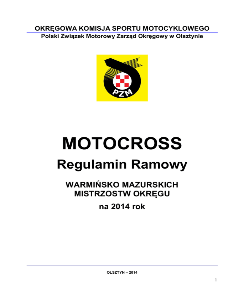OKRĘGOWA KOMISJA SPORTU MOTOCYKLOWEGO Polski Związek Motorowy Zarząd Okręgowy w Olsztynie MOTOCROSS Regulamin Ramowy WARMIŃSKO MAZURSKICH MISTRZOSTW OKRĘGU na 2014 rok OLSZTYN – 2014 1 Słowniczek Używanych skrótów w konkurencji motocross: ZG PZM - Zarząd Główny Polskiego Związku Motorowego ZO PZM - Zarząd Okręgowy Polskiego Związku Motorowego GKSM - Główna Komisja Sportu Motocyklowego (przy ZG PZM) OKSM - Okręgowa Komisja Sportu Motocyklowego (przy ZO PZM) Gestor - Zatwierdza i nadzoruje cykl rozgrywek Klub/Stowarzyszenie - członek rzeczywisty zarejestrowany w Polskim Związku Motorowym Impreza - wszelkie współzawodnictwo, zawody, trening, zlot z udziałem pojazdów mechanicznych, będące forma aktywności motorowej wchodzące w zakres działalności Polskiego Związku Motorowego. Uczestnik imprezy - każda osoba prawna(sponsor, producent, itp.) i fizyczna (zawodnik, pasażer osoba urzędowa i funkcyjna, mechanik itp.), biorące udział w imprezie. Wyścigi - wyścigi motocyklowe rozgrywane na torach zamkniętych ze wspólnego startu. Nielegalna impreza - wszelkie współzawodnictwo (zawody, trening) z pomiarem czasu lub wyłanianiem zwycięzców na imprezach nie zgłoszonych i nie zatwierdzonych przez Polski Związek Motorowy. – w tego typu imprezach jest absolutny zakaz udziału zawodników jak również sędziów zarejestrowanych w Polskim Związku Motorowym. Pod groźbą skreślenia z członka PZM (zawodnika, sędziego, klubu). Zawodnik/Sędzia - są to osoby, które mają wystawione odpowiednie dokumenty przez Polski Związek Motorowy. Zawodnik certyfikat i licencję. Sędzia legitymacje sędziowską. MP - Mistrzostwa Polski Motocross PP - Puchar Polski Motocross MSP - Mistrzostwa Strefy Północnej WMMO - Warmińsko Mazurskie Mistrzostwa Okręgu w Motocrossie RR - Regulamin Ramowy jest to zbiór przepisów obowiązujących na dany rok w Mistrzostwach Polski, Pucharze Polski, Mistrzostwach Strefy Północnej i Mistrzostwach Okręgu w Motocrossie RU - Regulamin Uzupełniający Zawodów jest to Regulamin wydany przez organizatora imprezy i zatwierdzany przez: • • • • Regulamin Mistrzostw Polski zatwierdza GKSM, Regulamin Pucharu Polski zatwierdza GKSM, Regulamin Mistrzostw Strefy Północnej zatwierdza Gestor Strefy, Regulamin Mistrzostw Okręgu zatwierdza OKSM. 2 1. Ustalenia ogólne 1.1. Warmińsko Mazurskie Mistrzostwa Okręgu w Motocrossie (zwane dalej WMMO) są własnością Polskiego Związku Motorowego (zwanego dalej PZM). 1.2. Nadzór nad przebiegiem WMMO sprawuje Okręgowa Komisja Sportu Motocyklowego (zwana dalej OKSM). 1.3. WMMO – organizowane są przez Automobilkluby i Kluby sfederowane w PZM w oparciu o Regulamin Ramowy GKSM, Regulamin Ramowy Strefy Północnej oraz niniejszy Regulamin Ramowy WMMO. 1.4. W Rundach WMMO muszą być spełnione wszelkie wymogi bezpieczeństwa dotyczące organizatorów Rund WMMO. 2. Charakter zawodów 2.1 W ramach Mistrzostw Okręgu w Motocrossie w zawodach motocyklowych rozegranych będzie 6 rund. Zawody motocrossowe są zawodami otwartymi. Zawody rozgrywane będą w oparciu o Ramowy Regulamin Mistrzostw Polski i Pucharu Polski w Motocrossie na 2014r.(RR), komunikaty GKSM, Gestora Strefy Północnej i OKSM, niniejszy regulamin oraz regulamin uzupełniający zawodów. 2.2 Zawody będą rozgrywane w klasach: - klasa MX 65 - klasa MX 85 - klasa MX 2 C - klasa MX 1 C - klasa MX B - klasa MX 2 Junior - klasa MX Masters - klasa Open (MX1+MX2) - klasa MX Quad Open - klasa MX Kobiet 2.3 W zawodach mogą uczestniczyć zawodnicy z licencjami „C”, „B” i „A” uprawniającymi do startów w motocrossie, posiadający ważne badania lekarskie potwierdzone przez lekarza ze specjalizacją medycyny sportowej. 2.4 Tytuł Mistrza, Wicemistrza, II Wicemistrza Okręgu przyznaje się w przypadku, gdy w klasyfikacji końcowej będzie sklasyfikowanych minimum 10 zawodników w danej klasie. 2.5 Tytuł Mistrza i Wicemistrza okręgu przyznaje się w przypadku, gdy w klasyfikacji końcowej będzie sklasyfikowanych minimum 8 zawodników w danej klasie. 2.6 W przypadku, gdy w klasyfikacji końcowej będzie sklasyfikowanych tylko 6-ciu zawodników przyznawany będzie tylko tytuł Mistrza Okręgu. 2.7 W przypadku sklasyfikowania mniejszej ilości niż 6-ciu zawodników w klasie nie będzie przyznany żaden tytuł. Będzie to 1 miejsce, 2, 3, ...itd. 3 3. Podział na klasy i wymagane licencje Klasa MX 65 (tylko motocykle 2T – koła maksymalnie 12-14 cali) Motocykle o pojemności do 65 cc. 2T Wiek zawodników: od 8 lat do 12 lat Licencja: A lub B i C motocross Klasa MX 85 (tylko motocykle 2T – koła minimalne 14-16 cali, maksymalne 16-19 cali) Motocykle o pojemności do 85 cc Wiek zawodników: od 10 lat do 15 lat. Licencja A lub B i C motocross Klasa MX 2 Junior Motocykle o pojemności od 100cc do 125cc 2T Motocykle o pojemności od 175cc do 250cc 4T Wiek zawodników; od 14 lat do 19 lat Licencja A lub B i C motocross Klasa MX 2 C Motocykle o pojemności od 100cc do 150cc 2 T, 175cc do 250cc 4 T Wiek zawodnika od 15 lat Licencja C Klasa MX 1 C Motocykle o pojemności od 175 cc do 500 cc 2T i 290 cc do 650 cc 4T Wiek zawodnika od 17 lat Licencja C Klasa MX B Zawodnicy od 15 lat, motocykle o pojemności od 100cc do 150cc 2 T, 175cc do 250cc 4 T Zawodnicy od 17 lat motocykle o pojemności od 175 cc do 500 cc 2T i 290 cc do 650 cc 4T Licencja B motocross Klasa MX Masters Motocykle o pojemności pow.100 do 500cc 2T i od 175 do 650cc 4T Wiek zawodnika: od 40 lat. W 2014 r. prawo startu mają zawodnicy urodzeni w 1974 i starsi. Licencja A lub B i C motocross Klasa MX Kobiet Motocykle o pojemności od 85 do 250 cc 2T i od 150 do 250cc 4T Wiek zawodniczki: od 14 lat Licencja A, B lub C motocross Klasa MX Quad Open Zawodnicy od 14 do 19 lat na quadach o pojemności do 500 cc Zawodnicy od 17 lat na quadach o pojemności do 750cc. Licencja A lub B i C motocross Klasa MX Open (MX1 i MX2) Zawodnicy od 14 lat, motocykle o pojemności od 100