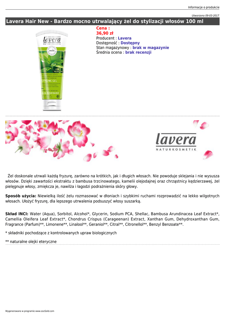 Informacje o produkcie Utworzono 09-03-2017 Lavera Hair New - Bardzo mocno utrwalający żel do stylizacji włosów 100 ml Cena : 36,90 zł Producent : Lavera Dostępność : Dostępny Stan magazynowy : brak w magazynie Średnia ocena : brak recenzji Żel doskonale utrwali każdą fryzurę, zarówno na krótkich, jak i długich włosach. Nie powoduje sklejania i nie wysusza włosów. Dzięki zawartości ekstraktu z bambusa trzcinowatego, kamelii olejodajnej oraz chrząstnicy kędzierzawej, żel pielęgnuje włosy, zmiękcza je, nawilża i łagodzi podrażnienia skóry głowy. Sposób użycia: Niewielką ilość żelu rozmasować w dłoniach i szybkimi ruchami rozprowadzić na lekko wilgotnych włosach. Ułożyć fryzurę, dla lepszego utrwalenia podsuszyć włosy suszarką. Skład INCI: Water (Aqua), Sorbitol, Alcohol*, Glycerin, Sodium PCA, Shellac, Bambusa Arundinacea Leaf Extract*, Camellia Oleifera Leaf Extract*, Chondrus Crispus (Carageenan) Extract, Xanthan Gum, Dehydroxanthan Gum, Fragrance (Parfum)**, Limonene**, Linalool**, Geraniol**, Citral**, Citronellol**, Benzyl Benzoate**. * składniki pochodzące z kontrolowanych upraw biologicznych ** naturalne olejki eteryczne Wygenerowano w programie www.oscGold.com