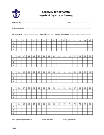 EGZAMIN TEORETYCZNY na patent żeglarza jachtowego Miejsce egz. ……………………………………………………… Data ……………………….……………. Imię i nazwisko …………………………………………………………………………………………………………………………………… Nr egzaminu …………………………….. Zestaw …………… Podpis osoby egz. ………………………………………… 1 2 3 4 5 6 7 8 9 10 11 12 13 14 15 16 17 18 19 20 21 22 23 24 25 26 27 28 29 30 31 32 33 34 35 36 37 38 39 40 41 42 43 44 45 46 47 48 49 50 51 52 53 54 55 56 57 58 59 60 61 62 63 64 65 66 67 68 69 70 71 72 73 74 75 A B C A B C A B C A B C A B C Ilość odpowiedzi prawidłowych ………………… WW Ocena (poz/neg) ……………... Podpis egzaminatora ………………………………..