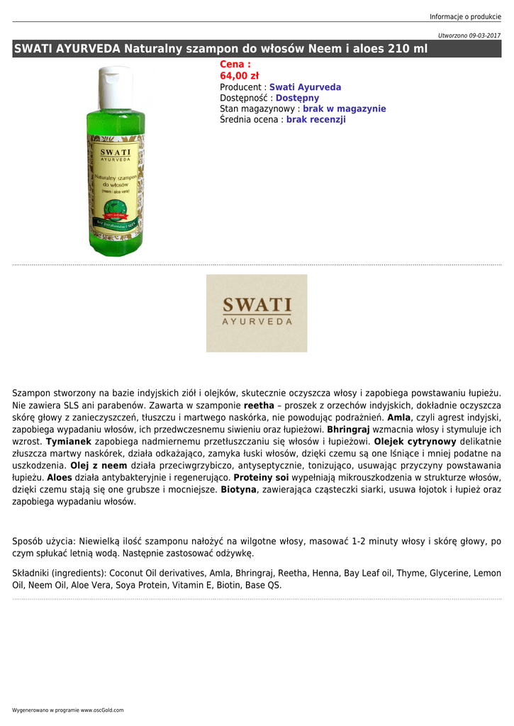 Informacje o produkcie Utworzono 09-03-2017 SWATI AYURVEDA Naturalny szampon do włosów Neem i aloes 210 ml Cena : 64,00 zł Producent : Swati Ayurveda Dostępność : Dostępny Stan magazynowy : brak w magazynie Średnia ocena : brak recenzji Szampon stworzony na bazie indyjskich ziół i olejków, skutecznie oczyszcza włosy i zapobiega powstawaniu łupieżu. Nie zawiera SLS ani parabenów. Zawarta w szamponie reetha – proszek z orzechów indyjskich, dokładnie oczyszcza skórę głowy z zanieczyszczeń, tłuszczu i martwego naskórka, nie powodując podrażnień. Amla, czyli agrest indyjski, zapobiega wypadaniu włosów, ich przedwczesnemu siwieniu oraz łupieżowi. Bhringraj wzmacnia włosy i stymuluje ich wzrost. Tymianek zapobiega nadmiernemu przetłuszczaniu się włosów i łupieżowi. Olejek cytrynowy delikatnie złuszcza martwy naskórek, działa odkażająco, zamyka łuski włosów, dzięki czemu są one lśniące i mniej podatne na uszkodzenia. Olej z neem działa przeciwgrzybiczo, antyseptycznie, tonizująco, usuwając przyczyny powstawania łupieżu. Aloes działa antybakteryjnie i regenerująco. Proteiny soi wypełniają mikrouszkodzenia w strukturze włosów, dzięki czemu stają się one grubsze i mocniejsze. Biotyna, zawierająca cząsteczki siarki, usuwa łojotok i łupież oraz zapobiega wypadaniu włosów. Sposób użycia: Niewielką ilość szamponu nałożyć na wilgotne włosy, masować 1-2 minuty włosy i skórę głowy, po czym spłukać letnią wodą. Następnie zastosować odżywkę. Składniki (ingredients): Coconut Oil derivatives, Amla, Bhringraj, Reetha, Henna, Bay Leaf oil, Thyme, Glycerine, Lemon Oil, Neem Oil, Aloe Vera, Soya Protein, Vitamin E, Biotin, Base QS. Wygenerowano w programie www.oscGold.com