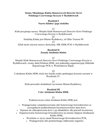 Status Miejskiego Klubu Honorowych Dawców Krwi Polskiego Czerwonego Krzyża w Rydułtowach Rozdział I Nazwa Klubu i jego siedziba §1 Klub przyjmuje nazwę: Miejski Klub Honorowych Dawców Krwi Polskiego Czerwonego Krzyża w Rydułtowach §2 Siedzibą Klubu jest Miasto Rydułtowy, ul Ofiar Terroru 99 §3 Klub może używać nazwy skróconej: MK HDK PCK w Rydułtowach Rozdział II Zasady działania Klubu §1 Miejski Klub Honorowych Dawców Krwi Polskiego Czerwonego Krzyża w Rydułtowach, zwany dalej Klubem HDK, jest jednostką organizacyjną Oddziału Rejonowego PCK w Wodzisławiu Śląski. §2 Członkiem Klubu HDK może być każda osoba spełniająca kryteria zawarte w Rozdziale IV. §3 Klub prowadzi działalność na terenie Miasta Rydułtowy. Rozdział III Cele i działania Klubu HDK §1 Podstawowym celem działania Klubu HDK jest: Propagowanie i popularyzowanie idei honorowego krwiodawstwa ze szczególnym podkreśleniem bezinteresowności daru krwi, Dążenie do zabezpieczenia krwi i jej składników dla potrzeb lecznictwa, Organizowanie honorowego krwiodawstwa na terenie objętym działaniem Klubu HDK, Wcielanie w życie zasad Honorowego Krwiodawstwa PCK, Propagowanie idei pośmiertnego oddawania organów, Nawiązywanie kontaktów z innymi Klubami w ramach integracji środowisk Honorowych Dawców Krwi. §2 Do podstawowych działań Klubu HDK należą: Systematyczne organizowanie zbiorowego i indywidualnego oddawania krwi honorowo, we współpracy z placówkami służby krwi, Organizowanie doraźnych akcji honorowego krwiodawstwa w przypadkach nagłej potrzeby, Udzielanie pomocy organizacyjnej przy pobieraniu krwi przez ekipy wyjazdowe stacji i punktów krwiodawstwa, Otaczanie należytą troską i opieka członków Klubu HDK oraz udzielanie im pomocy w trudnych sytuacjach życiowych, Organizowanie w sposób uroczysty wręczania odznak, odznaczeń i wyróżnień członkom klubu (z zachowaniem wymogów obowiązujących dla każdego z odznaczeń), Organizowanie otwartych imprez kulturalno-oświatowych i turystycznosportowych dla członków klubu oraz sympatyków ruchu, Integracja środowisk honorowych dawców krwi, Organizowanie szkoleń z zakresu pierwszej pomocy. Rozdział IV Członkostwo w Klubie HDK §1 Członkiem zwyczajnym Klubu HDK może zostać : a) każdy honorowy dawca krwi, który: o wyraził wolę wstąpienia do Klubu poprzez pisemną deklarację członkowską i został przyjęty przez Zarząd Klubu, zobowiązał się do honorowego oddawania krwi lub jej składników co najmniej raz w roku kalendarzowym, o ze względu na stan zdrowia nie może nadal oddawać krwi lecz aktywnie uczestniczy w pracach Klubu HDK, o nie należy do innego Klubu HDK. o b) każda osoba nie oddająca krwi lecz wspierająca działalność Klubu §2 Przynależność do Klubu HDK ustaje w przypadku dobrowolnego wystąpienia z klubu lub przejścia do innego klubu HDK. §3 Członek Klubu HDK może być wykluczony z klubu z jednego z następujących powodów: nie uczestniczenia w realizacji zadań klubu, nieprzestrzegania postanowień statutu, regulaminów lub uchwał organów PCK, działania na szkodę organizacji, nie opłacania składek członkowskich przez więcej niż 12 miesięcy, pozbawienia praw publicznych prawomocnym wyrokiem sądu. §4 Członek Klubu HDK ma prawo: wybierać i być wybieranym do władz Klubu, uczestniczyć w określaniu programów działania Klubu i ich realizacji, nosić odznaki organizacyjne, korzystać z przysługujących uprawnień wynikających ze Statutu PCK, Regulaminu Klubu Honorowych Dawców Krwi PCK, Uchwały Programowej Klubu oraz innych przepisów. §5 Członek Klubu HDK ma obowiązek: przestrzegać postanowień Statutu PCK, Regulaminu Klubu Honorowych Dawców Krwi PCK, Uchwały Programowej Klubu, stosować się do uchwał organów PCK, opłacać składki członkowskie, prezentować postawę zgodną z normami moralnymi, zwyczajowymi i prawnymi, realizować uchwały zarządu Klubu HDK, a w szczególności honorowo oddawać krew, przestrzegać i propagować ogólne zasady higieny zdrowotnej. Rozdział V Władze Klubu HDK §1 Władzami Klubu HDK są: Zarząd Klubu HDK, Zebranie Członków Klubu HDK, które zarząd ma obowiązek zwołać przynajmniej jeden raz w ciągu roku. §2 Zebranie Członków Klubu HDK: po rozpatrzeniu sprawozdania za okres kadencji podejmuje decyzję o udzieleniu absolutorium Zarządowi Klubu HDK, uchwala program działania Klubu, wybiera prezesa i pozostałych członków zarządu Klubu, wybiera przedstawicieli na konferencję rejonową PCK, wybiera delegatów na Zjazd Rejonowy PCK, na pierwszym zebraniu w roku ustala wysokość i częstotliwość składki członkowskiej obowiązującej w danym roku kalendarzowym. §3 Zarząd Klubu HDK wybiera ze swojego grona wiceprezesa oraz sekretarza. §4 Kadencja Zarządu Klubu HDK trwa 4 lata. §5 Zarząd Klubu HDK: wykonuje uchwały zebrania członków Klubu, uchwały organów PCK wyższego stopnia oraz kieruje Klubem, reprezentuje członków Klubu wobec władz organizacyjnych, administracyjnych, samorządowych i społecznych, współpracuje z Regionalnym Centrum Krwiodawstwa i Krwiolecznictwa w Raciborzu, odbywa posiedzenia wg potrzeb, nie rzadziej niż 6 razy w roku, i co najmniej raz na dwa miesiące, może podejmować decyzje o wykluczeniu z Klubu, podejmuje swoje decyzje zwykłą większością głosów przy obecności co najmniej połowy członków zarządu, prowadzi ewidencję członków Klubu (kartotekę), książki protokołów i uchwał oraz dokumentację gospodarki materiałami i funduszami Klubu, przedstawia kandydatów do odznaczeń i wyróżnień - w ramach trybu i zasad obowiązujących w PCK, może powoływać zespoły i komisje problemowe w zależności od potrzeb. §6 Jeżeli Zarząd Klubu HDK nie wykonuje statutowych obowiązków, może być zwołane nadzwyczajne zebranie na pisemny wniosek 1/2 liczby członków Klubu, komisji rewizyjnej lub na wniosek właściwego zarządu PCK. §7 Pra