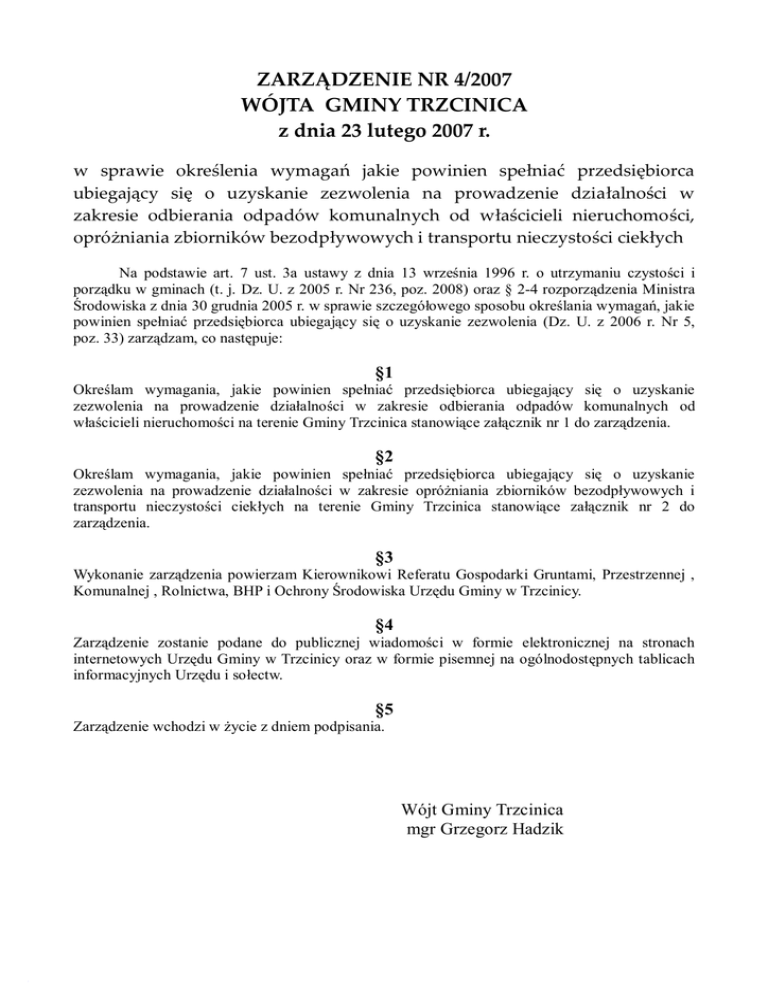 ZARZĄDZENIE NR 4/2007 WÓJTA GMINY TRZCINICA z dnia 23