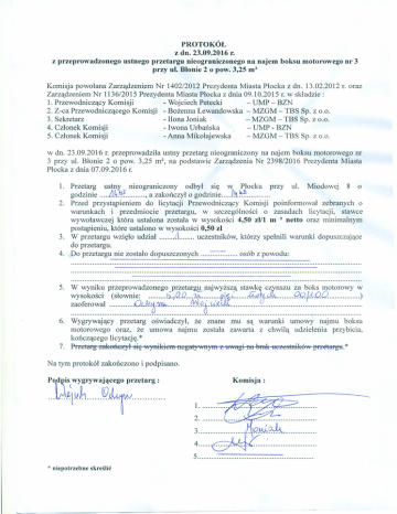 Protokoły z przetargu na najem boksu motorowego z dn. 23.09.2016 r.