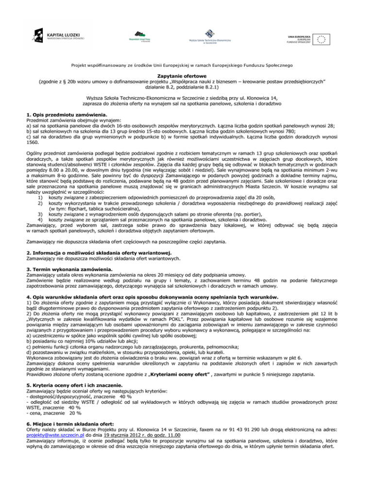 Projekt współfinansowany ze środków Unii Europejskiej w ramach Europejskiego Funduszu Społecznego Zapytanie ofertowe (zgodnie z § 20b wzoru umowy o dofinansowanie projektu „Współpraca nauki z biznesem – kreowanie postaw przedsiębiorczych” działanie 8.2, poddziałanie 8.2.1) Wyższa Szkoła Techniczno-Ekonomiczna w Szczecinie z siedzibą przy ul. Klonowica 14, zaprasza do złożenia oferty na wynajem sal na spotkania panelowe, szkolenia i doradztwo 1. Opis przedmiotu zamówienia. Przedmiot zamówienia obejmuje wynajem: a) sal na spotkania panelowe dla dwóch 16-sto osobowych zespołów merytorycznych. Łączna liczba godzin spotkań panelowych wynosi 28; b) sal szkoleniowych na szkolenia dla 13 grup średnio 15-sto osobowych. Łączna liczba godzin szkoleniowych wynosi 780; c) sal na doradztwo dla grup wymienionych w podpunkcie b) w formie spotkań indywidualnych. Łączna liczba godzin doradczych wynosi 1560. Ogólny przedmiot zamówienia podlegał będzie podziałowi zgodnie z rozbiciem tematycznym w ramach 13 grup szkoleniowych oraz spotkań doradczych, a także spotkań zespołów merytorycznych jak również możliwościami uczestnictwa w zajęciach grup docelowych, które stanowią studenci/absolwenci WSTE i członków zespołów. Zajęcia dla każdej grupy będą się odbywać w blokach tematycznych w godzinach pomiędzy 8.00 a 20.00, w dowolnym dniu tygodnia (nie wyłączając sobót i niedziel). Sale wynajmowane będą na spotkania minimum 2-wu a maksimum 8-io godzinne. Sale powinny być do dyspozycji Zamawiającego w podanych powyżej godzinach a dokładne terminy najmu, które stanowić będą podstawę do rozliczenia, podawane będą na 48 godzin przed planowanymi zajęciami. Sale szkoleniowe i doradcze oraz sale przeznaczona na spotkania panelowe muszą znajdować się w granicach administracyjnych Miasta Szczecin. W koszcie wynajmu sal należy uwzględnić w szczególności: 1) koszty związane z zabezpieczeniem odpowiednich pomieszczeń do przeprowadzenia zajęć dla 20 osób, 2) koszty wykorzystania w trakcie prowadzonego szkolenia / doradztwa wyposażenia niezbędnego do prawidłowej realizacji zajęć (w tym: flipchart, tablica suchościeralna), 3) koszty związane z wynagrodzeniem osób dysponujących salami po stronie oferenta (np. portier), 4) koszty związane ze sprzątaniem sal przeznaczonych na spotkania panelowe, szkolenia i doradztwo. Zamawiający, przed wyborem sal, zastrzega sobie prawo do sprawdzenia bazy lokalowej, w której odbywać się będą zajęcia w ramach spotkań panelowych, szkoleń i doradztwa objętych zapytaniem ofertowym. Zamawiający nie dopuszcza składania ofert częściowych na poszczególne części zapytania. 2. Informacja o możliwości składania oferty wariantowej. Zamawiający nie dopuszcza możliwości składania ofert wariantowych. 3. Termin wykonania zamówienia. Zamawiający ustala okres wykonania zamówienia na okres 20 miesięcy od daty podpisania umowy. Zamówienie będzie realizowane według podziału na grupy i tematy, z zachowaniem terminu 48 godzin na podanie faktycznego zapotrzebowania przez zamawiającego, dotyczącego wynajęcia sal szkoleniowych i doradczych w ramach umowy. 4. Opis warunków składania ofert oraz opis sposobu dokonywania oceny spełniania tych warunków. 1) Do złożenia oferty zgodnie z zapytaniem mogą przystąpić wyłącznie ci Wykonawcy, którzy posiadają dokument stwierdzający własność bądź długoterminowe prawo do dysponowania przedmiotem zapytania ofertowego z zastrzeżeniem podpunktu 2). 2) Do złożenia oferty nie mogą przystąpić wykonawcy powiązani z zamawiającym osobowo lub kapitałowo, z zastrzeżeniem pkt 12 lit b „Wytycznych w zakresie kwalifikowania wydatków w ramach POKL”. Przez powiązania kapitałowe lub osobowe rozumie się wzajemne powiązania między zamawiającym lub osobami upoważnionymi do zaciągania zobowiązań w imieniu zamawiającego w zakresie czynności związanych z przygotowaniem i przeprowadzeniem procedury wyboru wykonawcy a wykonawcą, polegające w szczególności na: a) uczestniczeniu w spółce jako wspólnik spółki cywilnej lub spółki osobowej; b) posiadaniu co najmniej 10% udziałów lub akcji; c) pełnieniu funkcji członka organu nadzorczego lub zarządzającego, prokurenta, pełnomocnika; d) pozostawaniu w związku małżeńskim, w stosunku przysposobienia, opieki, lub kurateli. Wykonawca zobowiązany jest do złożenia oświadczenia o braku ww. powiązań wraz z ofertą w terminie wskazanym w pkt 6. Zamawiający dokona oceny spełnienia warunków określonych w zapytaniu na podstawie złożonych ofert i zapisów w nich zawartych zgodnie ze stawianymi wymaganiami. Prawidłowo złożone oferty zostaną ocenione zgodnie z „Kryteriami oceny ofert” , zawartymi w punkcie 5 niniejszego zapytania. 5. Kryteria oceny ofert i ich znaczenie. Zamawiający będzie oceniał oferty wg następujących kryteriów: - dostępność/dyspozycyjność, znaczenie 40 % - odległość od siedziby WSTE / odległość od sal wykładowych w których odbywają się zajęcia w ramach studiów prowadzonych przez WSTE, znaczenie 40 % - cena, znaczenie 20 % 6. Miejsce i termin składania ofert: Oferty należy składać w Biurze Projektu przy ul. Klonowica 14 w Szczecinie, faxem na nr 91 43 91 290 lub drogą elektroniczną na adres: [email protected] do dnia 19 stycznia 2012 r. do godz. 11.00 Zamawiający informuje, iż ocenie podlegać będą tylko te propozycje wynajmu sal na spotkania panelowe, szkolenia i doradztwo, które wpłyną do zamawiającego w okresie od dnia wszczęcia niniejszego zapytania ofertowego do dnia, w którym upłynie termin składania ofert. Projekt współfinansowany ze środków Unii Europejskiej w ramach Europejskiego Funduszu Społecznego 7. Termin związania ofertą: Termin związania ofertą wynosi 30 dni licząc od dnia w którym upłyną termin ich składania. 8. Oferent, którego propozycja wynajmu sal szkoleniowych i 