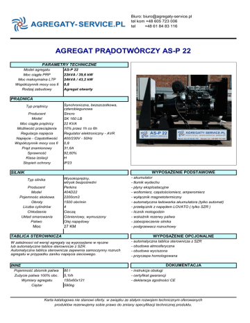 Biuro: [email protected] tel kom +48 605 723 006 tel +48 61 84 83 116 AGREGAT PRĄDOTWÓRCZY AS-P 22 PARAMETRY TECHNICZNE Model agregatu Moc ciągła PRP Moc maksymalna LTP Współczynnik mocy cos fi Rodzaj zabudowy AS-P 22 22kVA / 39,6 kW 24kVA / 43,2 kW 0,8 Agregat otwarty PRĄDNICA Typ prądnicy Producent Model Moc ciągła prądnicy Możliwość przeciążenia Regulacja napięcia Napięcie - Częstotliwość Współczynnik mocy cos fi Prąd znamionowy Sprawność Klasa izolacji Stopień ochrony Synchroniczna, bezszczotkowa, czterobiegunowa Sincro SK 160 LB 22 KVA 10% przez 1h co 6h Regulator elektroniczny - AVR 400/230V - 50Hz 0,8 31,6A 92,60% H IP23 WYPOSAŻENIE PODSTAWOWE SILNIK Typ silnika Producent Model Pojemnośc skokowa Obroty Liczba cylindrów Chłodzenie Układ smarowania Paliwo Moc Wysokoprężny, wtrysk bezpośredni Perkins 404D22 2200cm3 1500 obr/min 4 Cieczą Ciśnieniowy, wymuszony Olej napędowy 27 KM - akumulator - tłumik wydechu - płyny eksploatacyjne - woltomierz, częstościomierz, amperomierz - wyłącznik magnetotermiczny - automatyczna ładowarka akumulatora (tylko automat) - przełącznik z napędem LOVATO ( tylko SZR ) - licznik motogodzin - wskaźnik rezerwy paliwa - zabezpieczenie silnika - podgrzewacz rozruchowy WYPOSAŻENIE OPCJONALNE TABLICA STEROWNICZA W zależnosci od wersji agregaty są wyposażane w ręczne lub automatyczne tablice sterownicze z SZR. Automatyczna tablica sterownicza zapewnia samoczynny rozruch agregatu w przypadku zaniku napięcia sieciowego. - automatyczna tablica sterownicza z SZR - obudowa atmosferyczna - obudowa wyciszona - przyczepa homologowana DOKUMENTACJA INNE Pojemność zbiornik paliwa Zużycie paliwa 100% obc. Wymiary agregatu Ciężar 80 l 5,1l/h 150x60x121 590kg - instrukcja obsługi - certyfikat gwarancji - deklaracja zgodności CE Karta katalogowa nie stanowi oferty. w związku ze stałym rozwojem technicznym oferowanych produktów rezerwujemy sobie prawo do zmiany specyfikacji technicznej produktu.