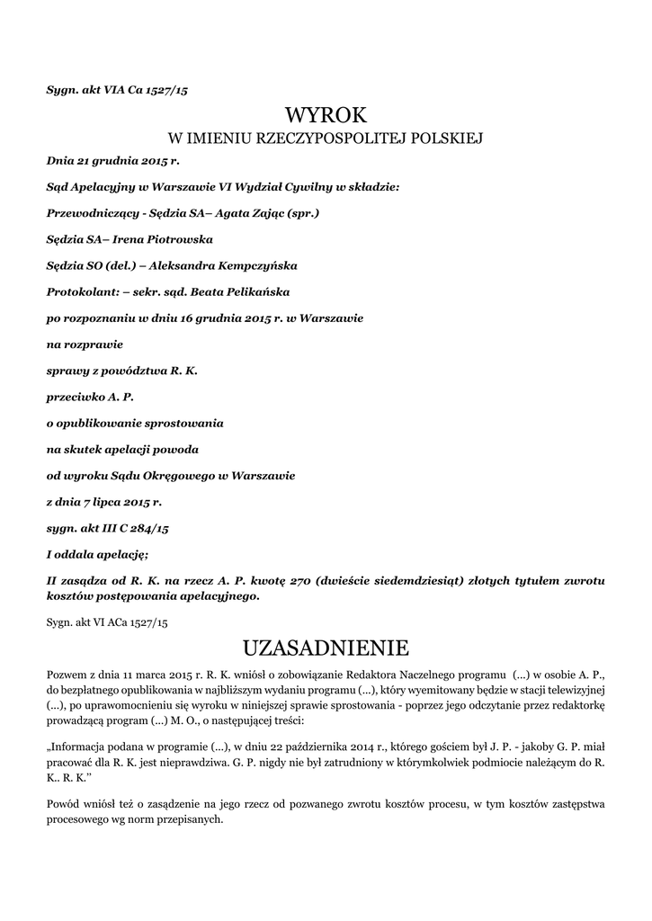 Sygn. akt VIA Ca 1527/15 WYROK W IMIENIU RZECZYPOSPOLITEJ POLSKIEJ Dnia 21 grudnia 2015 r. Sąd Apelacyjny w Warszawie VI Wydział Cywilny w składzie: Przewodniczący - Sędzia SA– Agata Zając (spr.) Sędzia SA– Irena Piotrowska Sędzia SO (del.) – Aleksandra Kempczyńska Protokolant: – sekr. sąd. Beata Pelikańska po rozpoznaniu w dniu 16 grudnia 2015 r. w Warszawie na rozprawie sprawy z powództwa R. K. przeciwko A. P. o opublikowanie sprostowania na skutek apelacji powoda od wyroku Sądu Okręgowego w Warszawie z dnia 7 lipca 2015 r. sygn. akt III C 284/15 I oddala apelację; II zasądza od R. K. na rzecz A. P. kwotę 270 (dwieście siedemdziesiąt) złotych tytułem zwrotu kosztów postępowania apelacyjnego. Sygn. akt VI ACa 1527/15 UZASADNIENIE Pozwem z dnia 11 marca 2015 r. R. K. wniósł o zobowiązanie Redaktora Naczelnego programu (...) w osobie A. P., do bezpłatnego opublikowania w najbliższym wydaniu programu (...), który wyemitowany będzie w stacji telewizyjnej (...), po uprawomocnieniu się wyroku w niniejszej sprawie sprostowania - poprzez jego odczytanie przez redaktorkę prowadzącą program (...) M. O., o następującej treści: „Informacja podana w programie (...), w dniu 22 października 2014 r., którego gościem był J. P. - jakoby G. P. miał pracować dla R. K. jest nieprawdziwa. G. P. nigdy nie był zatrudniony w którymkolwiek podmiocie należącym do R. K.. R. K.’’ Powód wniósł też o zasądzenie na jego rzecz od pozwanego zwrotu kosztów procesu, w tym kosztów zastępstwa procesowego wg norm przepisanych. W odpowiedzi na pozew A. P. wniósł o oddalenie powództwa w całości i zasądzenie od powoda na jego rzecz kosztów zastępstwa procesowego wg norm przepisanych. Wyrokiem z dnia 7 lipca 2015 r. Sąd Okręgowy oddalił powództwo i zasądził od powoda na rzecz pozwanego kwotę 360 zł tytułem zwrotu kosztów zastępstwa procesowego. Sąd Okręgowy dokonał następujących ustaleń faktycznych: W dniu 22 października 2014 roku w stacji telewizyjnej (...), której redaktorem naczelnym jest A. P., wyemitowano program pt. (...) prowadzony przez M. O.. Gościem tego odcinka programu był poseł na Sejm RP-J. P., przewodniczący partii politycznej (...). W mniejszej audycji padły słowa: M.O.(...) J.P.: (...) M.O.: (...) J.P.: (...) M.O.: (...) J.P.: (...) M.O.: (...) J.P.:… (...). Pismem z dnia 03 listopada 2014 roku, zaadresowanym do Pana A. S. Stacji (...) powód działając przez swojego pełnomocnika wniósł o opublikowanie tekstu sprostowania. Równolegle pismo z żądaniem sprostowania zostało skierowane do M. O.. Pismo zostało nadane w dniu 03 listopada 2014 r. i pozwany otrzymał je w dniu 10 listopada 2014 r. Pismem z dnia 13 listopada 2014 roku, pozwany poinformował o odmowie zamieszczenia sprostowania, wskazując przyczyny tej decyzji. W odpowiedzi na to stanowisko powód pismem z dnia 26 listopada 2014 roku skierowanym do M. S. - zastępcy redaktora naczelnego (...) zmodyfikował sprostowanie, którego żądał opublikowania na następującą treść: „Informacja podana w programie (...), w dniu 22 października 2014 r., którego gościem był J. P. - jakoby G. P. miał pracować dla R. K. jest nieprawdziwa. G. P. nigdy nie był zatrudniony w którymkolwiek podmiocie należącym do R. K.. R. K.’’. Pozwany pismem z dnia 8 grudnia 2014 roku ponownie odmówił opublikowania zmodyfikowanej treści sprostowania, podając motywy swojej decyzji. W tak ustalonym stanie faktycznym Sąd Okręgowy uznał, że powództwo jako niezasadne podlega oddaleniu. Sąd Okręgowy przytoczył treść art. 31a ust. 3 i art. 33 pkt 1 ustawy z dnia 26 stycznia 1984 r. prawo prasowe (Dz. U. z 1984 r. Nr 5 poz. 24 z późn. zm.) podnosząc, że istotą wystąpienia ze sprostowaniem jest przedstawienie własnego subiektywnego stanowiska, nie zaś ustalenie prawdy obiektywnej. W ocenie Sądu Okręgowego, skoro sprostowanie ma na celu przedstawienie własnej opinii i musi jedynie spełniać wymogi określone w art. 31a oraz art.32 prawa prasowego, pozwany winien dokonać jego publikacji, nie bacząc na to, czy odpowiada ono prawdzie obiektywnej. W przypadku zaś, gdyby redaktor naczelny doszedł do przekonania, że treść sprostowania narusza w/w przepis - winien podjąć czynności określone w art. 33 ustawy prawo prasowe. Z uwagi na powyższe Sąd Okręgowy uznał, że w przedmiotowej sprawie brak było podstaw do badania, czy z obiektywnego punktu widzenia informacje zawarte w przedmiotowej audycji były prawdziwe, przytaczając stanowisko Sądu Najwyższego wyrażone w wyroku z dnia 16 grudnia 2009 r. I CSK 151/09. Sąd Okręgowy uznał, że powód miał legitymację czynną do wystąpienia z niniejszym pozwem, gdyż audycja i słowa redaktor M. O. w sposób jednoznaczny dotyczyły osoby powoda oraz niewątpliwie u przeciętnego odbiorcy tej audycji powiązały nazwisko powoda z osobą zatrudniającą G. P.. Zdaniem Sądu Okręgowego także pozwany posiada legitymację bierną w niniejszej sprawie jako redaktor naczelny (...), do którego były kierowane wnioski o opublikowanie sprostowania. Zdaniem Sądu Okręgowego błędne nazwanie redaktora naczelnego –szefem stacji (...) nie spowodowało, że A. P. utracił legitymację bierną do występowania w niniejszej sprawie jako pozwany. Sąd Okręgowy wskazał, że zgodnie z art. 31a ust. 3 prawa prasowego tekst sprostowania musi być sporządzony na piśmie, w formie papierowej i nadany w „placówce pocztowej operatora pocztowego" lub złożony bezpośrednio w siedzibie odpowiedniej redakcji, w terminie 21 dni od dnia opublikowania materiału prasowego będącego przedmiotem sprostowania. W ocenie Sądu Okręgowego powód złożył wniosek o sprostowanie w terminie określonym przepisami ustawy, tj. w terminie 21 dni. Audycja, w której padły słowa, których sprostowania żądał, została wyemitowana w dniu 24 października 2014 r., zaś wniosek został nadany 03 listopada 2014 r