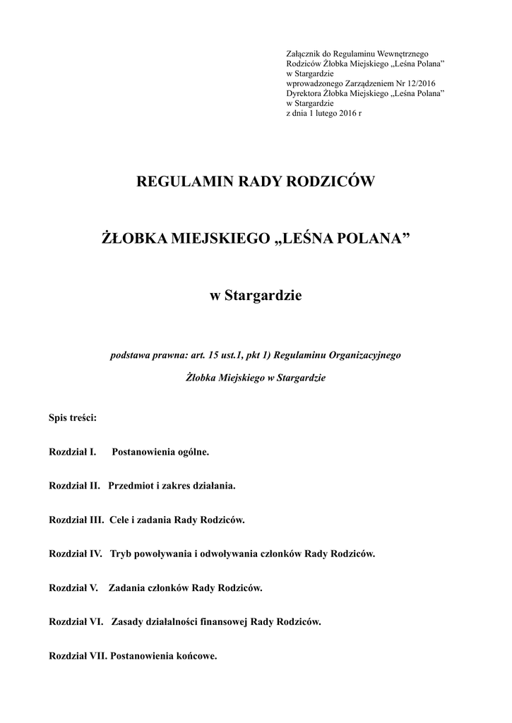 Załącznik do Regulaminu Wewnętrznego Rodziców Żłobka Miejskiego „Leśna Polana” w Stargardzie wprowadzonego Zarządzeniem Nr 12/2016 Dyrektora Żłobka Miejskiego „Leśna Polana” w Stargardzie z dnia 1 lutego 2016 r REGULAMIN RADY RODZICÓW ŻŁOBKA MIEJSKIEGO „LEŚNA POLANA” w Stargardzie podstawa prawna: art. 15 ust.1, pkt 1) Regulaminu Organizacyjnego Żłobka Miejskiego w Stargardzie Spis treści: Rozdział I. Postanowienia ogólne. Rozdział II. Przedmiot i zakres działania. Rozdział III. Cele i zadania Rady Rodziców. Rozdział IV. Tryb powoływania i odwoływania członków Rady Rodziców. Rozdział V. Zadania członków Rady Rodziców. Rozdział VI. Zasady działalności finansowej Rady Rodziców. Rozdział VII. Postanowienia końcowe. Rozdział I. Postanowienia ogólne. §1 1. Rada Rodziców jest społecznym organem działającym na terenie Żłobka Miejskiego „Leśna Polana” w Stargardzie na podstawie Regulaminu Organizacyjnego Żłobka Miejskiego „Leśna Polana” w Stargardzie, wprowadzonego Zarządzeniem Dyrektora Żłobka. Stanowi reprezentację Rodziców dzieci uczęszczających do Żłobka Miejskiego „Leśna Polana” w Stargardzie. 2. Ilekroć w dalszej części Regulaminu jest mowa o: 1) Żłobku – należy przez to rozumieć Żłobek Miejski „Leśna Polana” w Stargardzie; 2) Radzie Rodziców – należy przez to rozumieć Radę Rodziców Żłobka Miejskiego „Leśna Polana” w Stargardzie; 3) Rodzicach – należy przez to rozumieć także opiekunów prawnych oraz inne osoby, którym sąd powierzył sprawowanie opieki nad dzieckiem; 4) Dyrektorze – należy przez to rozumieć Dyrektora Żłobka Miejskiego „Leśna Polana” w Stargardzie. 3. Regulamin Wewnętrzny Rady Rodziców Żłobka Miejskiego „Leśna Polana” w Stargardzie, zwany dalej „Regulaminem”, określa organizację pracy Rady Rodziców Żłobka. 4. Postanowienia Regulaminu Rady Rodziców Żłobka określają w szczególności: 1) przedmiot, cele i zadania Rady Rodziców; 2) zasady funkcjonowania Żłobka; 3) tryb powoływania i odwoływania Rady Rodziców; 4) zadania członków Rady Rodziców Żłobka; 5) zasady działalności finansowej Rady Rodziców Żłobka. Rozdział II. Przedmiot i zakres działania. §2 1. Rada Rodziców działa w oparciu o regulamin zatwierdzony przez Dyrektora i podany do wiadomości Rodziców na pierwszym zebraniu ogólnym. 2. Rada Rodziców jest przedstawicielem Rodziców w zakresie współpracy z Dyrektorem i organem prowadzącym placówkę. Rozdział III. Cele i zadania Rady Rodziców. §3 1. Celem Rady Rodziców jest współdziałanie ze Żłobkiem w zakresie jednolitego oddziaływania na dzieci przez rodzinę i Żłobek w procesie opiekuńczym, wychowawczym i edukacyjnym. 2. Zadaniem Rady Rodziców jest: 1) uczestniczenie w życiu Żłobka - zgodnie z rocznym planem pracy – przyczyniając się do ciągłego podnoszenia jakości pracy placówki i zaspakajania potrzeb dzieci; 2) prezentowanie wobec Dyrektora opinii Rodziców we wszystkich istotnych sprawach dotyczących Żłobka; 3) przekazywanie Rodzicom dzieci uczęszczających do Żłobka informacji o udzielanej pomocy na rzecz placówki oraz działalności finansowej Rady Rodziców. Rozdział IV. Tryb powoływania i odwoływania członków Rady Rodziców. §4 1. Członkowie Rady Rodziców powoływani są na pierwszym zebraniu ogólnym Rodziców na okres jednego roku, po trzech przedstawicieli z każdej grupy dzieci. Rada Rodziców składa się z: 2. 3. 1) przewodniczącego; 2) zastępcy przewodniczącego; 3) skarbnika; 4) sekretarza; 5) członków. Działalnością Rady Rodziców kieruje Przewodniczący. 4. Osoby wymienione w ust. 2 wybierane są spośród członków Rady Rodziców na pierwszym posiedzeniu. 5. Wybór nowych członków Rady Rodziców w ciągu roku szkolnego może odbywać się na zasadzie: 1) indywidualnego zgłoszenia osoby zainteresowanej uczestniczeniem w w pracach Rady Rodziców; 2) propozycji członków Rady Rodziców, Rodziców, bądź Dyrektora. 6. Odstąpienie od udziału w działalności Rady Rodziców może nastąpić w drodze: 1) złożenia rezygnacji; 2) odwołania na wniosek Rodziców lub członków Rady Rodziców po uprzednim przegłosowaniu zwykłą większością głosów. Rozdział V. Zadania członków Rady Rodziców. §5 1. Przewodniczący Rady Rodziców ma za zadanie: 1) kierowanie całokształtem prac Rady Rodziców, poprzez zwoływanie, otwieranie, prowadzenie i zamykanie posiedzeń; 2) opracowanie projektu planu pracy wraz z planem finansowym na dany rok (od września br. do sierpnia następnego roku) z uwzględnieniem zadań wynikających z rocznego planu pracy Żłobka; 3) współdziałanie ze wszystkimi członkami Rady Rodziców, włączanie ich do realizacji planu pracy; 4) zwoływanie i prowadzenie zebrań Rady Rodziców; 5) kierowanie działalnością finansową Rady Rodziców; 6) przekazywanie Dyrektorowi opinii i postulatów Rady Rodziców dotyczących działalności Żłobka. 2. Zadania skarbnika: 1) czuwanie nad realizacją planu finansowego i prawidłowym oraz celowym gospodarowaniem funduszami Rady Rodziców; 2) dokonywanie okresowo kontroli dokumentów finansowych i stanu gotówki w kasie Rady Rodziców; 3) składanie okresowego sprawozdania z działalności finansowej Rady Rodziców. 3. Zadania sekretarza: 1) protokołowanie posiedzeń Rady Rodziców; 2) załatwianie spraw administracyjnych związanych z działalnością rady. Rozdział VI. Zasady działalności finansowej Rady Rodziców. §6 1. Fundusze Rady Rodziców powstają ze składek rodziców, z wpłat osób fizycznych i prawnych. 2. Propozycje wysokości składki, termin wpłacania oraz chęć jej wnoszenia przez każdego Rodzica na rzecz Rady Rodziców, ustalana jest po uprzednim przegłosowaniu zwykłą większością głosów na zebraniu ogólnym Rodziców. 3. Składkę na Radę Rodziców należy wpłacić do 15 listopada każdego roku. 4. Rodzice mogą też wpłac