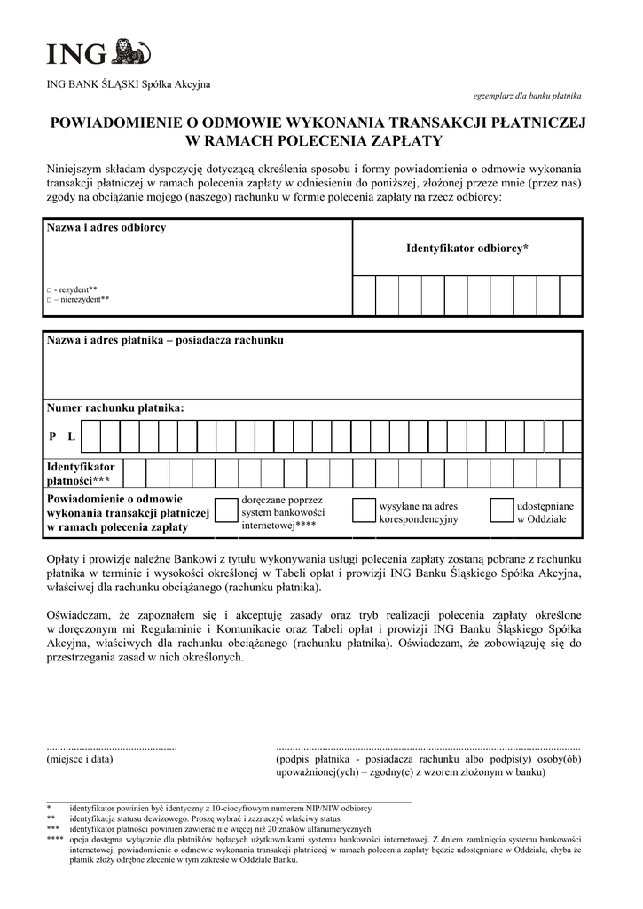 ING BANK ŚLĄSKI Spółka Akcyjna egzemplarz dla banku płatnika POWIADOMIENIE O ODMOWIE WYKONANIA TRANSAKCJI PŁATNICZEJ W RAMACH POLECENIA ZAPŁATY Niniejszym składam dyspozycję dotyczącą określenia sposobu i formy powiadomienia o odmowie wykonania transakcji płatniczej w ramach polecenia zapłaty w odniesieniu do poniższej, złożonej przeze mnie (przez nas) zgody na obciążanie mojego (naszego) rachunku w formie polecenia zapłaty na rzecz odbiorcy: Nazwa i adres odbiorcy Identyfikator odbiorcy* □ - rezydent** □ – nierezydent** Nazwa i adres płatnika – posiadacza rachunku Numer rachunku płatnika: P L Identyfikator płatności*** Powiadomienie o odmowie wykonania transakcji płatniczej w ramach polecenia zapłaty doręczane poprzez system bankowości internetowej**** wysyłane na adres korespondencyjny udostępniane w Oddziale Opłaty i prowizje należne Bankowi z tytułu wykonywania usługi polecenia zapłaty zostaną pobrane z rachunku płatnika w terminie i wysokości określonej w Tabeli opłat i prowizji ING Banku Śląskiego Spółka Akcyjna, właściwej dla rachunku obciążanego (rachunku płatnika). Oświadczam, że zapoznałem się i akceptuję zasady oraz tryb realizacji polecenia zapłaty określone w doręczonym mi Regulaminie i Komunikacie oraz Tabeli opłat i prowizji ING Banku Śląskiego Spółka Akcyjna, właściwych dla rachunku obciążanego (rachunku płatnika). Oświadczam, że zobowiązuję się do przestrzegania zasad w nich określonych. ................................................ (miejsce i data) ................................................................................................................ (podpis płatnika - posiadacza rachunku albo podpis(y) osoby(ób) upoważnionej(ych) – zgodny(e) z wzorem złożonym w banku) ___________________________________________________________________ * ** *** **** identyfikator powinien być identyczny z 10-ciocyfrowym numerem NIP/NIW odbiorcy identyfikacja statusu dewizowego. Proszę wybrać i zaznaczyć właściwy status identyfikator płatności powinien zawierać nie więcej niż 20 znaków alfanumerycznych opcja dostępna wyłącznie dla płatników będących użytkownikami systemu bankowości internetowej. Z dniem zamknięcia systemu bankowości internetowej, powiadomienie o odmowie wykonania transakcji płatniczej w ramach polecenia zapłaty będzie udostępniane w Oddziale, chyba że płatnik złoży odrębne zlecenie w tym zakresie w Oddziale Banku.