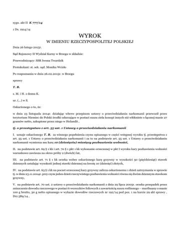 sygn. akt II K 777/14 1 Ds. 1914/14 WYROK W IMIENIU RZECZYPOSPOLITEJ POLSKIEJ Dnia 26 lutego 2015r. Sąd Rejonowy II Wydział Karny w Brzegu w składzie: Przewodniczący: SSR Iwona Twardzik Protokolant: st. sek. sąd. Monika Wcisło Po rozpoznaniu w dniu 26.02.2015r. w Brzegu sprawy T. B. s. M. i H. z domu K. ur. (...) w S. Oskarżonego o to, że: w dniu 23 listopada 2014r. działając wbrew przepisom ustawy o przeciwdziałaniu narkomanii przewoził przez terytorium Niemiec do Polski środki odurzające w postaci suszu ziela konopi innych niż włókniste o łącznej masie 27 gramów netto, zakupione przez niego w Holandii , tj. o przestępstwo z art. 55 ust. 1 Ustawy o przeciwdziałaniu narkomanii I. uznaje oskarżonego T. B. za winnego popełnienia czynu opisanego w części wstępnej wyroku tj. przestępstwa z art. 55 ust. 1 Ustawy o przeciwdziałaniu narkomanii i za to na podstawie art. 55 ust. 1 Ustawy o przeciwdziałaniu narkomanii wymierza mu karę 10 (dziesięciu) miesięcy pozbawienia wolności, II. na podstawie art. 69 § 1 kk i art. 70 § 1 pkt 1 kk wykonanie orzeczonej w pkt I wyroku kary pozbawienia wolności warunkowo zawiesza na okres próby 2 (dwóch) lat, III. na podstawie art. 71 § 1 kk orzeka wobec oskarżonego karę grzywny w wysokości 50 (pięćdziesiąt) stawek dziennych ustalając wysokość jednej stawki dziennej na kwotę 10 (dziesięć) złotych, IV. na podstawie art. 63 § 1 kk na poczet orzeczonej kary grzywny zalicza oskarżonemu 1 dzień zatrzymania w sprawie tj. w dniu 23.11.2014r. przy czym jeden dzień rzeczywistego pozbawienia wolności równa się dwóm dziennym stawkom grzywny, V. na podstawie art. 70 ust. 2 ustawy o przeciwdziałaniu narkomanii z dnia 29 lipca 2005r. orzeka przepadek przez zniszczenie dowodu rzeczowego w postaci 6 woreczków foliowych z zawartością suszu roślinnego – marihuany o masie 100 g brutto, 30 g netto opisanego w wykazie dowodów rzeczowych nr 192/14 pod poz. 1 na karcie 29 akt sprawy , Drz 589/14 , VI. na podstawie art. 627 k.p.k. i art. 3 ust. 2 Ustawy z dnia 23.06.1973 r. o opłatach w sprawach karnych zasądza od oskarżonego na rzecz Skarbu Państwa kwotę 1.132,40 zł ( jeden tysiąc sto trzydzieści dwa złote, 40/100) tytułem zwrotu kosztów procesu i opłatę w wysokości 230 zł ( dwieście trzydzieści złotych). sygn. akt II K 777/14 UZASADNIENIE T. B. został oskarżony o to,że w dniu 23 listopada 2014r. działając wbrew przepisom ustawy o przeciwdziałaniu narkomanii przewoził przez terytorium Niemiec do Polski środki odurzające w postaci suszu ziela konopi innych niż włókniste o łącznej masie 27 gramów netto, zakupione przez niego w Holandii , tj. o przestępstwo z art. 55 ust. 1 Ustawy o przeciwdziałaniu narkomanii Sąd Rejonowy ustalił następujący stan faktyczny : Dnia 23.11.2014 oskarżony T. B. wracał z Holandii, gdzie przebywał przez ok 7 tygodni w celach zarobkowych . Dzień wcześniej oskarżony nabył na terenie Holandii za kwotę ok 100 Euro ok 30 gram, marihuany na własne potrzeby , gdyż korzysta z niej w czasie gdy ma bóle kręgosłupowe . Podróż powrotną do Polski oskarżony odbywał samochodem m-ki O. (...) nr rej. (...) jako pasażer międzynarodowego przewoźnika osób firmy (...). Podczas postoju na M. W. na drodze (...) została przeprowadzona kontrola przez funkcjonariuszy Izby Celnej z O. Wydział Zwalczania Przestępczości –Referat Grup Mobilnych , w trakcie której pies służbowy G. wskazał na jedną z toreb , w której mogłyby znajdować się narkotyki . W tym czasie oskarżony podszedł do ogrodzenia parkingu i próbował wyrzucić posiadany przy sobie pakunek .Funkcjonariusze widząc to dokonali kontroli oskarżonego znajdując u niego zawiniątko obklejone taśmą i folią aluminiową . Zawartość tego pakunku znajdująca się w woreczku strunowym została poddana badaniu na miejscu z wynikiem wskazującym ,że jego zawartość może być narkotykiem o nazwie marihuana. Waga zatrzymanej substancji wynosiła 30 gram netto D o w ó d :wyjaśnienia oskarżonego –k. 13-14 protokół użycia narkotesteru i przeważenia –k. 3,4-5 protokół przeszukania – 6-8 Oskarżony został zatrzymany i po przesłuchaniu tego samego dnia zwolniony . Oskarżony jest żonaty , jest górnikiem zamieszkuje w S. , dochód miesięczny ma w wysokości ok. 1000 zł, ma dziecko w wieku lat 13 będącą niepełnosprawną z uwagi na skrzywienie kręgosłupa. Był karany z art. 298§1 kk wyrokiem SR w D. 23.02.2007 D o w ó d : wyjaśnienia oskarżonego k. 13-14 dane z K. –k. 22 Oskarżony T. B. przyznał się w całości do popełnienia zarzucanego mu przestępstwa wyjaśniając okoliczności poprzedzające kontrolę oraz okoliczności ,w jakich spożył nabył narkotyki , tłumacząc to wolą samodzielnego korzystania z narkotyków w czasie gdy pojawiają się u niego bóle kręgosłupa . D o w ó d : wyjaśnienia oskarżonego k. 13-14 Sąd Rejonowy zważył, co następuje : W toku przeprowadzonego postępowania dowodowego wykazane zostało, że oskarżony dnia 23.11.2014 przewoził z Holandii przez terytorium Niemiec do Polski . środki odurzające w postaci suszu ziela konopi innych niż włókniste , o łącznej masie 27 gramów netto . Okoliczności powyższe Sąd ustalił głównie w oparciu o wyjaśnienia samego oskarżonego przyznającego się do winy oraz o treść protokołu użycia urządzenia pomiarowego typu narkotest . Jego wynik nie był przez oskarżonego kwestionowany. Sąd dał wiarę wyjaśnieniom oskarżonego, albowiem były one spójne , logiczne i nie wzbudziły wątpliwości Sądu co do ich wiarygodności, a przyznanie się do winy Sąd potraktował jako szczere. Dlatego też Sąd przyjął wyjaśnienia oskarżonego jako podstawę ustalenia okoliczności faktycznych związanych z popełnionym czynem . Po uznaniu sprawstwa oskarżonego sąd orzekając co do kary uwzględnił wniosek oskarżyciela złożony wraz z aktem oskarżenia o orzeczenie wobec 