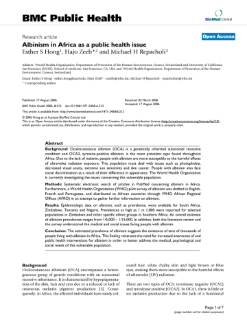 BMC Public Health BioMed Central Open Access Research article Albinism in Africa as a public health issue Esther S Hong1, Hajo Zeeb*2 and Michael H Repacholi2 Address: 1World Health Organization, Department of Protection of the Human Environment, Geneva, Switzerland and University of California, San Francisco (UCSF), School of Medicine, San Francisco, CA, USA and 2World Health Organization, Department of Protection of the Human Environment, Geneva, Switzerland Email: Esther S Hong - [email protected]; Hajo Zeeb* - [email protected]; Michael H Repacholi - [email protected] * Corresponding author Published: 17 August 2006 BMC Public Health 2006, 6:212 doi:10.1186/1471-2458-6-212 Received: 03 March 2006 Accepted: 17 August 2006 This article is available from: http://www.biomedcentral.com/1471-2458/6/212 © 2006 Hong et al; licensee BioMed Central Ltd. This is an Open Access article distributed under the terms of the Creative Commons Attribution License (http://creativecommons.org/licenses/by/2.0), which permits unrestricted use, distribution, and reproduction in any medium, provided the original work is properly cited. Abstract Background: Oculocutaneous albinism (OCA) is a genetically inherited autosomal recessive condition and OCA2, tyrosine-positive albinism, is the most prevalent type found throughout Africa. Due to the lack of melanin, people with albinism are more susceptible to the harmful effects of ultraviolet radiation exposure. This population must deal with issues such as photophobia, decreased visual acuity, extreme sun sensitivity and skin cancer. People with albinism also face social discrimination as a result of their difference in appearance. The World Health Organization is currently investigating the issues concerning this vulnerable population. Methods: Systematic electronic search of articles in PubMed concerning albinism in Africa. Furthermore, a World Health Organization (WHO) pilot survey of albinism was drafted in English, French and Portuguese, and distributed to African countries through WHO African Regional Offices (AFRO) in an attempt to gather further information on albinism. Results: Epidemiologic data on albinism, such as prevalence, were available for South Africa, Zimbabwe, Tanzania and Nigeria. Prevalences as high as 1 in 1,000 were reported for selected populations in Zimbabwe and other specific ethnic groups in Southern Africa. An overall estimate of albinism prevalences ranges from 1/5,000 – 1/15,000. In addition, both the literature review and the survey underscored the medical and social issues facing people with albinism. Conclusion: The estimated prevalence of albinism suggests the existence of tens of thousands of people living with albinism in Africa. This finding reiterates the need for increased awareness of and public health interventions for albinism in order to better address the medical, psychological and social needs of this vulnerable population. Background Oculocutaneous albinism (OCA) encompasses a heterogeneous group of genetic conditions with an autosomal recessive inheritance. It is characterized by hypopigmentation of the skin, hair and eyes due to a reduced or lack of cutaneous melanin pigment production [1]. Consequently, in Africa, the affected individuals have sandy col- oured hair, white chalky skin and light brown or blue eyes, making them more susceptible to the harmful effects of ultraviolet (UV) radiation. There are two types of OCA: tyrosinase negative (OCA1) and tyrosinase positive (OCA2). In OCA1, there is little or no melanin production due to the lack of a functional Page 1 of 7 (page number not for citation purposes) BMC Public Health 2006, 6:212 tyrosinase, the critical enzyme required in the melanin biosynthetic pathway. In the more prevalent OCA2 type [1] there is some level of tyrosinase activity, thereby producing some red-yellow photomelanin pigment that gives rise to sandy coloured hair and light brown irises [1]. There is growing evidence of social discrimination and stigmatization directed towards this population [4,5]. Along with their differences in appearance, a lack of knowledge about albinism in the community leads to such stigma. For example, the etiological beliefs about albinism continue to be heavily influenced by culture and superstition, rather than genetics [6]. The goal of this review is to discuss the current knowledge on public health aspects of albinism in Africa, focusing on the epidemiology as well as medical and social issues. We also recommend further actions to alleviate this situation for the affected populations and countries. As a basis for the review we conducted a systematic literature search on albinism in Africa and conducted a survey among African WHO Member States. Methods Identification of publications We conducted a literature search using PubMed with no date or language limitations. The search was conducted from June to July of 2005. The key terms used in this first set of searches included: albinism, albino(s), Africa, epidemiology, population study, prevalence, health, cancer, social and psychological. Inclusion and exclusion criteria References which were not peer reviewed, did not specifically relate to Africa and/or albinism, were duplicates or focused only on basic scientific aspects of albinism, were excluded. For a small number of articles, only the abstracts were included because the full texts were unavailable. After reviewing the remaining abstracts and full texts of our first search, we only found pertinent information for the following countries: South Africa, Zimbabwe, Tanzania, Nigeria. Therefore, we extended the search in a country-specific manner and used key words including the countries listed above, along with the term "albinism". Efforts were made to contact some of the authors who study and had published articles concerning Albinism in Africa. Additionally, a manual search of reference lists was conducted but no additional useful references were identifi