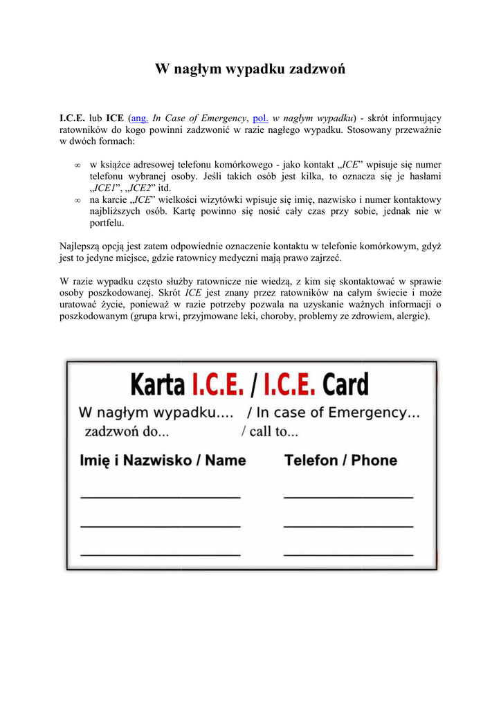 W nagłym wypadku zadzwoń zadzwo Emergency pol. w nagłym wypadku) - skrót informujący I.C.E. lub ICE (ang. In Case of Emergency, ratowników do kogo powinni zadzwonić zadzwoni w razie nagłego wypadku. Stosowany przeważnie przewa w dwóch formach: • • w książce ce adresowej telefonu komórkowego - jako kontakt „ICE”” wpisuje się si numer telefonu wybranej osoby. Jeśli Je takich osób jest kilka,, to oznacza się si je hasłami „ICE1”, „ICE2” itd. na karcie „ICE”” wielkości wielkoś wizytówki wpisuje się imię,, nazwisko i numer kontaktowy najbliższych szych osób. Kartę powinno się nosić cały czas przy sobie, jednak nie w portfelu. Najlepszą opcją jest zatem odpowiednie oznaczenie kontaktu w telefonie komórkowym, gdyż gdy jest to jedyne miejsce, gdzie ratownicy medyczni mają maj prawo zajrzeć. W razie wypadku często ęsto służby służ ratownicze nie wiedzą, z kim sięę skontaktować skontaktowa w sprawie osoby poszkodowanej. Skrót ICE jest znany przez ratowników owników na całym świecie i może uratować życie, ponieważż w razie potrzeby pozwala na uzyskanie ważnych wa waż informacji o poszkodowanym (grupa krwi, przyjmowane leki, choroby, problemy ze zdrowiem, alergie).