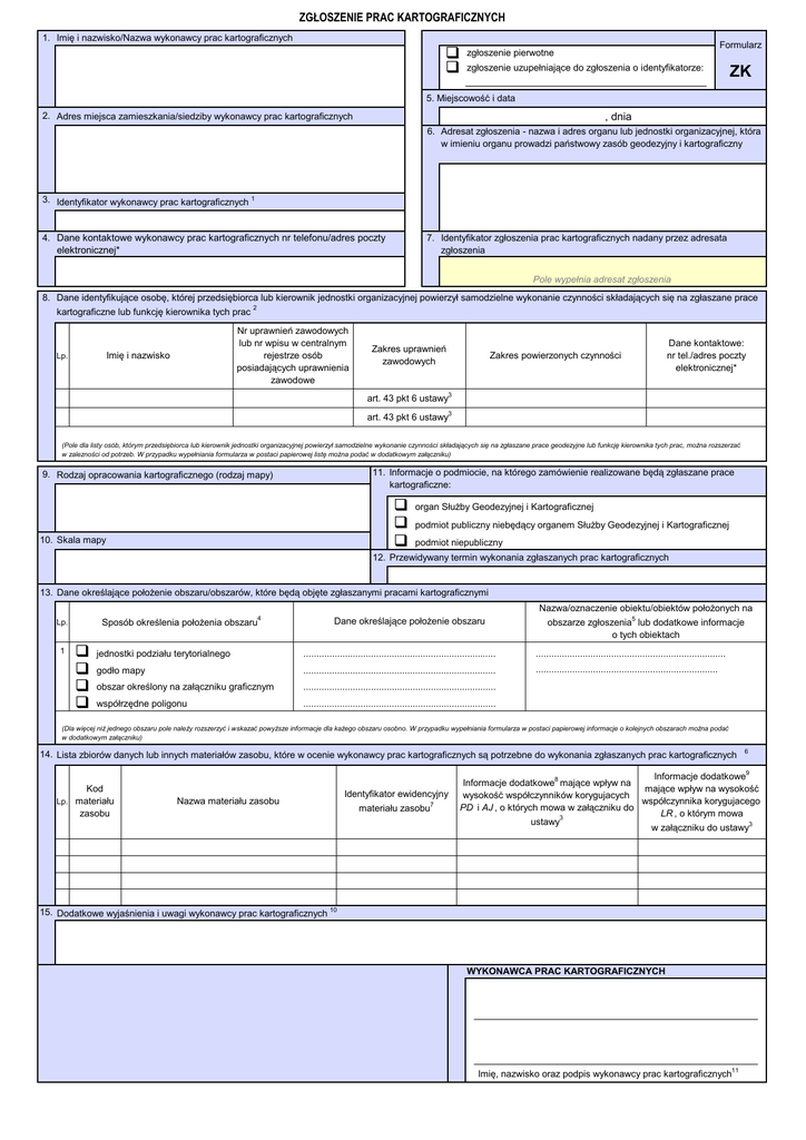 ZGŁOSZENIE PRAC KARTOGRAFICZNYCH 1. Imię i nazwisko/Nazwa wykonawcy prac kartograficznych Formularz zgłoszenie pierwotne zgłoszenie uzupełniające do zgłoszenia o identyfikatorze: ZK 5. Miejscowość i data 2. Adres miejsca zamieszkania/siedziby wykonawcy prac kartograficznych , dnia 6. Adresat zgłoszenia - nazwa i adres organu lub jednostki organizacyjnej, która w imieniu organu prowadzi państwowy zasób geodezyjny i kartograficzny 3. Identyfikator wykonawcy prac kartograficznych 1 4. Dane kontaktowe wykonawcy prac kartograficznych nr telefonu/adres poczty elektronicznej* 7. Identyfikator zgłoszenia prac kartograficznych nadany przez adresata zgłoszenia Pole wypełnia adresat zgłoszenia 8. Dane identyfikujące osobę, której przedsiębiorca lub kierownik jednostki organizacyjnej powierzył samodzielne wykonanie czynności składających się na zgłaszane prace 2 kartograficzne lub funkcję kierownika tych prac Nr uprawnień zawodowych lub nr wpisu w centralnym rejestrze osób posiadających uprawnienia zawodowe Imię i nazwisko Lp. Zakres uprawnień zawodowych Zakres powierzonych czynności Dane kontaktowe: nr tel./adres poczty elektronicznej* 3 art. 43 pkt 6 ustawy art. 43 pkt 6 ustawy3 (Pole dla listy osób, którym przedsiębiorca lub kierownik jednostki organizacyjnej powierzył samodzielne wykonanie czynności składających się na zgłaszane prace geodezyjne lub funkcję kierownika tych prac, można rozszerzać w zalezności od potrzeb. W przypadku wypełniania formularza w postaci papierowej listę można podać w dodatkowym załączniku) 11. Informacje o podmiocie, na którego zamówienie realizowane będą zgłaszane prace kartograficzne: 9. Rodzaj opracowania kartograficznego (rodzaj mapy) 10. Skala mapy organ Służby Geodezyjnej i Kartograficznej podmiot publiczny niebędący organem Służby Geodezyjnej i Kartograficznej podmiot niepubliczny 12. Przewidywany termin wykonania zgłaszanych prac kartograficznych 13. Dane określające położenie obszaru/obszarów, które będą objęte zgłaszanymi pracami kartograficznymi Sposób określenia położenia obszaru4 Lp. 1 Dane określające położenie obszaru Nazwa/oznaczenie obiektu/obiektów położonych na obszarze zgłoszenia5 lub dodatkowe informacje o tych obiektach jednostki podziału terytorialnego .......................................................................... ......................................................................... godło mapy .......................................................................... ...................................................................... obszar określony na załączniku graficznym .......................................................................... współrzędne poligonu .......................................................................... (Dla więcej niż jednego obszaru pole należy rozszerzyć i wskazać powyższe informacje dla każego obszaru osobno. W przypadku wypełniania formularza w postaci papierowej informacje o kolejnych obszarach można podać w dodatkowym załączniku) 14. Lista zbiorów danych lub innych materiałów zasobu, które w ocenie wykonawcy prac kartograficznych są potrzebne do wykonania zgłaszanych prac kartograficznych Kod Lp. materiału zasobu Nazwa materiału zasobu Identyfikator ewidencyjny materiału zasobu7 6 Informacje dodatkowe9 Informacje dodatkowe8 mające wpływ na mające wpływ na wysokość wysokość współczynników korygujacych współczynnika korygujacego PD i AJ , o których mowa w załączniku do LR , o którym mowa 3 ustawy 3 w załączniku do ustawy 15. Dodatkowe wyjaśnienia i uwagi wykonawcy prac kartograficznych 10 WYKONAWCA PRAC KARTOGRAFICZNYCH 11 Imię, nazwisko oraz podpis wykonawcy prac kartograficznych Przypisy: 1. Identyfikatorem wykonawcy jest: - w przypadku gdy wykonawcą jest przedsiębiorca lub jednostka organizacyjna - nr REGON; - w przypadku gdy wykonawcą jest biegły sądowy - nr uprawnień zawodowych lub nr wpisu w centralnym rejestrze osób posiadających uprawnienia zawodowe; - w przypadku gdy wykonawcą jest mierniczy górniczy (asystent mierniczego górniczego) - nr świadectwa wydanego przez Prezesa Wyższego Urzędu Górniczego o stwierdzeniu kwalifikacji do wykonywania czynności mierniczego górniczego; - w przypadku wykonawcy będącego podmiotem zagranicznym - nr identyfikacyjny stosowany w kraju, w którym ma siedzibę wykonawca. 2. 3. 4. 5. 6. 7. Należy wypełnić w przypadku, gdy wykonawcą zgłaszanych prac kartograficznych jest przedsiębiorca lub jednostka organizacyjna. Ustawa z dnia 17 maja 1989 r. - Prawo geodezyjne i kartograficzne (Dz. U. z 2010 r. Nr 193, poz. 1287, z późn. zm.). Należy wybrać jeden sposób określenia obszaru. Nazwa/nazwy lub oznaczenie/oznaczenia obiektu/obiektów nadane przez wykonawcę - informacja nieobowiązkowa. Kod materiału zasobu oraz nazwę materiału zasobu należy wpisać z listy stanowiącej załącznik do niniejszego wzoru. Informacja obowiązkowa w przypadku udostępniania materiałów zasobu za pomocą systemu teleinformatycznego, o którym mowa w przepisach wydanych na podstawie art. 40 ust. 8 ustawy z dnia 17 maja 1989 r. Prawo geodezyjne i kartograficzne. 8. Należy wskazać informacje mające wpływ na wysokość współczynników korygujących PD i AJ określonych w załączniku do ustawy, takie jak: wydruk czarno-bialy/kolorowy, format kopii mapy: A4/A3/A2/A1/A0, skala mapy: 1:500/1:1000/1:2000/1:5000, terenowa wielkość piksela ortofotomapy, wartość błędu średniego wysokości danych NMT, zbiór punktów osnowy pełny/bez obserwacji, minimalny okres gromadzenia satelitarnych danych obserwacyjnych dot. podstawowej osnowy geodezyjnej, zakres zbioru danych EGiB, kopia rejestru gruntów pełna/bez danych osobowych. 9. W kolumnie tej można w szczególności określić oczekiwania wykonawcy dotyczące udostępnianych materiałów, w tym szacunkowej liczby jednostek rozliczeniowych. 10. W przy