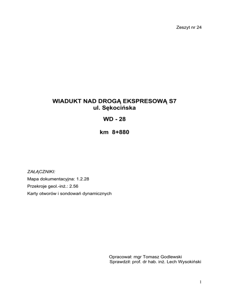 Zeszyt nr 24 WIADUKT NAD DROGĄ EKSPRESOWĄ S7 ul. Sękocińska WD - 28 km 8+880 ZAŁĄCZNIKI: Mapa dokumentacyjna: 1.2.28 Przekroje geol.-inż.: 2.56 Karty otworów i sondowań dynamicznych Opracował: mgr Tomasz Godlewski Sprawdził: prof. dr hab. inż. Lech Wysokiński 1 1. Położenie Wiadukt drogowy WD – 28 w ciągu drogi nr 721 nad projektowaną drogą ekspresową znajduje się w miejscowości Sękocin k/Warszawy, na terenie gminy Nadarzyn. Powierzchnia terenu jest płaska. Rzędne terenu wahają się od 117,70 – 117,90 m npm. Projektowana niweleta przechodzącej poprzecznie drogi wynosi 118,00 m npm. 2. Warunki geotechniczne Obiekt znajduje się na wysoczyźnie – równia sandrowa. Rozpoznania dokonano do głębokości 20 m. W podłożu zostały stwierdzone warstwy piaszczyste o genezie wodnolodowcowej i zmiennym stopniu zagęszczenia. Przeprowadzone charakterystyczne rozpoznanie parametry i badania geotechniczne pozwalają dla niżej ustalić następujące wydzielonych warstw geotechnicznych: Warstwa 12 – humus i nasypy o miąższości do 1,0 m do usunięcia. Od powierzchni występuje warstwa piasków drobnoziarnistych, średniozagęszczonych o miąższości ok. 10 m. Warstwę 1a cechują następujące parametry: Warstwa 2a – piaski drobnoziarniste: Gęstość objętościowa gruntu ρ [T/m3] Kąt tarcia wewnętrznego φ [°] Spójność c [kPa] Edometryczny moduł ściśliwości M [MPa] Współczynnik filtracji k [m/s] 1,70 30 0 80 10-3 – 10-4 Kontynuacją serii piaszczystej osadów wodnolodowcowych jest warstwa 1a, reprezentowane odpowiednio przez piaski drobne, w stanie zagęszczonym, o miąższości powyżej 10 m – nie przewiercono. Warstwa 1a, Gęstość objętościowa gruntu ρ [T/m3] Kąt tarcia wewnętrznego φ [°] Spójność c [kPa] Edometryczny moduł ściśliwości M [MPa] Współczynnik filtracji k [m/s] 1,75 30 0 100 10-3 – 10-4 2 3. Warunki wodne Woda gruntowa o swobodnym zwierciadle została nawiercona na głębokości ok. 10,5 m ppt, co odpowiada rzędnej ok. 107,5 m npm. 4. Warunki posadowienia Obiekt na wysoczyźnie, posadowienie bezpośrednie korzystne. Od powierzchni grunty piaszczyste, średniozagęszczone, zwierciadło wód poniżej dna wykopu. Posadowienia na palach wyjątkowo korzystne. W profilu praktycznie od powierzchni występują grunty piaszczyste o dużej nośności. 3