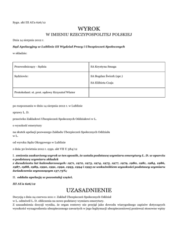 Sygn. akt III AUa 626/12 WYROK W IMIENIU RZECZYPOSPOLITEJ POLSKIEJ Dnia 14 sierpnia 2012 r. Sąd Apelacyjny w Lublinie III Wydział Pracy i Ubezpieczeń Społecznych w składzie: Przewodniczący - Sędzia SA Krystyna Smaga Sędziowie: SA Bogdan Świerk (spr.) SA Elżbieta Czaja Protokolant: st. prot. sądowy Krzysztof Wiater po rozpoznaniu w dniu 14 sierpnia 2012 r. w Lublinie sprawy L. D. przeciwko Zakładowi Ubezpieczeń Społecznych Oddziałowi w L. o wysokość emerytury na skutek apelacji pozwanego Zakładu Ubezpieczeń Społecznych Oddziału w L. od wyroku Sądu Okręgowego w Lublinie z dnia 30 kwietnia 2012 r. sygn. akt VII U 584/12 I. zmienia zaskarżony wyrok w ten sposób, że ustala podstawę wymiaru emerytury L. D. w oparciu o podstawę wymiaru składek z dwudziestu lat kalendarzowych: 1971, 1972, 1973, 1974, 1975, 1977, 1979, 1980, 1981, 1984, 1986, 1987, 1988, 1989, 1990, 1991, 1992, 1993, 1994 i 1995 ze wskaźnikiem wysokości podstawy wymiaru świadczenia wynoszącym 157,73%; II. oddala apelację w pozostałej części. III AUa 626/12 UZASADNIENIE Decyzją z dnia 24 czerwca 2011 r. Zakład Ubezpieczeń Społecznych Oddział w L. odmówił L. D. obliczenia na nowo podstawy wymiaru emerytury. Z uzasadnienia decyzji wynika, że organ rentowy nie przyjął jako dowodu wiarygodnego zapisów dotyczących wysokości wynagrodzenia ubezpieczonego zawartych w jego legitymacji ubezpieczeniowej ponieważ stosowne wpisy zostały opatrzone jedynie pieczęcią nagłówkową i brak jest imiennej pieczątki osoby dokonującej wpisu lub odpowiedzialnej za taki wpis. W odwołaniu od tej decyzji, kwestionując jej prawidłowość, L. D. podał, że w dniu 26 kwietnia 2011 r. wystąpił do pozwanego organu rentowego z wnioskiem o obliczenie postawy wymiaru jego emerytury w oparciu o podstawę wymiaru składek z 20 lat kalendarzowych wybranych z całego okresu jego zatrudnienia. Odwołujący wnosił o dokonanie takiego obliczenia w oparciu o adnotacje o jego wynagrodzeniu za lata 1970 – 1986 zawarte w legitymacji ubezpieczeniowej oraz za okres późniejszy w oparciu o zaświadczenia o zatrudnieniu i wynagrodzeniu (Rp 7) jakie były w dyspozycji organu rentowego. Po jego rozpoznaniu Sąd Okręgowy w Lublinie wyrokiem z dnia 30 kwietnia 2012 r. zmienił wskazaną na wstępie decyzję w ten sposób, że przyjął do wyliczenia podstawy wymiaru emerytury L. D. podstawę wymiaru składek z 20 lat kalendarzowych wybranych z okresu od 1969 r. do 1986 r. przy czym sąd wskazał przy każdym z tych lat wysokość podstawy wymiaru składek na ubezpieczenie społeczne. Swoje rozstrzygnięcie Sąd Okręgowy oparł na poniższych ustaleniach faktycznych oraz ich ocenie prawnej: L. D. miał ustalone prawo do renty z tytułu inwalidztwa byłej drugiej grupy inwalidów, potem z tytułu całkowitej niezdolności do pracy i ostatnio z tytułu częściowej niezdolności do pracy. Podstawa wymiaru renty została określona w oparciu o podstawę wymiaru składek na ubezpieczenie z 7 lat kalendarzowych ( 1989 - 1995) a wskaźnik podstawy wymiaru renty wyniósł 197,25%. W dniu 7 kwietnia 2011 r. L. D. wystąpił do pozwanego z wnioskiem o emeryturę. Decyzją z dnia 18 kwietnia 2011 r. pozwany ustalił wnioskodawcy prawo do emerytury od dnia 14 maja 2011 r. Podstawa wymiaru emerytury została określona w oparciu o podstawę wymiaru składek na ubezpieczenie z 10 lat kalendarzowych (1991 – 2000) przy czym za okres lat 1997 – 2000 pozwany przyjął zerową wartość tej podstawy. Wskaźnik wysokości podstawy wymiaru emerytury został obliczony na 114,58%. W dniu 26 kwietnia 2011 r. wnioskodawca złożył pozwanemu swoją legitymację ubezpieczeniową, co pozwany potraktował jako wniosek o ponowne obliczenie świadczenia i decyzją z dnia 24 czerwca 2011 r. odmówił takiego obliczenia. W toku postępowania odwoławczego od tej decyzji ubezpieczony wnosił o przeliczenie jego emerytury przy zastosowaniu podstawy wymiaru składek z okresu wykonywania przez niego zatrudnienia w Przedsiębiorstwie Budownictwa Rolniczego w L. z uwzględnieniem wysokości tych podstaw wymienionych w stosownych zapisach zawartych w jego legitymacji ubezpieczeniowej. Na podstawie dowodu z zeznań świadka Z. W. Sąd Okręgowy ustalił, że zapisy w legitymacji ubezpieczeniowej wnioskodawcy dotyczące jego wynagrodzenia za pracę we wskazanym wyżej okresie poczyniła ta świadek, która nie posiadała wtedy swojej imiennej pieczątki. Pozwany, zobowiązany przez sąd do przedstawienia stosownej symulacji w zakresie możliwości przeliczenia emerytury wnioskodawcy przy uwzględnieniu zapisów zawartych w legitymacji ubezpieczeniowej o wysokości jego wynagrodzeń za pracę, wskazał, że najkorzystniejszą możliwością jest obliczenie podstawy wymiaru emerytury z 20 lat kalendarzowych ( 1971-1975,1977, 1979-1981, 1984, 1986 i 1987-1995) wybranych z całego okresu wykonywania przez niego zatrudnienia. Wskaźnik wysokości podstawy wymiaru świadczenia wyniesie wtedy 157,73%. Wnioskodawca nie kwestionował takiego sposobu wyliczenia wysokości jego emerytury. W ocenie sądu pierwszej instancji zapisy o wysokości wynagrodzenia za pracę wnioskodawcy zawarte w jego legitymacji ubezpieczeniowej są wystarczającym dowodem w sprawie bo nie noszą one śladów podrabiania i zostały opatrzone podpisem uprawnionej do tego osoby. Dlatego dowody z tych zapisów oraz z zeznań świadka Z. W. ocenił sąd jako wiarygodne i wystarczające do rozstrzygnięcia o roszczeniu wnioskodawcy. W konsekwencji Sąd Okręgowy zmieniając decyzję pozwanego kwestionowaną przez ubezpieczonego przyjął, że podstawa wymiaru emerytury wnioskodawcy powinna zostać wyliczona w oparciu o podstawę wymiaru składek na ubezpieczenie z 20 lat kalendarzowych ( 1969, 19701986), których wysokość jest wskazana w stosownych zapisach w jego legitymacji ubezpieczeniowej ze wskaźnikiem wysokości podstawy wymiaru świadczenia wynoszącym 157,73%. Apelację od wyroku 