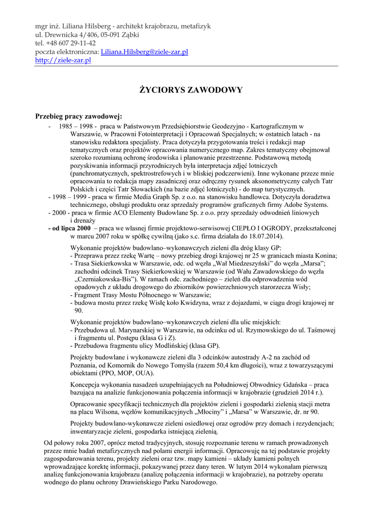 mgr inż. Liliana Hilsberg - architekt krajobrazu, metafizyk ul. Drewnicka 4/406, 05-091 Ząbki tel. +48 607 29-11-42 poczta elektroniczna: [email protected] http://ziele-zar.pl ŻYCIORYS ZAWODOWY Przebieg pracy zawodowej: - 1985 – 1998 - praca w Państwowym Przedsiębiorstwie Geodezyjno - Kartograficznym w Warszawie, w Pracowni Fotointerpretacji i Opracowań Specjalnych; w ostatnich latach - na stanowisku redaktora specjalisty. Praca dotyczyła przygotowania treści i redakcji map tematycznych oraz projektów opracowania numerycznego map. Zakres tematyczny obejmował szeroko rozumianą ochronę środowiska i planowanie przestrzenne. Podstawową metodą pozyskiwania informacji przyrodniczych była interpretacja zdjęć lotniczych (panchromatycznych, spektrostrefowych i w bliskiej podczerwieni). Inne wykonane przeze mnie opracowania to redakcja mapy zasadniczej oraz odręczny rysunek aksonometryczny całych Tatr Polskich i części Tatr Słowackich (na bazie zdjęć lotniczych) - do map turystycznych. - 1998 – 1999 - praca w firmie Media Graph Sp. z o.o. na stanowisku handlowca. Dotyczyła doradztwa technicznego, obsługi produktu oraz sprzedaży programów graficznych firmy Adobe Systems. - 2000 - praca w firmie ACO Elementy Budowlane Sp. z o.o. przy sprzedaży odwodnień liniowych i drenaży - od lipca 2000 – praca we własnej firmie projektowo-serwisowej CIEPŁO I OGRODY, przekształconej w marcu 2007 roku w spółkę cywilną (jako s.c. firma działała do 18.07.2014). Wykonanie projektów budowlano–wykonawczych zieleni dla dróg klasy GP: - Przeprawa przez rzekę Wartę – nowy przebieg drogi krajowej nr 25 w granicach miasta Konina; - Trasa Siekierkowska w Warszawie, odc. od węzła „Wał Miedzeszyński” do węzła „Marsa”; zachodni odcinek Trasy Siekierkowskiej w Warszawie (od Wału Zawadowskiego do węzła „Czerniakowska-Bis”). W ramach odc. zachodniego – zieleń dla odprowadzenia wód opadowych z układu drogowego do zbiorników powierzchniowych starorzecza Wisły; - Fragment Trasy Mostu Północnego w Warszawie; - budowa mostu przez rzekę Wisłę koło Kwidzyna, wraz z dojazdami, w ciągu drogi krajowej nr 90. Wykonanie projektów budowlano–wykonawczych zieleni dla ulic miejskich: - Przebudowa ul. Marynarskiej w Warszawie, na odcinku od ul. Rzymowskiego do ul. Taśmowej i fragmentu ul. Postępu (klasa G i Z). - Przebudowa fragmentu ulicy Modlińskiej (klasa GP). Projekty budowlane i wykonawcze zieleni dla 3 odcinków autostrady A-2 na zachód od Poznania, od Komornik do Nowego Tomyśla (razem 50,4 km długości), wraz z towarzyszącymi obiektami (PPO, MOP, OUA). Koncepcja wykonania nasadzeń uzupełniających na Południowej Obwodnicy Gdańska – praca bazująca na analizie funkcjonowania połączenia informacji w krajobrazie (grudzień 2014 r.). Opracowanie specyfikacji technicznych dla projektów zieleni i gospodarki zielenią stacji metra na placu Wilsona, węzłów komunikacyjnych „Młociny” i „Marsa” w Warszawie, dr. nr 90. Projekty budowlano-wykonawcze zieleni osiedlowej oraz ogrodów przy domach i rezydencjach; inwentaryzacje zieleni, gospodarka istniejącą zielenią. Od połowy roku 2007, oprócz metod tradycyjnych, stosuję rozpoznanie terenu w ramach prowadzonych przeze mnie badań metafizycznych nad polami energii informacji. Opracowuję na tej podstawie projekty zagospodarowania terenu, projekty zieleni oraz tzw. mapy kamieni – układy kamieni polnych wprowadzające korektę informacji, pokazywanej przez dany teren. W lutym 2014 wykonałam pierwszą analizę funkcjonowania krajobrazu (analizę połączenia informacji w krajobrazie), na potrzeby operatu wodnego do planu ochrony Drawieńskiego Parku Narodowego. mgr inż. Liliana Hilsberg - architekt krajobrazu, metafizyk ul. Drewnicka 4/406, 05-091 Ząbki tel. +48 607 29-11-42 poczta elektroniczna: [email protected] http://ziele-zar.pl Inne doświadczenia zawodowe: - Opracowanie fizjograficzne do miejscowego planu szczegółowego w zakresie zieleni i krajobrazu (dla Łuku Siekierkowskiego w Warszawie, 1987 r.); - Oceny oddziaływania na środowisko inwestycji szczególnie szkodliwych, w zakresie wpływu na krajobraz (opracowania dla linii elektroenergetycznych wysokiego napięcia - w latach 1994 i 1996); - Prowadzenie szkoleń i konsultacji w zakresie MicroStation i I/RAS B dla firm Intergraph Poland i Transprojekt Warszawa – w latach 1995-98; - Funkcjonowanie krajobrazu Drawieńskiego Parku Narodowego – analiza połączenia informacji (2014 r.); - Projektowanie ogrodów i zieleni osiedlowej (okazjonalnie od 1992 roku); - Projektowanie i układanie map kamieni (okazjonalnie od 2010). Zainteresowania zawodowe: - Projektowanie w krajobrazie otwartym; projektowanie i analizy funkcjonowania krajobrazu z uwzględnieniem metafizycznych badań krajobrazu; - Zastosowanie w projektowaniu szeroko rozumianej wiedzy przyrodniczej oraz filozoficznych badań fundamentów rzeczywistości (metafizyki). Znajomość języków obcych: - angielski - dobra; - rosyjski, hiszpański i czeski – słaba. Znajomość oprogramowania: - systemy operacyjne: DOS, Windows (NT, 95-2000, XP), CLIX, MacOS; - oprogramowanie firm Bentley i Intergraph: MicroStation v.4-v.8, I/RAS B; - programy graficzne, do składu publikacji i tworzenia dokumentów elektronicznych firmy Adobe Systems (Photoshop, Illustrator, InDesign, PageMaker, Acrobat); Studia wyższe, uprawnienia zawodowe: - 1980 - 1985 - studia w sekcji kształtowania terenów zieleni w Szkole Głównej Gospodarstwa Wiejskiego w Warszawie. Praca dyplomowa dotyczyła przyrodniczych podstaw kształtowania krajobrazu. - Styczeń 1997 - dyplom w ramach rocznego Podyplomowego Studium Planowania Przestrzennego na Wydziale Architektury Politechniki Warszawskiej. ► Posiadam uprawnienia zawodowe geodezyjne w zakresie redakcji map (nie wykorzystywane).