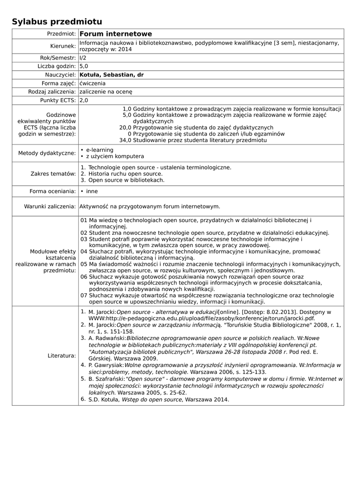 Sylabus przedmiotu Przedmiot: Forum internetowe Informacja naukowa i bibliotekoznawstwo, podyplomowe kwalifikacyjne [3 sem], niestacjonarny, Kierunek: rozpoczęty w: 2014 Rok/Semestr: I/2 Liczba godzin: 5,0 Nauczyciel: Kotuła, Sebastian, dr Forma zajęć: ćwiczenia Rodzaj zaliczenia: zaliczenie na ocenę Punkty ECTS: 2,0 1,0 Godziny kontaktowe z prowadzącym zajęcia realizowane w formie konsultacji 5,0 Godziny kontaktowe z prowadzącym zajęcia realizowane w formie zajęć dydaktycznych 20,0 Przygotowanie się studenta do zajęć dydaktycznych 0 Przygotowanie się studenta do zaliczeń i/lub egzaminów 34,0 Studiowanie przez studenta literatury przedmiotu Godzinowe ekwiwalenty punktów ECTS (łączna liczba godzin w semestrze): Metody dydaktyczne: • e-learning • z użyciem komputera 1. Technologie open source - ustalenia terminologiczne. Zakres tematów: 2. Historia ruchu open source. 3. Open source w bibliotekach. Forma oceniania: • inne Warunki zaliczenia: Aktywność na przygotowanym forum internetowym. Modułowe efekty kształcenia realizowane w ramach przedmiotu: 01 Ma wiedzę o technologiach open source, przydatnych w działalności bibliotecznej i informacyjnej. 02 Student zna nowoczesne technologie open source, przydatne w działalności edukacyjnej. 03 Student potrafi poprawnie wykorzystać nowoczesne technologie informacyjne i komunikacyjne, w tym zwłaszcza open source, w pracy zawodowej. 04 Słuchacz potrafi, wykorzystując technologie informacyjne i komunikacyjne, promować działalność biblioteczną i informacyjną. 05 Ma świadomość ważności i rozumie znaczenie technologii informacyjnych i komunikacyjnych, zwłaszcza open source, w rozwoju kulturowym, społecznym i jednostkowym. 06 Słuchacz wykazuje gotowość poszukiwania nowych rozwiązań open source oraz wykorzystywania współczesnych technologii informacyjnych w procesie dokształcania, podnoszenia i zdobywania nowych kwalifikacji. 07 Słuchacz wykazuje otwartość na współczesne rozwiązania technologiczne oraz technologie open source w upowszechnianiu wiedzy, informacji i komunikacji. 1. M. Jarocki:Open source - alternatywa w edukacji[online]. [Dostęp: 8.02.2013]. Dostępny w WWW:http://e-pedagogiczna.edu.pl/upload/file/zasoby/konferencje/torun/jarocki.pdf. 2. M. Jarocki:Open source w zarządzaniu informacją. "Toruńskie Studia Bibliologiczne" 2008, r. 1, nr. 1, s. 151-158. 3. A. Radwański:Biblioteczne oprogramowanie open source w polskich realiach . W:Nowe technologie w bibliotekach publicznych:materiały z VIII ogólnopolskiej konferencji pt. "Automatyzacja bibliotek publicznych", Warszawa 26-28 listopada 2008 r . Pod red. E. Literatura: Górskiej. Warszawa 2009. 4. P. Gawrysiak:Wolne oprogramowanie a przyszłość inżynierii oprogramowania . W:Informacja w sieci:problemy, metody, technologie. Warszawa 2006, s. 125-133. 5. B. Szafrański:"Open source" - darmowe programy komputerowe w domu i firmie . W:Internet w mojej społeczności: wykorzystanie technologii informatycznych w rozwoju społeczności lokalnych. Warszawa 2005, s. 25-62. 6. S.D. Kotuła, Wstęp do open source, Warszawa 2014.