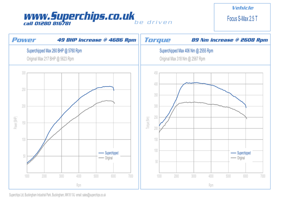 www.Superchips.co.uk be call 01280 816781 Power 49 BHP increase @ 4686 Rpm Vehicle Focus S-Max 2.5 T driven Torque 89 Nm increase @ 2608 Rpm Superchipped Max 260 BHP @ 5760 Rpm Superchipped Max 406 Nm @ 2555 Rpm Original Max 217 BHP @ 5623 Rpm Original Max 318 Nm @ 2567 Rpm 450 300 400 250 350 300 Torque (Nm) Power (BHP) 200 150 100 200 150 100 Superchipped Original 50 1000 250 2000 3000 4000 5000 Rpm Superchips Ltd, Buckingham Industrial Park, Buckingham, MK18 1XJ email: [email protected] 6000 Superchipped Original 50 7000 1000 2000 3000 4000 Rpm 5000 6000 7000