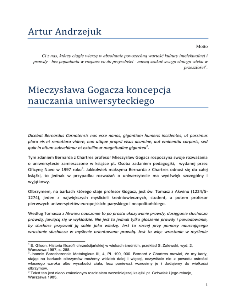 Artur Andrzejuk Motto Ci z nas, którzy ciągle wierzą w absolutnie powszechną wartość kultury intelektualnej i prawdy - bez popadania w rozpacz co do przyszłości - muszą szukać swego złotego wieku w przeszłości1. Mieczysława Gogacza koncepcja nauczania uniwersyteckiego Dicebat Bernardus Carnotensis nos esse nanos, gigantium humeris incidentes, ut possimus plura eis et remotiora videre, non utique proprii visus acumine, aut eminentia corporis, sed quia in altum subvehimur et extollimur magnitudine gigantea2. Tym zdaniem Bernarda z Chartres profesor Mieczysław Gogacz rozpoczyna swoje rozważania o uniwersytecie zamieszczone w książce pt. Osoba zadaniem pedagogiki, wydanej przez Oficynę Navo w 1997 roku3. Jakkolwiek maksyma Bernarda z Chartres odnosi się do całej książki, to jednak w przypadku rozważao o uniwersytecie ma wydźwięk szczególny i wyjątkowy. Olbrzymem, na barkach którego staje profesor Gogacz, jest św. Tomasz z Akwinu (1224/51274), jeden z największych myślicieli średniowiecznych, student, a potem profesor pierwszych uniwersytetów europejskich: paryskiego i neapolitaoskiego. Według Tomasza z Akwinu nauczanie to po prostu ukazywanie prawdy, dosięganie słuchacza prawdą, jawiącą się w wykładzie. Nie jest to jednak tylko głoszenie prawdy i powodowanie, by słuchacz przyswoił ją sobie jako wiedzę. Jest to raczej przy pomocy nauczającego wrastanie słuchacza w myślenie orientowane prawdą. Jest to więc wrastanie w myślenie 1 E. Gilson, Historia filozofii chrześcijańskiej w wiekach średnich, przekład S. Zalewski, wyd. 2, Warszawa 1987, s. 288. 2 Joannis Saresberensis Metalogicus III, 4, PL 199, 900. Bernard z Chartres mawiał, że my karły, stając na barkach olbrzymów możemy widzieć dalej i więcej, oczywiście nie z powodu ostrości własnego wzroku albo wysokości ciała, lecz ponieważ wznosimy je i dodajemy do wielkości olbrzymów. 3 Tekst ten jest nieco zmienionym rozdziałem wcześniejszej książki pt. Człowiek i jego relacje, Warszawa 1985. 1 nauczającego, lecz jego myślenie nie jest celem nauczania. Jest pośredniczeniem. Jest przejęciem i przekazywaniem prawdy4. Uniwersytet zatem to spotkanie ludzi w prawdzie5. Spotkanie to jest wiarą i przyjaźnią, rodzi zatem wspólnotę nauczających i nauczanych - universitas. Struktura instytucjonalna jest wtórna. Uniwersytet jako instytucja strzeże badao naukowych, chroni i ułatwia badania, scala inicjatywy naukowe. Rola prawdy w nauczaniu uniwersyteckim Skoro prawda jest wprost jedynym, najwyższym i dominującym celem nauczania uniwersyteckiego, podstawowym zadaniem uniwersytetu6, należy dla ścisłości i jasności wykładu podad chociażby jej definicję. Otóż prawda w znaczeniu metafizycznym (tzn. w filozofii pierwszej) jest własnością przysługującą każdemu bytowi ze względu na to, że istnieje. Każdy zatem istniejący realnie byt jest prawdą. Prawda w ujęciu teorii poznania jest zgodnością naszej wiedzy z rzeczywistością. Na terenie logiki prawda jest cechą zdao. Warto od razu zauważyd, że powszechnie zawęża się rozumienie prawdy do samej logiki, ale przecież prawdziwośd zdania, że „Bóg jest” nie oznacza jeszcze istnienia Boga, jak i prawdziwośd zdania, że „istnieje zło”, nie oznacza wcale, że zło realnie istnieje. Wiernośd zatem prawdzie nie oznacza wierności zdaniom, lecz realnie istniejącym bytom, a poszukiwanie prawdy polega na wysiłku coraz precyzyjniejszego i pełniejszego wyrażenia tego, co odsłania nam rzeczywistośd. Samo to poznanie jest możliwe dzięki właśnie istnieniowej własności prawdy, która powoduje, że dzięki istnieniu cały byt otwiera się i udziela poznawczo naszemu intelektowi. Gdy natomiast prawda, którą jest napotkany byt, oddziała podczas spotkania na prawdę, którą my jesteśmy, to rodzi się wtedy istnieniowa relacja wiary. Ta relacja, gdy dotyczy osób, jest relacją zwrotną, to znaczy, że każda z powiązanych nią stron zarówno coś wnosi, jak i coś odbiera. Wiara zatem, jako relacja osobowa warunkuje zarówno postawę czynną jak i postawę bierną. Postawą czynną jest komunikowanie (mówienie) prawdy drugiej osobie, po prostu prawdomównośd. Postawą bierną w relacji wiary jest otwartośd na treści wnoszone przez drugą stronę. Ta otwartośd warunkuje zarówno podjęcie zaufania jak i poznanie, gdyż w poznaniu intelekt właśnie otwiera się na oddziałujący byt jako na prawdę. Należy tu zwrócid uwagę na to, że łacioskie „credere” oznacza raczej ufad, niż przyjąd do wiadomości coś nieudowodnionego, a takie niestety znaczenie nadano polskiemu czasownikowi „wierzyd”. Na pierwszych europejskich uniwersytetach powtarzano za Izaakiem Israeli, że prawda jest zgodnością naszych ujęd z bytem, który badamy7. Nie znaczy to, że udziałem tamtym 4 M. Gogacz, Osoba zadaniem pedagogiki. Wykłady bydgoskie, Warszawa 1997, s. 108. Osoba zadaniem pedagogiki, s. 120. 6 Osoba zadaniem pedagogiki, s. 109. 7 Verum est adequatio rei et intellectus. 5 2 uczonych był naiwny przesąd, że prawda da się jednoznacznie ująd i wyrazid w ustalonej raz na zawsze definicji. Żyjący w XIV wieku Guibert z Tournai pisał wprost, że nigdy nie odnajdziemy prawdy, o ile zadomowiliśmy się w tym, co już zostało odkryte. Ci którzy pisali przed nami nie są naszymi władcami, tylko przewodnikami. Prawda stoi otworem dla wszystkich, jej miejsce przez nikogo nie zostało jeszcze zajęte8. W jej poszukiwaniu upatrywali jednak sensu istnienia nauk i sensu życia uczonego. Piszący na początku XII wieku Honoriusz z Autun zwykł powtarzad: Wygnaniem człowieka jest ciemnota; jego ojczyzną jest wiedza9. Natomiast znany teoretyk nauki Hugon ze Świętego Wiktora ostrzegał przed jakimkolwiek zawężaniem wiedzy. Dlatego Tomasz z Akwinu jeszcze silniej niż Arystoteles związał prawdę z bytem, a wprost z jego istnieniem. Stąd skłonnośd do zamiennego traktowania prawdy i by