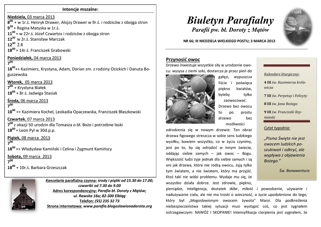 Intencje mszalne: Niedziela, 03 marca 2013 800 + w 1r.ś. Henryk Drawer, Alojzy Drawer w 9r.ś. i rodziców z obojga stron 930 + Regina Matyska w 1r.ś. 1100 + w 22r.ś. Józef Czwartos i rodziców z obojga stron 1230 w 2r.ś. Stanisław Marczak 1230 Ż.R 1800 + 14r.ś. Franciszek Grabowski Poniedziałek, 04 marca 2013 700 1800++ Kazimierz, Krystyna, Adam, Dorian zm. z rodziny Ocickich i Danuta Boguszewska Wtorek, 05 marca 2013 700 + Krystyna Białek 1800 + 8r.ś. Jadwiga Stasiak Środa, 06 marca 2013 700 1800 ++ Kazimiera Kochel, Leokadia Opaczewska, Franciszek Błaszkowski Czwartek, 07 marca 2013 700 z okazji 50 urodzin dla Tomasza o bł. Boże i potrzebne łaski 1800 + Leon Pyl w 30d.p.p. Piątek, 08 marca 2013 700 1800 ++ Władysław Kamiński i Celina i Zygmunt Kamińscy Sobota, 09 marca 2013 700 1800 + 10r.ś. Barbara Grzeszczak Kancelaria parafialna czynna: środy i piątki od 15.30 do 17.00; czwartki od 7.30 do 9.00 Adres korespondencyjny: Parafia bł. Doroty z Mątów; ul. Rawska 16a; 82-300 Elbląg Telefon: (55) 235 32 73 Strona internetowa: www.parafia.blogoslawionadorota.org Biuletyn Parafialny Parafii pw. bł. Doroty z Mątów NR 66; III NIEDZIELA WIELKIEGO POSTU; 3 MARCA 2013 Przynosić owoc Drzewo inwestuje wszystkie siły w urodzenie owocu: wysysa z ziemi soki, dostarcza je przez pień do Kalendarz liturgiczny: gałęzi, wypuszcza 4 III św. Kazimierza króleliście i poświęca wicza piękno kwiatów, byleby tylko 7 III św. Perpetuy i Felicyty zaowocować. 8 III św. Jana Bożego Drzewo bez owocu 9 III św. Franciszki Rzyto po prostu mianki drzewo bez możliwości Cytat tygodnia: odrodzenia się w nowym drzewie. Ten obraz drzewa figowego streszcza w sobie sens ludzkiego „Pismo Święte nie jest wysiłku, bowiem wszystko, co w życiu czynimy, owocem ludzkich pojest po to, by się odrodzić w innym świecie, szukiwań i odkryć, ale oddając siebie samych – jak owoc – Bogu. wypływa z objawienia Większość ludzi żyje jednak dla siebie samych i są Bożego.” oni jak drzewa, które nie rodzą owocu, żyją tylko Św. Bonawentura tym światem, a nie światem, który ma przyjść. Ktoś taki nie widzi problemu. Wydaje mu się, że wszystko działa dobrze. Jest zdrowie, piękno, pieniądze, inteligencja, dostatek dóbr, miłość i powodzenie, używanie i nadużywanie ciała, ale nie ma troski o wieczność, o życie upodobnione do tego, który był „błogosławionym owocem żywota” Maryi. Dla podkreślenia niebezpieczeństwa takiej sytuacji musi wystąpić coś, co jest sygnałem ostrzegawczym: NAWÓZ I SKOPANIE! Intensyfikacja cierpienia jest sygnałem, że najwyższy czas pomyśleć nie o tym świecie. Dopóki nie zauważymy, w jakie gnojowisko zabrnęliśmy z naszymi ideałami i planami, nie mamy wcale ochoty na nawrócenie, czyli na oddanie siebie Bogu. Gdy pojawia się dramat, gdy zawaleniu ulegają nasze projekty, gdy zostajemy obrzuceni nawozem naszych grzechów albo gdy czujemy się skopani przez kolejne doświadczenia losu, najwyższy czas pomyśleć w inny sposób o sensie życia. Wtedy zwykle trochę poważniej zaczynamy myśleć o Bogu. Przestaje On być „kulą u nogi”, a staje się jedynym, który bierze pod ramię i nas podtrzymuje. Kwitnie refleksja, nasze modlitwy pachną miłością i owocujemy gruntowną spowiedzią. Bóg oczekuje od nas wiary w przyszłe życie po zmartwychwstaniu, bardziej niż my lękamy się rozpaczy z powodu porażki na tym świecie. Jeśli tej wiary w nas nie odnajdzie, w końcu zostaniemy wycięci. Bo po co żyć, skoro nie chce się żyć wiecznie? Święci znani… i nie znani wciągał go powoli do współrządzenia. Podczas dwuletniego pobytu ojca na Litwie Kazimierz jako namiestnik rządził w Koronie. Obowiązki państwowe umiał pogodzić z bogatym życiem duchowym. Wezwany przez ojca w 1483 r. do Wilna, umarł w drodze z powodu trapiącej go gruźlicy. Na wieść o pogorszeniu się zdrowia Kazimierza, król przybył do Grodna. Właśnie tam, "opowiedziawszy dzień śmierci swej tym, którzy mu w niemocy służyli [...], ducha Panu Bogu poleciwszy wypuścił 4 dnia marca R.P. 1484, lat mając 26" - napisał ks. Piotr Skarga. Pochowano go w katedrze wileńskiej, w kaplicy Najświętszej Maryi Panny. HUMOR Przychodzi starsza pani do lekarza: - Powinna pani jeść dużo owoców i to najlepiej bez obierania. Kobieta dziękuje za diagnozę i zbiera się do wyjścia. - A tak a propos, jakie owoce pani jada najczęściej? - pyta lekarz. - Orzechy. Ogłoszenia parafialne – III Niedziela Wielkiego Postu Św. Kazimierz, królewicz Kazimierz urodził się 3 października 1458 r. w Krakowie na Wawelu. Był drugim z kolei spośród sześciu synów Kazimierza Jagiellończyka. Jego matką była Elżbieta, córka cesarza Niemiec, Albrechta II. Pod jej opieką Kazimierz pozostawał do dziewiątego roku życia. W 1467 r. król powołał na pierwszego wychowawcę i nauczyciela swoich synów księdza Jana Długosza, kanonika krakowskiego, który aż do XIX w. był najwybitniejszym historykiem Polski. "Był młodzieńcem szlachetnym, rzadkich zdolności i godnego pamięci rozumu" zapisał Długosz o Kazimierzu. W 1475 r. do grona nauczycieli synów królewskich dołączył znany humanista, Kallimach (Filip Buonacorsi). Król bowiem chciał, by jego synowie otrzymali wszechstronne wykształcenie. Ochmistrz królewski zaprawiał ich również w sztuce wojennej. W 1471 r. brat Kazimierza, Władysław, został koronowany na króla czeskiego. W tym samym czasie na Węgrzech wybuchł bunt przeciwko królowi. Na tron zaproszono Kazimierza. Jego ojciec chętnie przystał na tę propozycję. Kazimierz wyruszył razem z 12 tysiącami wojska, by poprzeć zbuntowanych magnatów. Ci jednak ostatecznie wycofali swe poparcie i Kazimierz wrócił do Polski bez korony węgierskiej. Ten zawód dał mu wiele do myślenia. Po powrocie do kraju królewicz nie przestał interesować się sprawami publicznymi, wręcz przeciwnie, został prawą ręką
