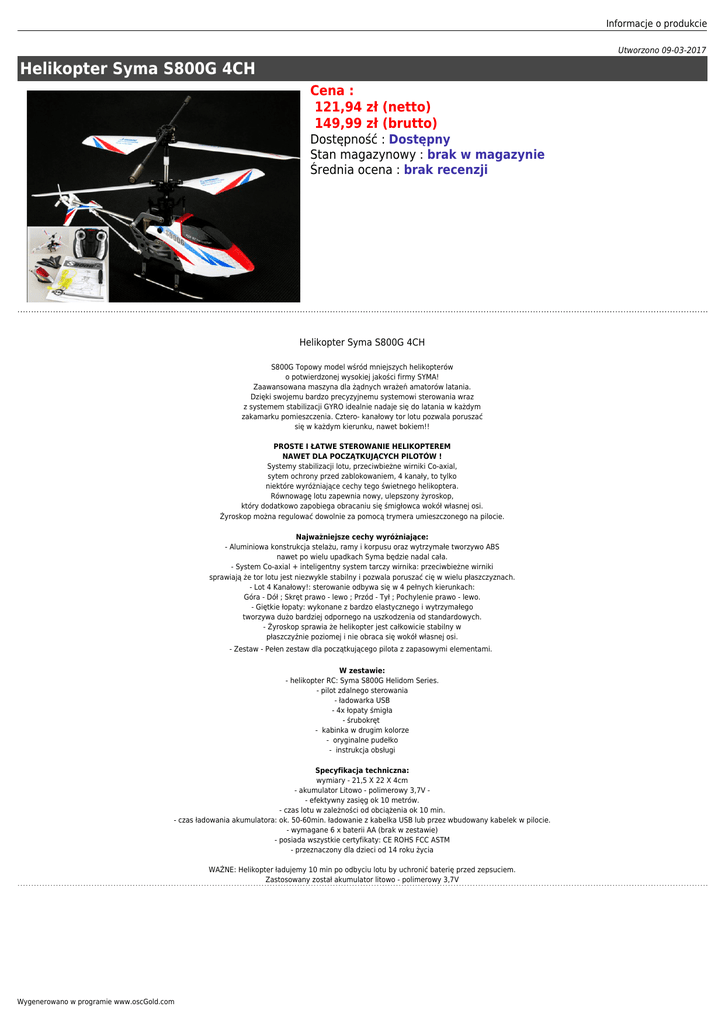 Informacje o produkcie Utworzono 09-03-2017 Helikopter Syma S800G 4CH Cena : 121,94 zł (netto) 149,99 zł (brutto) Dostępność : Dostępny Stan magazynowy : brak w magazynie Średnia ocena : brak recenzji Helikopter Syma S800G 4CH S800G Topowy model wśród mniejszych helikopterów o potwierdzonej wysokiej jakości firmy SYMA! Zaawansowana maszyna dla żądnych wrażeń amatorów latania. Dzięki swojemu bardzo precyzyjnemu systemowi sterowania wraz z systemem stabilizacji GYRO idealnie nadaje się do latania w każdym zakamarku pomieszczenia. Cztero- kanałowy tor lotu pozwala poruszać się w każdym kierunku, nawet bokiem!! PROSTE I ŁATWE STEROWANIE HELIKOPTEREM NAWET DLA POCZĄTKUJĄCYCH PILOTÓW ! Systemy stabilizacji lotu, przeciwbieżne wirniki Co-axial, sytem ochrony przed zablokowaniem, 4 kanały, to tylko niektóre wyróżniające cechy tego świetnego helikoptera. Równowagę lotu zapewnia nowy, ulepszony żyroskop, który dodatkowo zapobiega obracaniu się śmigłowca wokół własnej osi. Żyroskop można regulować dowolnie za pomocą trymera umieszczonego na pilocie. Najważniejsze cechy wyróżniające: - Aluminiowa konstrukcja stelażu, ramy i korpusu oraz wytrzymałe tworzywo ABS nawet po wielu upadkach Syma będzie nadal cała. - System Co-axial + inteligentny system tarczy wirnika: przeciwbieżne wirniki sprawiają że tor lotu jest niezwykle stabilny i pozwala poruszać cię w wielu płaszczyznach. - Lot 4 Kanałowy!: sterowanie odbywa się w 4 pełnych kierunkach: Góra - Dół ; Skręt prawo - lewo ; Przód - Tył ; Pochylenie prawo - lewo. - Giętkie łopaty: wykonane z bardzo elastycznego i wytrzymałego tworzywa dużo bardziej odpornego na uszkodzenia od standardowych. - Żyroskop sprawia że helikopter jest całkowicie stabilny w płaszczyźnie poziomej i nie obraca się wokół własnej osi. - Zestaw - Pełen zestaw dla początkującego pilota z zapasowymi elementami. W zestawie: - helikopter RC: Syma S800G Helidom Series. - pilot zdalnego sterowania - ładowarka USB - 4x łopaty śmigła - śrubokręt - kabinka w drugim kolorze - oryginalne pudełko - instrukcja obsługi Specyfikacja techniczna: wymiary - 21,5 X 22 X 4cm - akumulator Litowo - polimerowy 3,7V - efektywny zasięg ok 10 metrów. - czas lotu w zależności od obciążenia ok 10 min. - czas ładowania akumulatora: ok. 50-60min. ładowanie z kabelka USB lub przez wbudowany kabelek w pilocie. - wymagane 6 x baterii AA (brak w zestawie) - posiada wszystkie certyfikaty: CE ROHS FCC ASTM - przeznaczony dla dzieci od 14 roku życia WAŻNE: Helikopter ładujemy 10 min po odbyciu lotu by uchronić baterię przed zepsuciem. Zastosowany został akumulator litowo - polimerowy 3,7V Wygenerowano w programie www.oscGold.com