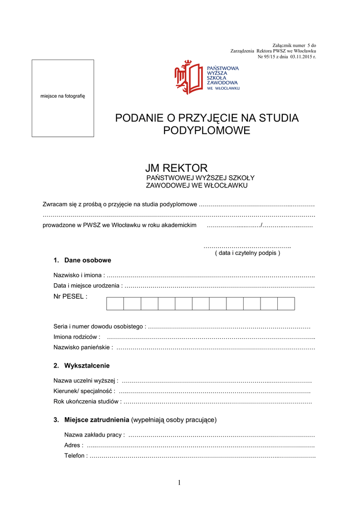 Załącznik numer 5 do Zarządzenia Rektora PWSZ we Włocławku Nr 95/15 z dnia 03.11.2015 r. miejsce na fotografię PODANIE O PRZYJĘCIE NA STUDIA PODYPLOMOWE JM REKTOR PAŃSTWOWEJ WYŻSZEJ SZKOŁY ZAWODOWEJ WE WŁOCŁAWKU Zwracam się z prośbą o przyjęcie na studia podyplomowe ……………………………………….………… ………………………………………………………………………………………………………………….…… prowadzone w PWSZ we Włocławku w roku akademickim ……………......….…/………..……..……. …………………………………….. ( data i czytelny podpis ) 1. Dane osobowe Nazwisko i imiona : ………………………………………………………………………………………….. Data i miejsce urodzenia : …………………………………………………………….……………………. Nr PESEL : Seria i numer dowodu osobistego : ……………………………………………………………………… Imiona rodziców : ………………………………………………………………………………………….. Nazwisko panieńskie : ……………………………………………………………………………………… 2. Wykształcenie Nazwa uczelni wyższej : ………………………………………………………………..………………… Kierunek/ specjalność : …..………………………………………………………………………………. Rok ukończenia studiów : …………………………………………………………………………………. 3. Miejsce zatrudnienia (wypełniają osoby pracujące) Nazwa zakładu pracy : ………………………………………………………………………………… Adres : …..………………………………………………………………………………………………. Telefon : ………………………………………………………………………………….………………. 1 4. Adres zamieszkania Miejscowość : ……………………………………………………………………………………………..…. Ulica : ……………………………………………. Nr domu ……………….…. Nr lokalu ……….…… . 5. Adres do korespondencji Miejscowość : …………………………………………………………………..……………………………. Ulica : ……………………………………….……. Nr domu …………………. Nr lokalu …………… . 6. Dane kontaktowe Telefon : …………………………………………………..……………………..…………………………. E- mail : ……………………………………………………………………………………………………… Spis załączonych dokumentów L.p. Kserokopia dyplomu potwierdzającego 1. 2. 3. 4. 5. kwalifikacje co najmniej pierwszego stopnia Kserokopia dowodu osobistego kandydata Aktualna fotografia (podpisana imieniem i nazwiskiem) Dowód dokonania opłaty za postępowanie administracyjne związane z przyjęciem na studia na konto Uczelni nr …………………………………………………………………………… Inne : …………………………………………………………………….. Zgodnie z art. 24 ust. 1 Ustawy z dnia 29 sierpnia 1997 roku o ochronie danych osobowych (Dz. U. z 2014 r. poz.1182 ze zm.),, informujemy, że: administratorem Pana/Pani danych osobowych jest Państwowa Wyższa Szkoła Zawodowa we Włocławku z siedzibą we Włocławku, ul. 3 Maja 17 , 87 – 800 Włocławek, zwana dalej Uczelnią, oraz Centrum Kształcenia Zawodowego i Ustawicznego z siedzibą we Włocławku, ul. Nowomiejska 25,87-800 Włocławek, zwane dalej Centrum, Pani/ Pana dane osobowe przetwarzane będą w celu realizacji procedury rekrutacji na studia podyplomowe, oraz w procesie realizacji cyklu kształcenia w Uczelni i Centrum i nie będą udostępniane innym odbiorcom, posiada Pani/Pan prawo dostępu do treści swoich danych osobowych oraz ich poprawiania. podanie Uczelni i Centrum danych osobowych jest dobrowolne. Wyrażam zgodę na przetwarzanie moich danych osobowych zawartych w niniejszym podaniu dla potrzeb niezbędnych do realizacji procesu rekrutacji na studia podyplomowe oraz w procesie realizacji cyklu kształcenia w Uczelni, zgodnie z Ustawą z dnia 29 sierpnia 1997 roku o ochronie danych osobowych (tekst jednolity Dz. U. z 2002 r., nr 101, poz. 926, z późn. zm.). …………………………………………. ……………………………………….. (miejscowość, data) (podpis składającego oświadczenie) 2