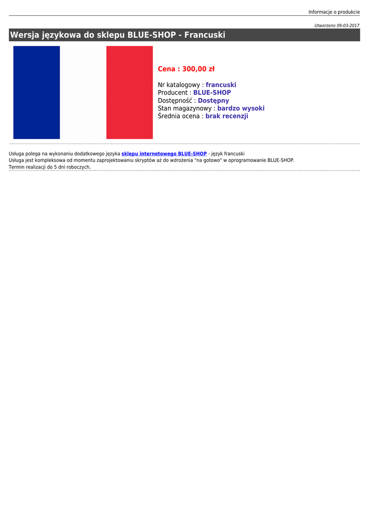 Informacje o produkcie Utworzono 09-03-2017 Wersja językowa do sklepu BLUE-SHOP - Francuski Cena : 300,00 zł Nr katalogowy : francuski Producent : BLUE-SHOP Dostępność : Dostępny Stan magazynowy : bardzo wysoki Średnia ocena : brak recenzji Usługa polega na wykonaniu dodatkowego języka sklepu internetowego BLUE-SHOP - język francuski Usługa jest kompleksowa od momentu zaprojektowaniu skryptów aż do wdrożenia "na gotowo" w oprogramowanie BLUE-SHOP. Termin realizacji do 5 dni roboczych.