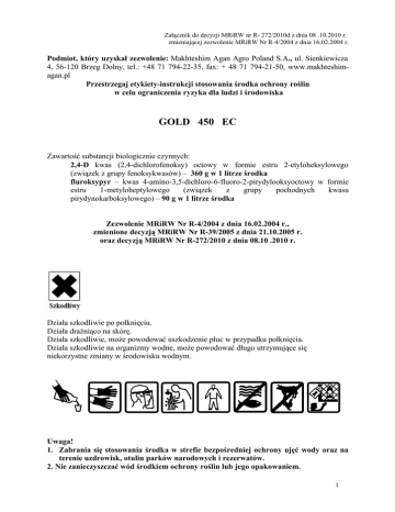 Załącznik do decyzji MRiRW nr R- 272/2010d z dnia 08 .10.2010 r. zmieniającej zezwolenie MRiRW Nr R-4/2004 z dnia 16.02.2004 r. Podmiot, który uzyskał zezwolenie: Makhteshim Agan Agro Poland S.A., ul. Sienkiewicza 4, 56-120 Brzeg Dolny, tel.: +48 71 794-22-35, fax: + 48 71 794-21-50, www.makhteshimagan.pl Przestrzegaj etykiety-instrukcji stosowania środka ochrony roślin w celu ograniczenia ryzyka dla ludzi i środowiska GOLD 450 EC Zawartość substancji biologicznie czynnych: 2,4-D kwas (2,4-dichlorofenoksy) octowy w formie estru 2-etyloheksylowego (związek z grupy fenoksykwasów) – 360 g w 1 litrze środka fluroksypyr – kwas 4-amino-3,5-dichloro-6-fluoro-2-pirydylooksyoctowy w formie estru 1-metyloheptylowego (związek z grupy pochodnych kwasu pirydynokarboksylowego) – 90 g w 1 litrze środka Zezwolenie MRiRW Nr R-4/2004 z dnia 16.02.2004 r., zmienione decyzją MRiRW Nr R-39/2005 z dnia 21.10.2005 r. oraz decyzją MRiRW Nr R-272/2010 z dnia 08.10 .2010 r. Działa szkodliwie po połknięciu. Działa drażniąco na skórę. Działa szkodliwie, może powodować uszkodzenie płuc w przypadku połknięcia. Działa szkodliwie na organizmy wodne, może powodować długo utrzymujące się niekorzystne zmiany w środowisku wodnym. Uwaga! 1. Zabrania się stosowania środka w strefie bezpośredniej ochrony ujęć wody oraz na terenie uzdrowisk, otulin parków narodowych i rezerwatów. 2. Nie zanieczyszczać wód środkiem ochrony roślin lub jego opakowaniem. 1 I. OPIS DZIAŁANIA Środek chwastobójczy w formie koncentratu do sporządzania emulsji wodnej, stosowany nalistnie, przeznaczony do powschodowego zwalczania jednorocznych i wieloletnich chwastów dwuliściennych w zbożach ozimych i jarych. Środek jest herbicydem działaniu systemicznym, pobierany jest poprzez liście chwastów, a następnie szybko przemieszczany w całej roślinie powodując jej deformację i zahamowanie wzrostu, co w efekcie powoduje zamieranie chwastu. Środek działa głównie poprzez liście chwastów, lecz w warunkach wysokiej wilgotności gleby może działać także poprzez korzenie. Fluroksypyr blokuje auksyny, tj. hormony roślinne odpowiedzialne za wzrost roślin. Unieczynnienie hormonów wzrostu powoduje wstrzymanie syntezy aminokwasów i białek. 2,4-D wstrzymuje rozwój tkanki merystematycznej odpowiedzialnej za wzrost roślin. Obie substancje biologicznie czynne działają jednakowo skutecznie zarówno w części korzeniowej, jak i w części nadziemnej. Pierwsze efekty działania są widoczne już po kilku dniach. W warunkach ciepłej i wilgotnej pogody całkowite zamieranie chwastów następuje po 2-3 tygodniach. Środek najskuteczniej niszczy chwasty znajdujące się we wczesnych fazach wzrostu: od fazy dwóch do ośmiu liści (przytulia czepna do fazy 8 okółków, chwasty rumianowate do fazy rozety o średnicy około 5 cm). Intensywność działania środka zależy od terminu wykonania zabiegu, fazy rozwojowej rośliny uprawnej, zwartości łanu, stanowiska oraz warunków atmosferycznych. Chwasty wrażliwe np: blekot pospolity, bniec biały, chaber bławatek, gorczyca polna, gwiazdnica pospolita, jasnota purpurowa, jasnota różowa, komosa biała, niezapominajka polna, ostrożeń polny, poziewnik szorstki, przytulia czepna, rdest plamisty, rdest powojowaty, rumian polny, rumianek pospolity, stulicha psia, tasznik pospolity, tobołki polne. Chwasty średnio wrażliwe np.: fiołek polny, krzywoszyj polny, przetaczniki, maruna bezwonna, samosiewy rzepaku. Chwasty odporne np: chwasty jednoliścienne. II. ZAKRES STOSOWANIA, TERMINY I DAWKI UWAGI ODMIANOWE 1. Środek zastosowany a) w fazie początku strzelania w źdźbło żyta (odmiana Walet), b) krzewienia i początku strzelania w źdźbło jęczmienia jarego (odmiana Annabel) 2 może spowodować przejściowe zahamowanie wzrostu roślin oraz odbarwienie blaszek liściowych. 2. W niektórych odmianach pszenicy ozimej (np. odmiana Kaja), pszenicy jarej (np. odmiana Koksa), pszenżyta jarego (np. odmiana Wanad) środek może spowodować obniżenie plonu ziarna. ZBOŻA OZIME: PSZENICA OZIMA, PSZENŻYTO OZIME, JĘCZMIEŃ OZIMY, ŻYTO ZBOŻA JARE: PSZENICA JARA, JĘCZMIEŃ JARY, OWIES, PSZENŻYTO JARE Opryskiwać od fazy 3 liści do fazy pierwszego kolanka zbóż. Zalecana dawka: 1-1,25 l/ha. Wyższe z zalecanych dawek środka stosować w warunkach silnego zachwaszczenia oraz zwalczania takich chwastów jak: jasnoty, przytulia czepna, chwasty rumianowate, ostrożeń polny. Zalecana ilość wody: 200-300 l/ha. Zalecane opryskiwanie: średniokropliste. UWAGI: 1. Na teren potraktowany środkiem nie wpuszczać zwierząt gospodarskich, zwłaszcza bydła mlecznego, przez 21 dni od opryskiwania. 2. Spadki temperatur poniżej 5oC występujące w kilka dni po zabiegu mogą wpłynąć na obniżenie skuteczności środka. NASTĘPSTWO ROŚLIN Środek rozkłada się w glebie w ciągu okresu wegetacji nie stwarzając zagrożenia dla roślin uprawianych następczo. W przypadku konieczności zaorania plantacji potraktowanej środkiem w wyniku uszkodzenia roślin przez przymrozki, choroby lub szkodniki, po wykonaniu intensywnej uprawy przedsiewnej można uprawiać wszystkie rośliny. III. OKRES KARENCJI Okres od dnia ostatniego zabiegu do dnia zbioru roślin przeznaczonych do konsumpcji: NIE DOTYCZY 3 IV. OKRES PREWENCJI DLA LUDZI, PSZCZÓŁ Okres zapobiegający zatruciu: NIE DOTYCZY V. OKRES PREWENCJI DLA ZWIERZĄT Okres zapobiegający zatruciu: 21 DNI VI. PRZECIWWSKAZANIA Środka nie stosować: w temperaturze powietrza poniżej 8oC i powyżej 25oC, po nocnych przymrozkach i przed spodziewanymi przymrozkami, w zbożach z wsiewką roślin motylkowatych, na rośliny mokre, chore i uszkodzone, w czasie nadmiernej suszy, nie później, niż na 2 godziny przed spodziewanym deszczem. Podczas stosowania środka nie dopuścić do: - znoszenia cieczy użytkowej na sąsiednie plantacje roślin uprawnych, - nakładania się cieczy użytkowej na stykach pasów zabiegowych i