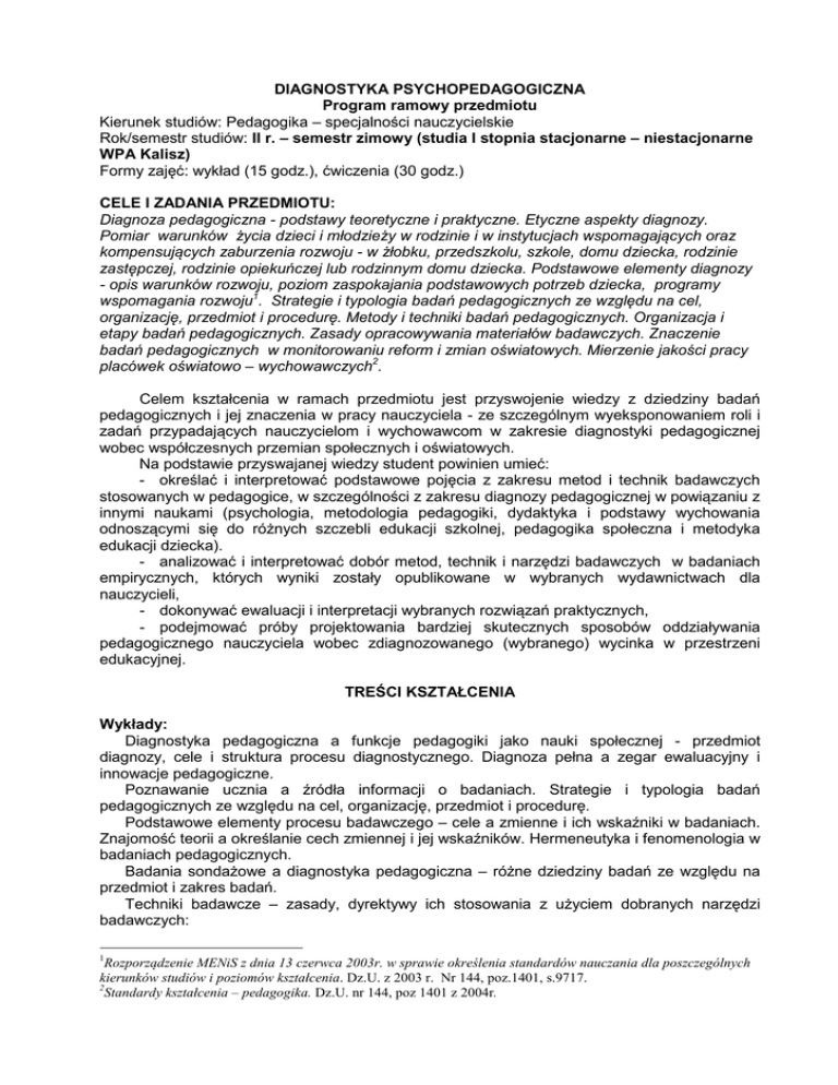 DIAGNOSTYKA PSYCHOPEDAGOGICZNA Program ramowy przedmiotu Kierunek studiów: Pedagogika – specjalności nauczycielskie Rok/semestr studiów: II r. – semestr zimowy (studia I stopnia stacjonarne – niestacjonarne WPA Kalisz) Formy zajęć: wykład (15 godz.), ćwiczenia (30 godz.) CELE I ZADANIA PRZEDMIOTU: Diagnoza pedagogiczna - podstawy teoretyczne i praktyczne. Etyczne aspekty diagnozy. Pomiar warunków życia dzieci i młodzieży w rodzinie i w instytucjach wspomagających oraz kompensujących zaburzenia rozwoju - w żłobku, przedszkolu, szkole, domu dziecka, rodzinie zastępczej, rodzinie opiekuńczej lub rodzinnym domu dziecka. Podstawowe elementy diagnozy - opis warunków rozwoju, poziom zaspokajania podstawowych potrzeb dziecka, programy wspomagania rozwoju1. Strategie i typologia badań pedagogicznych ze względu na cel, organizację, przedmiot i procedurę. Metody i techniki badań pedagogicznych. Organizacja i etapy badań pedagogicznych. Zasady opracowywania materiałów badawczych. Znaczenie badań pedagogicznych w monitorowaniu reform i zmian oświatowych. Mierzenie jakości pracy placówek oświatowo – wychowawczych2. Celem kształcenia w ramach przedmiotu jest przyswojenie wiedzy z dziedziny badań pedagogicznych i jej znaczenia w pracy nauczyciela - ze szczególnym wyeksponowaniem roli i zadań przypadających nauczycielom i wychowawcom w zakresie diagnostyki pedagogicznej wobec współczesnych przemian społecznych i oświatowych. Na podstawie przyswajanej wiedzy student powinien umieć: - określać i interpretować podstawowe pojęcia z zakresu metod i technik badawczych stosowanych w pedagogice, w szczególności z zakresu diagnozy pedagogicznej w powiązaniu z innymi naukami (psychologia, metodologia pedagogiki, dydaktyka i podstawy wychowania odnoszącymi się do różnych szczebli edukacji szkolnej, pedagogika społeczna i metodyka edukacji dziecka). - analizować i interpretować dobór metod, technik i narzędzi badawczych w badaniach empirycznych, których wyniki zostały opublikowane w wybranych wydawnictwach dla nauczycieli, - dokonywać ewaluacji i interpretacji wybranych rozwiązań praktycznych, - podejmować próby projektowania bardziej skutecznych sposobów oddziaływania pedagogicznego nauczyciela wobec zdiagnozowanego (wybranego) wycinka w przestrzeni edukacyjnej. TREŚCI KSZTAŁCENIA Wykłady: Diagnostyka pedagogiczna a funkcje pedagogiki jako nauki społecznej - przedmiot diagnozy, cele i struktura procesu diagnostycznego. Diagnoza pełna a zegar ewaluacyjny i innowacje pedagogiczne. Poznawanie ucznia a źródła informacji o badaniach. Strategie i typologia badań pedagogicznych ze względu na cel, organizację, przedmiot i procedurę. Podstawowe elementy procesu badawczego – cele a zmienne i ich wskaźniki w badaniach. Znajomość teorii a określanie cech zmiennej i jej wskaźników. Hermeneutyka i fenomenologia w badaniach pedagogicznych. Badania sondażowe a diagnostyka pedagogiczna – różne dziedziny badań ze względu na przedmiot i zakres badań. Techniki badawcze – zasady, dyrektywy ich stosowania z użyciem dobranych narzędzi badawczych: 1 Rozporządzenie MENiS z dnia 13 czerwca 2003r. w sprawie określenia standardów nauczania dla poszczególnych kierunków studiów i poziomów kształcenia. Dz.U. z 2003 r. Nr 144, poz.1401, s.9717. 2 Standardy kształcenia – pedagogika. Dz.U. nr 144, poz 1401 z 2004r. - analiza dokumentów, - testowanie (w tym pomiar socjometryczny), - wywiad, - obserwacja, - ankietowanie. Narzędzia badawcze a trafność i rzetelność pomiaru. Dobór próby badawczej (schematy doboru i wielkość próby badawczej wobec populacji). Ewaluacja i zmiana w procedurze badań pedagogicznych.. Sondaż diagnostyczny a inne metody badań pedagogicznych. Próby eksperymentalne i eksperymenty w pedagogice. Rodzaje zmiennych i plany badawcze. Plany badawcze i ich rodzaje w eksperymentach pedagogicznych. Plany quasielsperymentalne i preeksperymentalne. Monografia pedagogiczna i metoda biograficzna w badaniach pedagogicznych. Metody badań historyczno – pedagogicznych. Metody analizy porównawczej w badaniach pedagogicznych. Znaczenie badań porównawczych w postępie pedagogicznym w praktyce. Studium indywidualnych przypadków – a terapia pedagogiczna. Badanie w działaniu wobec triangulacji metod i technik badawczych w edukacji i jej wartości. Metody statystyczne a badania ilościowe i jakościowe w badaniach społecznych. Zasady i formy prezentacji wyników badań pedagogicznych. Normy Interpretacje empirycznych danych statystycznych. Ogólne zasady gromadzenia, przetwarzania, analizowania i prezentacji danych źródłowych w badaniach empirycznych. Podstawowe obszary diagnostyki psychopedagogicznej: - edukacja szkolna i edukacja pozaszkolna, - praca kulturalno – oświatowa, - w działalność socjalno – wychowawcza, - praca nauczyciela oraz jego aktywność w pracy badawczo - rozwojowej (ocena nauczyciela), - pedagogika terapeutyczna (edukacja uczniów o specjalnych potrzebach edukacyjnych, skuteczność oddziaływań psychoterapeutycznych i socjoterapeutycznych, pomoc uczniom z problemami zdrowotnymi, choroby związane z zawodem nauczyciela), - oddziaływania profilaktyczne a terapeutyczne w edukacji szkolnej i pozaszkolnej, - współpraca nauczyciela z rodzicami, psychologiem, pedagogiem szkolnym, lekarzem i pielęgniarką w poznawaniu i edukacji uczniów w szkole i poza nią. Konstruowanie klasowych i szkolnych programów profilaktycznych oraz terapeutycznych. Struktura pracy dyplomowej – normy edytorskie w opracowywaniu wyników badań pedagogicznych (kryteria recenzji). Podstawowe błędy w badaniu i interpretowaniu zjawisk pedagogicznych. Studencki ruch naukowy na kierunkach nauczycielskich. Studenckie seminarium naukowe – prezentacje wybranych opracowań badawczych, w tym opracowań własnych. Ćwiczenia: Analiza porównawcza oraz konstruowanie narzędzi odnoszących się do poszczególnych t