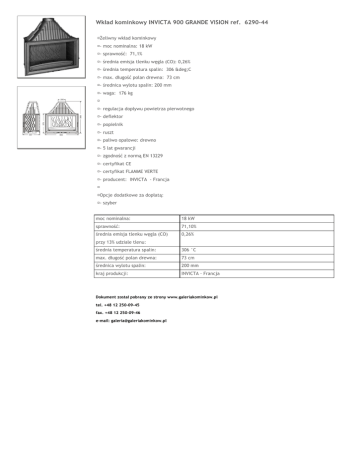Wkład kominkowy INVICTA 900 GRANDE VISION ref. 6290-44 Żeliwny wkład kominkowy - moc nominalna: 18 kW - sprawność: 71,1% - średnia emisja tlenku węgla (CO): 0,26% - średnia temperatura spalin: 306 °C - max. długość polan drewna: 73 cm - średnica wylotu spalin: 200 mm - waga: 176 kg - regulacja dopływu powietrza pierwotnego - deflektor - popielnik - ruszt - paliwo opałowe: drewno - 5 lat gwarancji - zgodność z normą EN 13229 - certyfikat CE - certyfikat FLAMME VERTE - producent: INVICTA - Francja Opcje dodatkowe za dopłatą: - szyber moc nominalna: 18 kW sprawność: 71,10% średnia emisja tlenku węgla (CO) 0,26% przy 13% udziale tlenu: średnia temperatura spalin: 306 °C max. długość polan drewna: 73 cm średnica wylotu spalin: 200 mm kraj produkcji: INVICTA - Francja Dokument został pobrany ze strony www.galeriakominkow.pl tel. +48 12 250-09-45 fax. +48 12 250-09-46 e-mail: [email protected]
