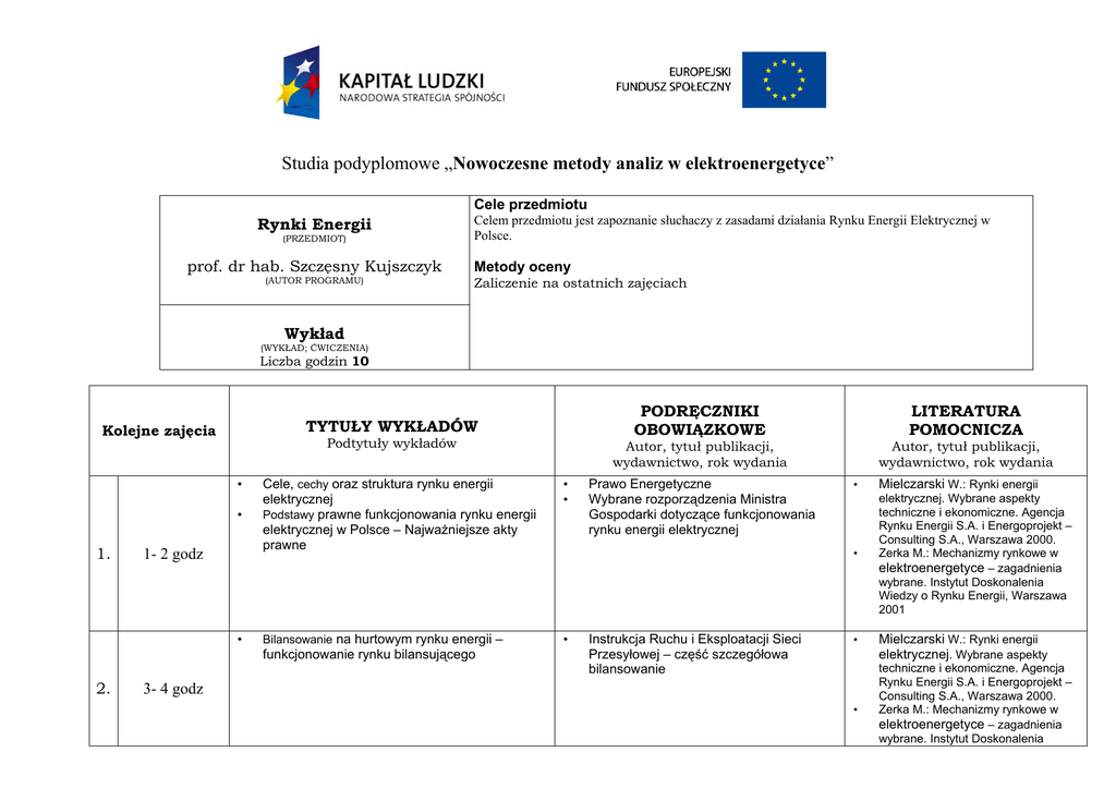 Studia podyplomowe „Nowoczesne metody analiz w elektroenergetyce” Cele przedmiotu Rynki Energii (PRZEDMIOT) prof. dr hab. Szczęsny Kujszczyk (AUTOR PROGRAMU) Celem przedmiotu jest zapoznanie słuchaczy z zasadami działania Rynku Energii Elektrycznej w Polsce. Metody oceny Zaliczenie na ostatnich zajęciach Wykład (WYKŁAD; ĆWICZENIA) Liczba godzin 10 Kolejne zajęcia Podtytuły wykładów • • 1. 1- 2 godz • LITERATURA POMOCNICZA Autor, tytuł publikacji, wydawnictwo, rok wydania Cele, cechy oraz struktura rynku energii elektrycznej Podstawy prawne funkcjonowania rynku energii elektrycznej w Polsce – Najważniejsze akty prawne • • Bilansowanie na hurtowym rynku energii – • funkcjonowanie rynku bilansującego 2. PODRĘCZNIKI OBOWIĄZKOWE TYTUŁY WYKŁADÓW Prawo Energetyczne Wybrane rozporządzenia Ministra Gospodarki dotyczące funkcjonowania rynku energii elektrycznej Instrukcja Ruchu i Eksploatacji Sieci Przesyłowej – część szczegółowa bilansowanie Autor, tytuł publikacji, wydawnictwo, rok wydania • Mielczarski W.: Rynki energii • elektrycznej. Wybrane aspekty techniczne i ekonomiczne. Agencja Rynku Energii S.A. i Energoprojekt – Consulting S.A., Warszawa 2000. Zerka M.: Mechanizmy rynkowe w elektroenergetyce – zagadnienia wybrane. Instytut Doskonalenia Wiedzy o Rynku Energii, Warszawa 2001 • 3- 4 godz • Mielczarski W.: Rynki energii elektrycznej. Wybrane aspekty techniczne i ekonomiczne. Agencja Rynku Energii S.A. i Energoprojekt – Consulting S.A., Warszawa 2000. Zerka M.: Mechanizmy rynkowe w elektroenergetyce – zagadnienia wybrane. Instytut Doskonalenia Wiedzy o Rynku Energii, Warszawa 2001 • Zarządzanie ryzykiem na rynku energii, instrumenty pochodne na rynku energii, tworzenie strategii zabezpieczających • • 3. Weron A., Weron R.: Giełda Energii. Strategie zarządzania ryzykiem. CIRE – Centrum Informacji o Rynku Energii, Wrocław 2000. Michalski D.: Zarządzanie ryzykiem na rynku energii elektrycznej. Instytut Doskonalenia Wiedzy o Rynku Energii • • 5 - 6 godz • • • • • 4. 7 –8 godz Praktyczne aspekty handlu na hurtowym rynku energii – rodzaje kontraktów, sposoby ich zawierania, podstawowe produkty Unbundling – relacje między spółkami obrotu a dystrybutorami Funkcja URE na rynku energii • • Zerka M.: Strategie na rynkach energii • elektrycznej. Instytut Doskonalenia Wiedzy o Rynku Energii Zerka M.: Mechanizmy rynkowe w elektroenergetyce – zagadnienia wybrane. Instytut Doskonalenia Wiedzy o Rynku • Energii, Warszawa 2001 • • • • Mielczarski W.: Rynki energii elektrycznej. Wybrane aspekty techniczne i ekonomiczne. Agencja Rynku Energii S.A. i Energoprojekt – Consulting S.A., Warszawa 2000. Zerka M.: Mechanizmy rynkowe w elektroenergetyce – zagadnienia wybrane. Instytut Doskonalenia Wiedzy o Rynku Energii, Warszawa 2001 Hull J.: Kontrakty terminowe i opcje. Wprowadzenie. Wydawnictwo Finansowe WIGPRESS, Warszawa 1999 Derivatives trade at Nord Pool’s financial markets. Nord Pool ASA 2001. http://www.nordpool.com Mielczarski W.: Rynki energii elektrycznej. Wybrane aspekty techniczne i ekonomiczne. Agencja Rynku Energii S.A. i Energoprojekt – Consulting S.A., Warszawa 2000. Weron A., Weron R.: Giełda Energii. Strategie zarządzania ryzykiem. CIRE – Centrum Informacji o Rynku Energii, Wrocław 2000. Instrukcja Ruchu i Eksploatacji Sieci Przesyłowej – część szczegółowa bilansowanie Instrukcje Ruchu i Eksploatacji Sieci Dystrybucyjnych Dobroczyńska A. Regulacja energetyki w Polsce Wydawnictwo Adam Marszałek Prezes Urzędu Regulacji Energetyki: Jaki model rynku • • • • • • • Tworzenie portfela kontraktów na energię elektryczną. Omówienie przykładowego procesu zawierania kontraktów na energię, rozliczania i raportowania, Zakup energii elektrycznej z punktu widzenia klienta zagadnienia podstawowe: umowy , zasady współpracy z dostawcami energii Podstawy matematyki finansowej w symulacjach na rynku energii Zaliczenie • • Zerka M.: Strategie na rynkach energii • elektrycznej. Instytut Doskonalenia Wiedzy o Rynku Energii Wybrane rozporządzenia Ministra Gospodarki dotyczące funkcjonowania rynku energii elektrycznej • • 5. 9 – 10 godz • • energii praca zbiorowa, Urząd Regulacji Energetyki Regulamin funkcjonowania Towarowej Giełdy Energii Regulamin funkcjonowania Internetowej Platformy Obrotu Energią Elektryczną POEE „Trzeci Pakiet Energetyczny” Komisja Europejska Mielczarski W.: Rynki energii elektrycznej. Wybrane aspekty techniczne i ekonomiczne. Agencja Rynku Energii S.A. i Energoprojekt – Consulting S.A., Warszawa 2000. Zerka M.: Mechanizmy rynkowe w elektroenergetyce – zagadnienia wybrane. Instytut Doskonalenia Wiedzy o Rynku Energii, Warszawa 2001 Kozłowski M., Piesiewicz T.: Analiza strategii uczestników parkietu instrumentów pochodnych na Giełdzie Energii S.A. VIII Konferencja Naukowo – Techniczna Rynek Energii Elektrycznej, Kazimierz Dolny 26 – 27 kwietnia 2001 Derivatives trade at Nord Pool’s financial markets. Nord Pool ASA 2001. http://www.nordpool.com Weron A., Weron R.: Inżynieria finansowa. Wycena instrumentów pochodnych. Symulacje komputerowe. Statystyka rynku. WNT, Warszawa 1999