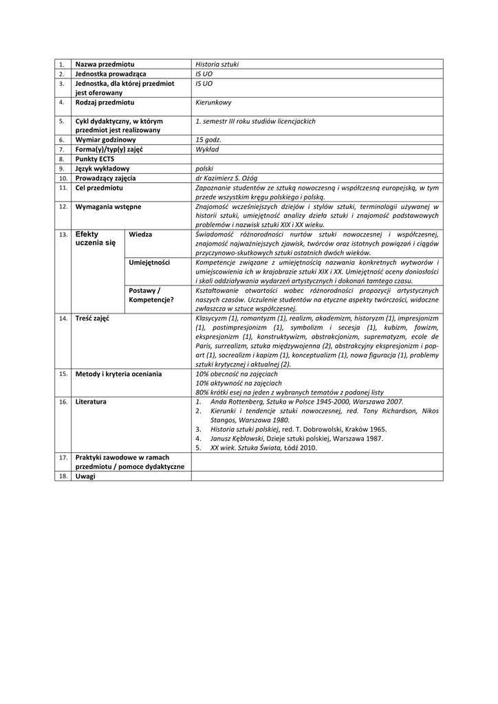 Nazwa przedmiotu Jednostka prowadząca Jednostka, dla której przedmiot jest oferowany Rodzaj przedmiotu Historia sztuki IS UO IS UO 1. semestr III roku studiów licencjackich 6. 7. 8. 9. 10. 11. Cykl dydaktyczny, w którym przedmiot jest realizowany Wymiar godzinowy Forma(y)/typ(y) zajęć Punkty ECTS Język wykładowy Prowadzący zajęcia Cel przedmiotu 12. Wymagania wstępne 13. Efekty uczenia się 1. 2. 3. 4. 5. Wiedza Umiejętności Postawy / Kompetencje? 14. Treść zajęć 15. Metody i kryteria oceniania 16. Literatura 17. Praktyki zawodowe w ramach przedmiotu / pomoce dydaktyczne Uwagi 18. Kierunkowy 15 godz. Wykład polski dr Kazimierz S. Ożóg Zapoznanie studentów ze sztuką nowoczesną i współczesną europejską, w tym przede wszystkim kręgu polskiego i polską. Znajomość wcześniejszych dziejów i stylów sztuki, terminologii używanej w historii sztuki, umiejętność analizy dzieła sztuki i znajomość podstawowych problemów i nazwisk sztuki XIX i XX wieku. Świadomość różnorodności nurtów sztuki nowoczesnej i współczesnej, znajomość najważniejszych zjawisk, twórców oraz istotnych powiązań i ciągów przyczynowo-skutkowych sztuki ostatnich dwóch wieków. Kompetencje związane z umiejętnością nazwania konkretnych wytworów i umiejscowienia ich w krajobrazie sztuki XIX i XX. Umiejętność oceny doniosłości i skali oddziaływania wydarzeń artystycznych i dokonań tamtego czasu. Kształtowanie otwartości wobec różnorodności propozycji artystycznych naszych czasów. Uczulenie studentów na etyczne aspekty twórczości, widoczne zwłaszcza w sztuce współczesnej. Klasycyzm (1), romantyzm (1), realizm, akademizm, historyzm (1), impresjonizm (1), postimpresjonizm (1), symbolizm i secesja (1), kubizm, fowizm, ekspresjonizm (1), konstruktywizm, abstrakcjonizm, suprematyzm, ecole de Paris, surrealizm, sztuka międzywojenna (2), abstrakcyjny ekspresjonizm i popart (1), socrealizm i kapizm (1), konceptualizm (1), nowa figuracja (1), problemy sztuki krytycznej i aktualnej (2). 10% obecność na zajęciach 10% aktywność na zajęciach 80% krótki esej na jeden z wybranych tematów z podanej listy 1. Anda Rottenberg, Sztuka w Polsce 1945-2000, Warszawa 2007. 2. Kierunki i tendencje sztuki nowoczesnej, red. Tony Richardson, Nikos Stangos, Warszawa 1980. 3. Historia sztuki polskiej, red. T. Dobrowolski, Kraków 1965. 4. Janusz Kębłowski, Dzieje sztuki polskiej, Warszawa 1987. 5. XX wiek. Sztuka Świata, Łódź 2010.
