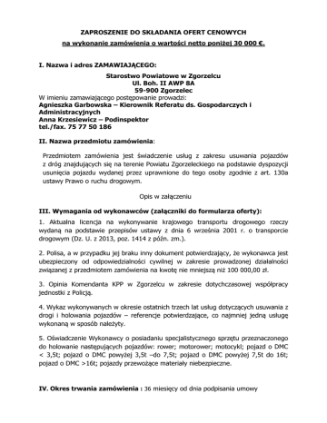 ZAPROSZENIE DO SKŁADANIA OFERT CENOWYCH na wykonanie zamówienia o wartości netto poniżej 30 000 €. I. Nazwa i adres ZAMAWIAJĄCEGO: Starostwo Powiatowe w Zgorzelcu Ul. Boh. II AWP 8A 59-900 Zgorzelec W imieniu zamawiającego postępowanie prowadzi: Agnieszka Garbowska – Kierownik Referatu ds. Gospodarczych i Administracyjnych Anna Krzesiewicz – Podinspektor tel./fax. 75 77 50 186 II. Nazwa przedmiotu zamówienia: Przedmiotem zamówienia jest świadczenie usług z zakresu usuwania pojazdów z dróg znajdujących się na terenie Powiatu Zgorzeleckiego na podstawie dyspozycji usunięcia pojazdu wydanej przez uprawnione do tego osoby zgodnie z art. 130a ustawy Prawo o ruchu drogowym. Opis w załączeniu III. Wymagania od wykonawców (załączniki do formularza oferty): 1. Aktualna licencja na wykonywanie krajowego transportu drogowego rzeczy wydaną na podstawie przepisów ustawy z dnia 6 września 2001 r. o transporcie drogowym (Dz. U. z 2013, poz. 1414 z późn. zm.). 2. Polisa, a w przypadku jej braku inny dokument potwierdzający, że wykonawca jest ubezpieczony od odpowiedzialności cywilnej w zakresie prowadzonej działalności związanej z przedmiotem zamówienia na kwotę nie mniejszą niż 100 000,00 zł. 3. Opinia Komendanta KPP w Zgorzelcu w zakresie dotychczasowej współpracy jednostki z Policją. 4. Wykaz wykonywanych w okresie ostatnich trzech lat usług dotyczących usuwania z drogi i holowania pojazdów – referencje potwierdzające, co najmniej jedną usługę wykonaną w sposób należyty. 5. Oświadczenie Wykonawcy o posiadaniu specjalistycznego sprzętu przeznaczonego do holowanie następujących pojazdów: rower; motorower; motocykl; pojazd o DMC < 3,5t; pojazd o DMC powyżej 3,5t –do 7,5t; pojazd o DMC powyżej 7,5t do 16t; pojazd o DMC >16t; pojazdy przewożące materiały niebezpieczne. IV. Okres trwania zamówienia : 36 miesięcy od dnia podpisania umowy V. Tryb postępowania: ROZPOZNANIE CENOWE. Poniższą ofertę należy: 1. Złożyć w formie pisemnej na adres Zamawiającego na załączonym Formularzu Oferty do dnia 27.08.2015 r. do godziny 12.00 2. Oferty należy opakować w kopertę, opisać: „Rozpoznanie cenowe na świadczenie usług z zakresu usuwania pojazdów z dróg znajdujących się na terenie Powiatu Zgorzeleckiego na podstawie dyspozycji usunięcia pojazdu wydanej przez uprawnione do tego osoby zgodnie z art. 130a ustawy Prawo o ruchu drogowym” i złożyć w siedzibie Zamawiającego: Starostwo Powiatowe w Zgorzelcu Biuro Obsługi Interesanta 3. Wykonawcy zostaną poinformowani o dokonanym wyborze, Wykonawca, który złoży ofertę najkorzystniejszą będzie zobowiązany do podpisania umowy. 4. Kryterium decydującym o wyborze oferty: Ocena nastąpi w skali 0-100 punktów. Zamawiający ustala następujące podkryteria: I – stawka za usunięcie i umieszczenie na parkingu strzeżonym roweru lub motoroweru; II - stawka za usunięcie i umieszczenie na parkingu strzeżonym motocyklu; III - stawka za usunięcie i umieszczenie na parkingu strzeżonym pojazdu o DMC poniżej 3,5t IV - stawka za usunięcie i umieszczenie na parkingu strzeżonym pojazdu o DMC powyżej 3,5t –do 7,5t; V - stawka za usunięcie i umieszczenie na parkingu strzeżonym pojazdu o DMC powyżej 7,5t –do 16t; VI - stawka za usunięcie i umieszczenie na parkingu strzeżonym pojazdu o DMC powyżej 16t; VII - stawka za usunięcie i umieszczenie na parkingu strzeżonym pojazdu przewożącego materiały niebezpieczne. Ważność każdego z kryteriów kształtuje się następująco: I, II. IV, V, VI, VII – 5%; III – 70 %. Sposób oceny ofert zostanie przeprowadzony wg formuły (I,II,III,IV,V,VI,VII) = cena najniższa spośród złożonych ofert/cena badanej ofert x 100. Suma uzyskanych punktów liczona będzie wg wzoru: S = 5%I+5%II+70%III+5%IV+5%V+5%VI+5%VII Zostanie wybrana oferta z największą liczbą punktów i spełniająca wszystkie wymogi. W przypadku gdy kilka ofert uzyska jednakową liczbę punktów zostanie wybrana ta z najniższą ceną jednostkową za usługę określoną w podkryterium III. Opis przedmiotu zamówienia Przedmiotem zamówienia jest świadczenie usług z zakresu usuwania pojazdów z dróg znajdujących się na terenie Powiatu Zgorzeleckiego na podstawie dyspozycji usunięcia pojazdu wydanej przez uprawnione do tego osoby zgodnie z art. 130a ustawy Prawo o ruchu drogowym. Usługa holowania będzie świadczona całodobowo przez 7 dni w tygodniu na podstawie wydanej dyspozycji usunięcia pojazdu. W zakres usługi wchodzą: • dojazd do miejsca zdarzenia; • załadunek, rozładunek i czynności z tym związane; • uprzątnięcie miejsca zdarzenia; • holowanie, przewóz pojazdu na wskazany parking; • zabezpieczenie pojazdu od chwili przekazania go przez uprawnione do tego służby. Miejsce holowania: Zgorzelec ul. Poniatowskiego (parking obok Prokuratury) Do usuwania pojazdu powinien być wykorzystany specjalistyczny sprzęt przeznaczony do holowania następujących pojazdów: rower; motorower; motocykl; pojazd o DMC < 3,5t; pojazd o DMC powyżej 3,5t –do 7,5t; pojazd o DMC powyżej 7,5t do 16t; pojazd o DMC >16t; pojazdy przewożące materiały niebezpieczne. FORMULARZ OFERTY I. Nazwa i adres ZAMAWIAJĄCEGO ............................................................................................................. ……………………….................................................................................... II. Nazwa i adres WYKONAWCY ............................................................................................................................ ............................................................................................................................ ............................................................................................................................ III. Nazwa przedmiotu zamówienia …………………………………………………………………………
