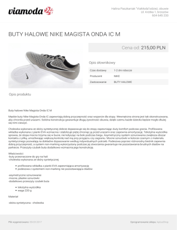 Halina Paszkaniak "ViaModa"odzież, obuwie Ul. Krótka 1, brzozów 604 645 233 BUTY HALOWE NIKE MAGISTA ONDA IC M Cena od: 215,00 PLN Opis słownikowy Czas dostawy 1-2 dni robocze Producent NIKE Zastosowanie BUTY HALOWE Opis produktu Buty halowe Nike Magista Onda IC M Męskie buty Nike Magista Onda IC zapewniają dobrą przyczepność oraz wsparcie dla stopy. Wewnętrzna strona jest tak skonstruowana, aby chroniła przed urazami. Solidna konstrukcja gwarantuje długą żywotność obuwia, dzięki czemu każde dziecko będzie mogło dłużej się nimi cieszyć. Cholewka wykonana ze skóry syntetycznej dobrze dopasowuje się do stopy zapewniając duży komfort podczas grania. Profilowana wkładka wykonana z pianki EVA wzmacnia i stabilizuje piętę chroniąc ją przed urazami oraz zapewnia amortyzację. Tekstylna wyściółka sprawia, że stopa mocno trzyma się w bucie, nie kołysząc na boki podczas biegu. Asymetryczny system sznurowania zwiększa obszar kontaktu z piłką, umożliwiając większą kontrolę nad nią przy przyjęciu czy zagraniu. Mocne sznurówki w kolorze czarnym z materiału syntetycznego pozwalają na dokładne dopasowanie według indywidualnych potrzeb. Podeszwa poprzez różnorodny bieżnik zapewnia dobrą przyczepność, a system non-marking wykorzystany podczas jej stworzenia gwarantuje nie pozostawiania brudnych śladów na parkiecie. Przeszyty czubek buta dodatkowo wzmacnia jego konstrukcję. Właściwości: -buty przeznaczone do gry na hali -cholewka wykonana ze skóry syntetycznej profilowana wkładka z pianki EVA zapewniająca amortyzację podeszwa z systemem non-marking nie pozostawiająca śladów -asymetryczne sznurowanie -mocne, płaskie sznurówki -dodatkowo przeszyty czubek buta tekstylna wyściółka waga 220 g Materiał -skóra syntetyczna - cholewka Plik wygenerowano: 09-03-2017 Oprogramowanie sklepu: AptusShop Halina Paszkaniak "ViaModa"odzież, obuwie Ul. Krótka 1, brzozów 604 645 233 -materiał tekstylny - wyściółka Kolor: odcień koloru brązowego Parametry WYBIERZ ROZMIAR 41, 42, 42 1/2 Warianty produktu Buty halowe Nike Magista Onda IC M 215,00 PLN Buty halowe Nike Magista Onda IC M 651541-010. Plik wygenerowano: 09-03-2017 Oprogramowanie sklepu: AptusShop Halina Paszkaniak "ViaModa"odzież, obuwie Ul. Krótka 1, brzozów 604 645 233 Galeria Plik wygenerowano: 09-03-2017 Powered by TCPDF (www.tcpdf.org) Oprogramowanie sklepu: AptusShop