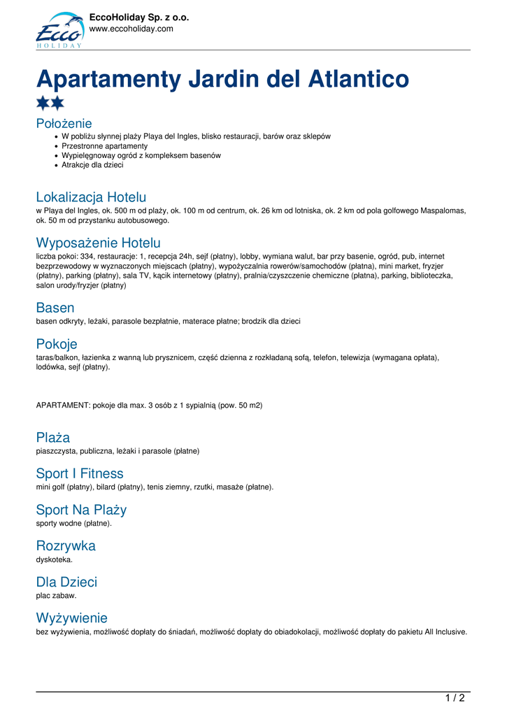 EccoHoliday Sp. z o.o. www.eccoholiday.com Apartamenty Jardin del Atlantico Położenie W pobliżu słynnej plaży Playa del Ingles, blisko restauracji, barów oraz sklepów Przestronne apartamenty Wypielęgnoway ogród z kompleksem basenów Atrakcje dla dzieci Lokalizacja Hotelu w Playa del Ingles, ok. 500 m od plaży, ok. 100 m od centrum, ok. 26 km od lotniska, ok. 2 km od pola golfowego Maspalomas, ok. 50 m od przystanku autobusowego. Wyposażenie Hotelu liczba pokoi: 334, restauracje: 1, recepcja 24h, sejf (płatny), lobby, wymiana walut, bar przy basenie, ogród, pub, internet bezprzewodowy w wyznaczonych miejscach (płatny), wypożyczalnia rowerów/samochodów (płatna), mini market, fryzjer (płatny), parking (płatny), sala TV, kącik internetowy (płatny), pralnia/czyszczenie chemiczne (płatna), parking, biblioteczka, salon urody/fryzjer (płatny) Basen basen odkryty, leżaki, parasole bezpłatnie, materace płatne; brodzik dla dzieci Pokoje taras/balkon, łazienka z wanną lub prysznicem, część dzienna z rozkładaną sofą, telefon, telewizja (wymagana opłata), lodówka, sejf (płatny). APARTAMENT: pokoje dla max. 3 osób z 1 sypialnią (pow. 50 m2) Plaża piaszczysta, publiczna, leżaki i parasole (płatne) Sport I Fitness mini golf (płatny), bilard (płatny), tenis ziemny, rzutki, masaże (płatne). Sport Na Plaży sporty wodne (płatne). Rozrywka dyskoteka. Dla Dzieci plac zabaw. Wyżywienie bez wyżywienia, możliwość dopłaty do śniadań, możliwość dopłaty do obiadokolacji, możliwość dopłaty do pakietu All Inclusive. 1/2 EccoHoliday Sp. z o.o. www.eccoholiday.com All Inclusive Zawiera śniadanie (8.00 - 10.00), lunch (13.00 - 15.00), kolację (18.00 - 20.30) w formie bufetu; kawa, herbata, ciasto (16.00 - 17.00); lokalne napoje bezalkoholowe i alkohole (10.30 - 23.00). Oferta: Wylot 01.01.1970 Powrót 01.01.1970 godz. godz. Zakwaterowanie -() Dni dni Cena os. dorosła 2/2 Powered by TCPDF (www.tcpdf.org)