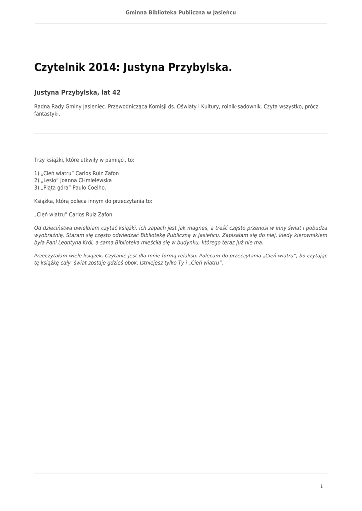 Gminna Biblioteka Publiczna w Jasieńcu Czytelnik 2014: Justyna Przybylska. Justyna Przybylska, lat 42 Radna Rady Gminy Jasieniec. Przewodnicząca Komisji ds. Oświaty i Kultury, rolnik-sadownik. Czyta wszystko, prócz fantastyki. Trzy książki, które utkwiły w pamięci, to: 1) „Cień wiatru” Carlos Ruiz Zafon 2) „Lesio” Joanna CHmielewska 3) „Piąta góra” Paulo Coelho. Książka, którą poleca innym do przeczytania to: „Cień wiatru” Carlos Ruiz Zafon Od dzieciństwa uwielbiam czytać książki, ich zapach jest jak magnes, a treść często przenosi w inny świat i pobudza wyobraźnię. Staram się często odwiedzać Bibliotekę Publiczną w Jasieńcu. Zapisałam się do niej, kiedy kierownikiem była Pani Leontyna Król, a sama Biblioteka mieściła się w budynku, którego teraz już nie ma. Przeczytałam wiele książek. Czytanie jest dla mnie formą relaksu. Polecam do przeczytania „Cień wiatru”, bo czytając tę książkę cały świat zostaje gdzieś obok. Istniejesz tylko Ty i „Cień wiatru”. 1