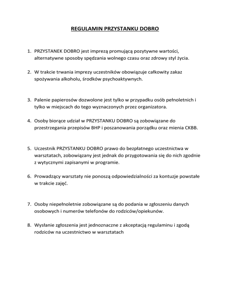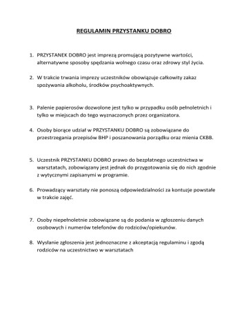 REGULAMIN PRZYSTANKU DOBRO 1. PRZYSTANEK DOBRO jest imprezą promującą pozytywne wartości, alternatywne sposoby spędzania wolnego czasu oraz zdrowy styl życia. 2. W trakcie trwania imprezy uczestników obowiązuje całkowity zakaz spożywania alkoholu, środków psychoaktywnych. 3. Palenie papierosów dozwolone jest tylko w przypadku osób pełnoletnich i tylko w miejscach do tego wyznaczonych przez organizatora. 4. Osoby biorące udział w PRZYSTANKU DOBRO są zobowiązane do przestrzegania przepisów BHP i poszanowania porządku oraz mienia CKBB. 5. Uczestnik PRZYSTANKU DOBRO prawo do bezpłatnego uczestnictwa w warsztatach, zobowiązany jest jednak do przygotowania się do nich zgodnie z wytycznymi zapisanymi w programie. 6. Prowadzący warsztaty nie ponoszą odpowiedzialności za kontuzje powstałe w trakcie zajęć. 7. Osoby niepełnoletnie zobowiązane są do podania w zgłoszeniu danych osobowych i numerów telefonów do rodziców/opiekunów. 8. Wysłanie zgłoszenia jest jednoznaczne z akceptacją regulaminu i zgodą rodziców na uczestnictwo w warsztatach