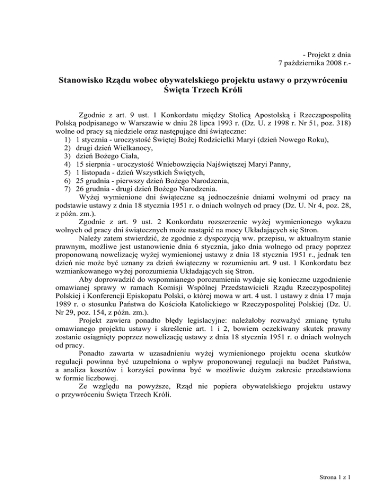 - Projekt z dnia 7 października 2008 r.- Stanowisko Rządu wobec obywatelskiego projektu ustawy o przywróceniu Święta Trzech Króli Zgodnie z art. 9 ust. 1 Konkordatu między Stolicą Apostolską i Rzecząpospolitą Polską podpisanego w Warszawie w dniu 28 lipca 1993 r. (Dz. U. z 1998 r. Nr 51, poz. 318) wolne od pracy są niedziele oraz następujące dni świąteczne: 1) 1 stycznia - uroczystość Świętej Bożej Rodzicielki Maryi (dzień Nowego Roku), 2) drugi dzień Wielkanocy, 3) dzień Bożego Ciała, 4) 15 sierpnia - uroczystość Wniebowzięcia Najświętszej Maryi Panny, 5) 1 listopada - dzień Wszystkich Świętych, 6) 25 grudnia - pierwszy dzień Bożego Narodzenia, 7) 26 grudnia - drugi dzień Bożego Narodzenia. Wyżej wymienione dni świąteczne są jednocześnie dniami wolnymi od pracy na podstawie ustawy z dnia 18 stycznia 1951 r. o dniach wolnych od pracy (Dz. U. Nr 4, poz. 28, z późn. zm.). Zgodnie z art. 9 ust. 2 Konkordatu rozszerzenie wyżej wymienionego wykazu wolnych od pracy dni świątecznych może nastąpić na mocy Układających się Stron. Należy zatem stwierdzić, że zgodnie z dyspozycją ww. przepisu, w aktualnym stanie prawnym, możliwe jest ustanowienie dnia 6 stycznia, jako dnia wolnego od pracy poprzez proponowaną nowelizację wyżej wymienionej ustawy z dnia 18 stycznia 1951 r., jednak ten dzień nie może być uznany za dzień świąteczny w rozumieniu art. 9 ust. 1 Konkordatu bez wzmiankowanego wyżej porozumienia Układających się Stron. Aby doprowadzić do wspomnianego porozumienia wydaje się konieczne uzgodnienie omawianej sprawy w ramach Komisji Wspólnej Przedstawicieli Rządu Rzeczypospolitej Polskiej i Konferencji Episkopatu Polski, o której mowa w art. 4 ust. 1 ustawy z dnia 17 maja 1989 r. o stosunku Państwa do Kościoła Katolickiego w Rzeczypospolitej Polskiej (Dz. U. Nr 29, poz. 154, z późn. zm.). Projekt zawiera ponadto błędy legislacyjne: należałoby rozważyć zmianę tytułu omawianego projektu ustawy i skreślenie art. 1 i 2, bowiem oczekiwany skutek prawny zostanie osiągnięty poprzez nowelizację ustawy z dnia 18 stycznia 1951 r. o dniach wolnych od pracy. Ponadto zawarta w uzasadnieniu wyżej wymienionego projektu ocena skutków regulacji powinna być uzupełniona o wpływ proponowanej regulacji na budżet Państwa, a analiza kosztów i korzyści powinna być w możliwie dużym zakresie przedstawiona w formie liczbowej. Ze względu na powyższe, Rząd nie popiera obywatelskiego projektu ustawy o przywróceniu Święta Trzech Króli. Strona 1 z 1