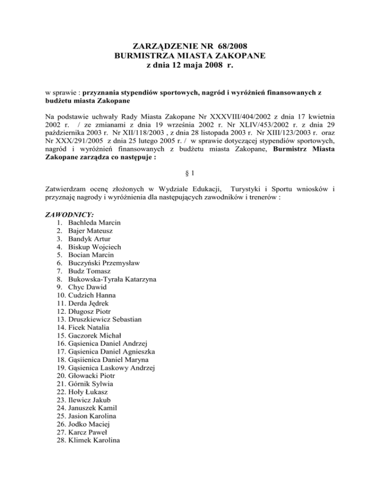 ZARZĄDZENIE NR 68/2008 BURMISTRZA MIASTA ZAKOPANE z dnia 12 maja 2008 r. w sprawie : przyznania stypendiów sportowych, nagród i wyróŜnień finansowanych z budŜetu miasta Zakopane Na podstawie uchwały Rady Miasta Zakopane Nr XXXVIII/404/2002 z dnia 17 kwietnia 2002 r. / ze zmianami z dnia 19 września 2002 r. Nr XLIV/453/2002 r. z dnia 29 października 2003 r. Nr XII/118/2003 , z dnia 28 listopada 2003 r. Nr XIII/123/2003 r. oraz Nr XXX/291/2005 z dnia 25 lutego 2005 r. / w sprawie dotyczącej stypendiów sportowych, nagród i wyróŜnień finansowanych z budŜetu miasta Zakopane, Burmistrz Miasta Zakopane zarządza co następuje : §1 Zatwierdzam ocenę złoŜonych w Wydziale Edukacji, Turystyki i Sportu wniosków i przyznaję nagrody i wyróŜnienia dla następujących zawodników i trenerów : ZAWODNICY: 1. Bachleda Marcin 2. Bajer Mateusz 3. Bandyk Artur 4. Biskup Wojciech 5. Bocian Marcin 6. Buczyński Przemysław 7. Budz Tomasz 8. Bukowska-Tyrała Katarzyna 9. Chyc Dawid 10. Cudzich Hanna 11. Derda Jędrek 12. Długosz Piotr 13. Druszkiewicz Sebastian 14. Ficek Natalia 15. Gaczorek Michał 16. Gąsienica Daniel Andrzej 17. Gąsienica Daniel Agnieszka 18. Gąsiienica Daniel Maryna 19. Gąsienica Laskowy Andrzej 20. Głowacki Piotr 21. Górnik Sylwia 22. Hoły Łukasz 23. Ilewicz Jakub 24. Januszek Kamil 25. Jasion Karolina 26. Jodko Maciej 27. Karcz Paweł 28. Klimek Karolina 29. Kluś Aleksandra 30. Kłusak Jakub 31. Kłusak Michał 32. Kłusak Magdalena 33. Kobylański Krystian 34. Kominko Maciej 35. Kominko Jakub 36. Kot Jakub 37. Kot Maciej 38. Kowalczyk Tomasz 39. Kowal Dawid 40. Kowal Kamil 41. Król Tomasz 42. Król Aleksandra 43. Kubacki Dawid 44. Leśniakiewicz Andrzej 45. Ligocki Mateusz 46. Majerczyk Sabina 47. Małysa Zuzanna 48. Mateja Robert 49. Mąka Marcin 50. Miętus Grzegorz 51. Miętus Krzysztof 52. Mrózek Karolina 53. Murańka Klemens 54. Mus Dominika 55. Niemiec Olga 56. Niedźwiedzki Konrad 57. Osiecka Agnieszka 58. Owczarz Kacper 59. Pająk Izabela 60. Poniński Jan 61. Popieluch Agata 62. Popiołek Grzegorz 63. Pradziad Anna 64. Rutkowski Łukasz 65. Skrobot Kamil 66. Skupień Wojciech 67. Stachoń Barbara 68. Stachoń Maria 69. Stanuch Dariusz 70. Starzyk Paweł 71. Stępel Mateusz 72. Stoch Magdalena 73. Szałas Andrzej 74. Szczecha Maciej 75. Szczepaniak Andrzej 76. Sztokfisz Barbara 77. Sztokfisz Karolina 78. Świder Damian 79. Tylka Tomasz 80. Wiesiołek Aleksandra 81. Wilkus Paulina 82. Wójcicka Agnieszka 83. Wróblewski Michał 84. Zając Agnieszka 85. Złotkowska Luiza 86. śyłka Anna TRENERZY: 1. Bafia Kazimierz 2. Berezik Marta 3. Celej Adam 4. Dawidek Paweł 5. Długopolski Kazimierz 6. Grabowski Eligiusz 7. Holek Zygmunt 8. Jankowicz Piotr 9. Januszek Justyna 10. Jarząbek Józef 11. Kubin Ireneusz 12. Kuczyński Tadeusz 13. Niedźwiedzki Krzysztof 14. Pandyra Marek 15. Pejko Barbara 16. Sitarz Michał jun. 17. Sitarz Michał sen. 18. Skowroński Piotr 19. Starzyk Janusz 20. Szczerba Jolanta 21. Szybkowski Piotr 22. Weselski Włodzimierz 23. Witowski Jerzy 24. Zborowska Marta 25. Zbyszewski Grzegorz §2 Wykonanie zarządzenia zleca się Wydziałowi Edukacji, Turystyki i Sportu. §3 Zarządzenie wchodzi w Ŝycie z dniem podpisania.