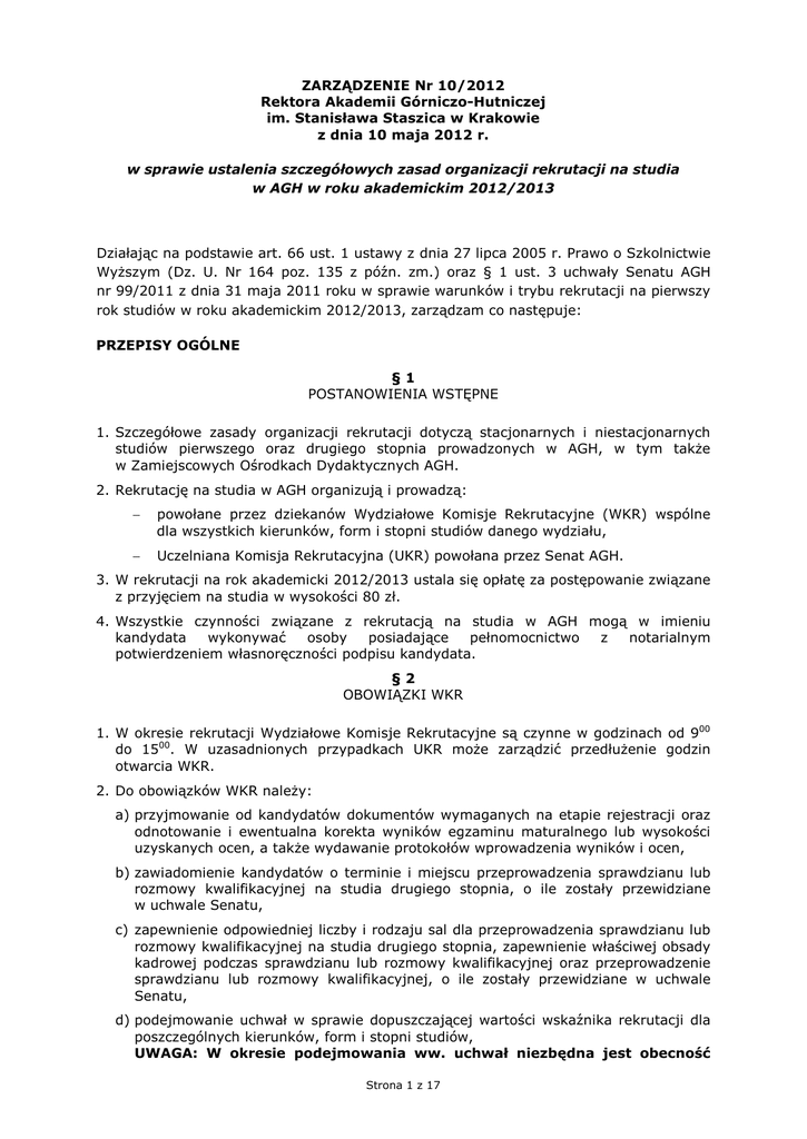 ZARZĄDZENIE Nr 10/2012 Rektora Akademii Górniczo-Hutniczej im. Stanisława Staszica w Krakowie z dnia 10 maja 2012 r. w sprawie ustalenia szczegółowych zasad organizacji rekrutacji na studia w AGH w roku akademickim 2012/2013 Działając na podstawie art. 66 ust. 1 ustawy z dnia 27 lipca 2005 r. Prawo o Szkolnictwie Wyższym (Dz. U. Nr 164 poz. 135 z późn. zm.) oraz § 1 ust. 3 uchwały Senatu AGH nr 99/2011 z dnia 31 maja 2011 roku w sprawie warunków i trybu rekrutacji na pierwszy rok studiów w roku akademickim 2012/2013, zarządzam co następuje: PRZEPISY OGÓLNE §1 POSTANOWIENIA WSTĘPNE 1. Szczegółowe zasady organizacji rekrutacji dotyczą stacjonarnych i niestacjonarnych studiów pierwszego oraz drugiego stopnia prowadzonych w AGH, w tym także w Zamiejscowych Ośrodkach Dydaktycznych AGH. 2. Rekrutację na studia w AGH organizują i prowadzą: powołane przez dziekanów Wydziałowe Komisje Rekrutacyjne (WKR) wspólne dla wszystkich kierunków, form i stopni studiów danego wydziału, Uczelniana Komisja Rekrutacyjna (UKR) powołana przez Senat AGH. 3. W rekrutacji na rok akademicki 2012/2013 ustala się opłatę za postępowanie związane z przyjęciem na studia w wysokości 80 zł. 4. Wszystkie czynności związane z rekrutacją na studia w AGH mogą w imieniu kandydata wykonywać osoby posiadające pełnomocnictwo z notarialnym potwierdzeniem własnoręczności podpisu kandydata. §2 OBOWIĄZKI WKR 1. W okresie rekrutacji Wydziałowe Komisje Rekrutacyjne są czynne w godzinach od 900 do 1500. W uzasadnionych przypadkach UKR może zarządzić przedłużenie godzin otwarcia WKR. 2. Do obowiązków WKR należy: a) przyjmowanie od kandydatów dokumentów wymaganych na etapie rejestracji oraz odnotowanie i ewentualna korekta wyników egzaminu maturalnego lub wysokości uzyskanych ocen, a także wydawanie protokołów wprowadzenia wyników i ocen, b) zawiadomienie kandydatów o terminie i miejscu przeprowadzenia sprawdzianu lub rozmowy kwalifikacyjnej na studia drugiego stopnia, o ile zostały przewidziane w uchwale Senatu, c) zapewnienie odpowiedniej liczby i rodzaju sal dla przeprowadzenia sprawdzianu lub rozmowy kwalifikacyjnej na studia drugiego stopnia, zapewnienie właściwej obsady kadrowej podczas sprawdzianu lub rozmowy kwalifikacyjnej oraz przeprowadzenie sprawdzianu lub rozmowy kwalifikacyjnej, o ile zostały przewidziane w uchwale Senatu, d) podejmowanie uchwał w sprawie dopuszczającej wartości wskaźnika rekrutacji dla poszczególnych kierunków, form i stopni studiów, UWAGA: W okresie podejmowania ww. uchwał niezbędna jest obecność Strona 1 z 17 przewodniczącego lub jego zastępcy, a także sekretarza WKR, e) podanie do publicznej wiadomości wyników rekrutacji, f) przyjmowanie od kandydatów podań i innych wymaganych w procesie rekrutacji dokumentów oraz potwierdzanie za zgodność z oryginałem wymaganych kopii dokumentów, g) kontrola poprawności danych kandydata zawartych w systemie e-Rekrutacja, h) wydawanie decyzji o przyjęciu na studia, dokonywanie wpisu kandydatów na studia oraz wydawanie poświadczeń o dokonaniu wpisu, i) przyjmowanie od wpisanych kandydatów wniosków o przyznanie miejsca w domu studenckim oraz o udzielenie pomocy materialnej wraz z wymaganymi załącznikami. 3. Wydziałowe Komisje Rekrutacyjne zobowiązane są do wykonywania powyższych obowiązków w terminach ujętych w kalendarium rekrutacji, chyba, że wydział nie prowadzi w danym okresie rekrutacji na żaden kierunek studiów. W okresie urlopowym (sierpień) Wydziałowe Komisje Rekrutacyjne zawieszają dyżury. §3 OBOWIĄZKI UKR 1. Uczelniana Komisja Rekrutacyjna sprawuje nadzór nad przebiegiem rekrutacji. 2. W okresie rekrutacji Uczelniana Komisja Rekrutacyjna jest czynna w godzinach od 900 do 1500. 3. Do obowiązków UKR należy: a) kontrola przestrzegania przez WKR warunków i trybu rekrutacji, b) przeprowadzenie egzaminu kwalifikacyjnego z matematyki dla kandydatów, którzy posiadają świadectwo „starej” matury i przystępują do rekrutacji na studia stacjonarne pierwszego stopnia, a także studia niestacjonarne pierwszego stopnia, o ile zadeklarowali przystąpienie do tego egzaminu, c) wprowadzenie do systemu z matematyki, e-Rekrutacja wyników egzaminu kwalifikacyjnego d) identyfikacja niezarejestrowanych automatycznie w systemie e-Rekrutacja opłat rekrutacyjnych oraz opłat za legitymację studencką, e) przeliczanie wyników i wykształcenie za granicą, ocen w przypadku kandydatów, którzy uzyskali f) nadzór formalny nad przeprowadzeniem sprawdzianu kwalifikacyjnego lub rozmowy kwalifikacyjnej na studia drugiego stopnia, g) zatwierdzanie list rankingowych kandydatów na poszczególne kierunki studiów, h) przyjmowanie od kandydatów odwołań i zastrzeżeń dotyczących postępowania kwalifikacyjnego przeprowadzonego przez WKR, ocena podniesionych przez kandydatów naruszeń warunków i trybu rekrutacji na studia oraz wydawanie decyzji w sprawie podtrzymania lub uchylenia decyzji WKR, ewentualnie postanowień w sprawie uwzględnienia lub nieuwzględnienia zastrzeżeń, i) sprawozdawczość. 4. Uczelniana Komisja Rekrutacyjna zobowiązana jest do wykonywana powyższych obowiązków w terminach ujętych w kalendarium rekrutacji. W okresie urlopowym (sierpień) Uczelniana Komisja Rekrutacyjna zawiesza dyżury. Strona 2 z 17 PRZEPISY SZCZEGÓŁOWE §4 KALENDARIUM REKRUTACJI W okresie rekrutacji na studia w roku akademickim 2012/2013 będą obowiązywały następujące terminy: 1. Dla studiów stacjonarnych pierwszego stopnia: a) Rejestracja w internetowym systemie e-Rekrutacja osób, które posiadają świadectwo starej matury i ubiegają się o przyjęcie na studia na podstawie przeprowadzonego na AGH egzaminu kwalifikacyjnego z matematyki: b) Egzamin kwalifikacyjny z matematyki: c) Rejestracja pozostałych osób w systemie e-Rekrutacja: d) Przyjmowanie w WKR dokumentów od osób, które poddają się kwalifikacji na podstawie dyplomu olimpiady p