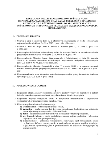 Załącznik nr 1 do Zarządzenia Nr 179/2016 Prezydenta Miasta Konina z dnia 22 grudnia 2016 r. REGULAMIN ROZLICZANIA KOSZTÓW ZUŻYCIA WODY, ODPROWADZANIA ŚCIEKÓW ORAZ ZASAD USTALANIA ODPŁATNOŚCI Z TEGO TYTUŁU UŻYTKOWNIKOM LOKALI MIESZKALNYCH I UŻYTKOWYCH W BUDYNKACH I LOKALACH BĘDĄCYCH WŁASNOŚCIĄ MIASTA KONINA I. PODSTAWA PRAWNA 1. Ustawa z dnia 7 czerwca 2001 r. o zbiorowym zaopatrzeniu w wodę i zbiorowym odprowadzaniu ścieków ( Dz. U. z 2015 r. poz.139 z późn. zm.) 2. Ustawa z dnia 11 maja 2001 r. Prawo o miarach (Dz. U. z 2016 r. poz. 884 z późn. zm.) 3. Rozporządzenie Ministra Infrastruktury z dnia 14 stycznia 2002 r. w sprawie określenia przeciętnych norm zużycia wody (Dz. U. z 2002 r. Nr 8, poz. 70) 4. Rozporządzenie Ministra Spraw Wewnętrznych i Administracji z dnia 16 sierpnia 1999 r. w sprawie warunków technicznych użytkowania budynków mieszkalnych (Dz. U. z 1999 r. Nr 74, poz. 836 z późn. zm.) 5. Rozporządzenie Ministra Gospodarki z dnia 7 stycznia 2008 r. w sprawie prawnej kontroli metrologicznej przyrządów pomiarowych (Dz. U. 2008 r. Nr 5, poz.29 z późn. zm.) 6. Ustawa o ochronie praw lokatorów, mieszkaniowym zasobie gminy i o zmianie Kodeksu cywilnego (Dz. U. z 2016 r. poz. 1610). II. POSTANOWIENIA OGÓLNE §1 1. Regulamin określa zasady rozliczenia kosztów dostawy wody do budynków i odbiór ścieków oraz dokonywania rozliczeń z użytkownikami lokali z tego tytułu. 2. Regulamin dotyczy wszystkich lokali w budynkach mieszkalnych i użytkowych wyposażonych w instalację wodno-kanalizacyjną. 3. Użyte w regulaminie określenia oznaczają: 1) Miasto Konin – właściciel budynku i lokalu, 2) zarządca – osoba prawna lub fizyczna zarządzająca budynkiem na podstawie zawartej umowy o zarządzanie z Miastem Konin. 3) lokal – lokal mieszkalny lub użytkowy niezależnie od formy posiadania, 4) użytkownik lokalu – osoba posiadająca umowę najmu, podnajmu lub osoba zajmująca lokal bez tytułu prawnego, 5) nieruchomość – jednostka rozliczeniowa stanowiąca ogół rozliczanych lokali w budynku, których zaopatrywanie w wodę odbywa się przez wspólną instalację, a jej pomiar rejestrowany jest w pomieszczeniu na przyłączu obsługującym tę nieruchomość, 1 6) układ pomiarowo-rozliczeniowy – dopuszczone do stosowania, zgodnie z odrębnymi przepisami wodomierze instalowane przez dostawcę wody i odbiorcę ścieków, służące do pomiaru ilości wody i odprowadzenia ścieków, których odczyty stanowią podstawę do obliczenia należności z tego tytułu z nieruchomości, 7) dostawca- Przedsiębiorstwo Wodociągów i Kanalizacji Spółka z o.o. w Koninie, 8) okres rozliczeniowy – 6 miesięcy (styczeń - czerwiec, lipiec - grudzień) 4. Za lokal wyposażony w wodomierze uznaje się lokal mieszkalny, użytkowy lub inne pomieszczenie, w którym zamontowane są przyrządy pomiarowe w rozumieniu Ustawy z dnia 11 maja 2001 r. Prawo o miarach, to znaczy posiadające: a) ważną legalizację Głównego Urzędu Miar; okres ważności wynosi zarówno dla wodomierzy wody zimnej jak i ciepłej – 5 lat licząc od 1 stycznia roku następnego po roku, w którym legalizacja została dokonana. b) nienaruszoną plombę na połączeniu śrubunkowym wodomierza z przyłączem wodnym, zabezpieczającą przed nieuprawnionym zdjęciem przyrządu lub nielegalnym rozszczelnieniem połączenia. 5. Do urządzeń pomiarowych służących do podziału kosztów zużytej wody wykorzystuje się wodomierze główne zamontowane na przyłączach wody zimnej do budynków oraz wodomierze indywidualne wody zimnej i ciepłej. §2 1. Koszty dostawy zimnej i ciepłej wody do zasobów Miasta Konin podlegają rozliczeniu na każdy lokal według wskazań zamontowanych urządzeń pomiarowych lub norm zużycia wody na osobę w przypadku braku wodomierza. 2. Rozliczenie kosztów zużytej wody i odprowadzania ścieków między Dostawcą a Miastem Konin wykonywane jest dla poszczególnych budynków lub węzłów cieplnych na podstawie wskazań wodomierzy głównych zamontowanych na przyłączach wody zimnej do budynków. 3. Rozliczenie za zużytą wodę między Miastem Konin a Użytkownikiem następuje według wskazań wodomierzy indywidualnych lub norm zużycia wody na osobę w przypadku braku wodomierza. 4. Koszty powstałe z powodu różnic we wskazaniach wodomierza głównego oraz sumy wskazań wodomierzy indywidualnych lub norm zużycia wody na osobę w przypadku braku wodomierza wody ciepłej i zimnej wszystkich lokali, zostaną doliczone w rozliczeniu na poszczególne lokale w ilości proporcjonalnej do zużycia wykazanego przez wodomierze indywidualne lub norm zużycia wody na osobę w przypadku braku wodomierza. 5. Ilość odprowadzanych ścieków z lokalu jest równa ilości zużytej wody określonej w ust.3 i 4. 2 §3 1. Przez cenę wody rozumie się opłatę za 1 m3 wody pobieranej z urządzeń zbiorowego zaopatrzenia, ustaloną w taryfie opłat za dostawę wody i odbiór ścieków na terenie Miasta Konina. 2. Przez cenę odprowadzania ścieków rozumie się opłatę za 1 m3 ścieków do urządzeń kanalizacyjnych, ustaloną w taryfie opłat za dostawę wody i odbiór ścieków na terenie Miasta Konina. III. OBOWIĄZKI UŻYTKOWNIKA LOKALU I ZARZĄDCY §4 1. Użytkownik lokalu zobowiązany jest: a) Zapewnić, osobie przeprowadzającej odczyt swobodny dostęp do układów pomiarowo – rozliczeniowych, w celu dokonania odczytu, b) nie dokonywać montażu ani wymiany wodomierza we własnym zakresie, c) nie dokonywać zmiany usytuowania wodomierza nawet jeżeli nie prowadzi to do uszkodzenia plomb montażowych, d) zachować oplombowanie wodomierza w stanie nienaruszonym przez cały okres jego eksploatacji – za zerwanie plomby odpowiada Użytkownik lokalu, e) niezwłocznie zgłaszać zarządcy, pisemnie lub osobiście zauważone przypadki uszkodzenia lub nieprawidłowości wskazań wodomierza. 2. Do obowiązków Zarządcy należy: a) obsługa zainstalowanyc