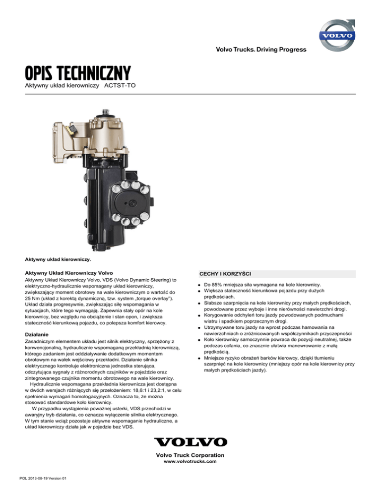 OPIS TECHNICZNY Aktywny układ kierowniczy ACTST-TO Aktywny układ kierowniczy. Aktywny Układ Kierowniczy Volvo CECHY I KORZYŚCI Aktywny Układ Kierowniczy Volvo, VDS (Volvo Dynamic Steering) to elektryczno-hydraulicznie wspomagany układ kierowniczy, zwiększający moment obrotowy na wale kierowniczym o wartość do 25 Nm (układ z korektą dynamiczną, tzw. system „torque overlay”). Układ działa progresywnie, zwiększając siłę wspomagania w sytuacjach, które tego wymagają. Zapewnia stały opór na kole kierownicy, bez względu na obciążenie i stan opon, i zwiększa stateczność kierunkową pojazdu, co polepsza komfort kierowcy. Działanie Zasadniczym elementem układu jest silnik elektryczny, sprzężony z konwencjonalną, hydraulicznie wspomaganą przekładnią kierowniczą, którego zadaniem jest oddziaływanie dodatkowym momentem obrotowym na wałek wejściowy przekładni. Działanie silnika elektrycznego kontroluje elektroniczna jednostka sterująca, odczytująca sygnały z różnorodnych czujników w pojeździe oraz zintegrowanego czujnika momentu obrotowego na wale kierownicy. Hydraulicznie wspomagana przekładnia kierownicza jest dostępna w dwóch wersjach różniących się przełożeniem: 18,6:1 i 23,2:1, w celu spełnienia wymagań homologacyjnych. Oznacza to, że można stosować standardowe koło kierownicy. W przypadku wystąpienia poważnej usterki, VDS przechodzi w awaryjny tryb działania, co oznacza wyłączenie silnika elektrycznego. W tym stanie wciąż pozostaje aktywne wspomaganie hydrauliczne, a układ kierowniczy działa jak w pojedzie bez VDS. Do 85% mniejsza siła wymagana na kole kierownicy. Większa stateczność kierunkowa pojazdu przy dużych prędkościach. Słabsze szarpnięcia na kole kierownicy przy małych prędkościach, powodowane przez wyboje i inne nierówności nawierzchni drogi. Korygowanie odchyleń toru jazdy powodowanych podmuchami wiatru i spadkiem poprzecznym drogi. Utrzymywane toru jazdy na wprost podczas hamowania na nawierzchniach o zróżnicowanych współczynnikach przyczepności Koło kierownicy samoczynnie powraca do pozycji neutralnej, także podczas cofania, co znacznie ułatwia manewrowanie z małą prędkością. Mniejsze ryzyko obrażeń barków kierowcy, dzięki tłumieniu szarpnięć na kole kierownicy (mniejszy opór na kole kierownicy przy małych prędkościach jazdy). Volvo Truck Corporation www.volvotrucks.com POL 2013-08-19 Version 01