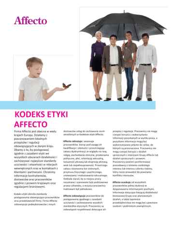 KODEKS ETYKI AFFECTO Firma Affecto jest obecna w wielu krajach Europy. Działamy z poszanowaniem lokalnych przepisów i regulacji obowiązujących w danym kraju. Dbamy o to, by postępować zgodnie z zasadami etyki we wszystkich obszarach działalności i zachowywać najwyższe standardy uczciwości i otwartości w relacjach wewnętrznych oraz w kontaktach z klientami i partnerami. Chronimy informacje kontrahentów, dostawców oraz pracowników zgodnie z prawem krajowym oraz regulacjami branżowymi. Kodeks etyki określa standardy postępowania obowiązujące pracowników oraz przedstawicieli firmy. Firma Affecto zobowiązuje podwykonawców i innych dostawców usług do zachowania norm określonych w Kodeksie etyki Affecto. Affecto rekrutuje i awansuje pracowników, biorąc pod uwagę ich kwalifikacje i zdolności i przestrzegając zakazu dyskryminacji ze względu na rasę, religię, pochodzenie etniczne, przekonania polityczne, płeć, orientację seksualną, tożsamość płciową lub ekspresję płciową, wiek lub niepełnosprawność. Przestrzega zakazu stosowania kar cielesnych, przymusu fizycznego i psychicznego, znieważania i molestowania seksualnego. Dokłada starań, by w miejscu pracy rozumiane i szanowane były podstawowe prawa człowieka, a wszyscy pracownicy traktowani byli jednakowo. Affecto zobowiązuje pracowników do postępowania zgodnego z zasadami uczciwości i zachowywania wysokich standardów etycznych. Pracownicy są zobowiązani respektować dotyczące ich przepisy i regulacje. Pracownicy nie mogą czerpać korzyści z wykorzystania informacji pozyskanych w wyniku pracy, a pozyskane informacje mogą być wykorzystywane jedynie do celów, do których są przeznaczone. Pracownicy nie mogą czerpać korzyści z działań sprzecznych z interesem Grupy Affecto lub działań sprzecznych z prawem. Pracownicy powinni poinformować pracodawcę o istnieniu osobistego interesu lub interesu członka rodziny, który może prowadzić do powstania konfliktu interesów. Affecto oczekuje od wszystkich pracowników pełnej dyskrecji w dysponowaniu informacjami poufnymi. Informacje dotyczące bieżącej działalności biznesowej Grupy oraz planowanych działań, a także tajemnice przedsiębiorstwa nie mogą być ujawniane osobom i podmiotom zewnętrznym. Affecto kładzie szczególny nacisk na dochowywanie zasad uczciwej konkurencji zgodnie z obowiązującym prawem. Pracownicy są zobowiązani do przestrzegania zasad uczciwej konkurencji w prowadzeniu działań biznesowych. Grupa nie podejmuje się zadań mających na celu wprowadzenie odbiorców w błąd w kwestiach społecznych, środowiskowych lub związanych z prawami człowieka. Affecto nie dopuszcza możliwości wręczania łapówek oraz korzyści majątkowych o charakterze korupcyjnym zainteresowanym osobom trzecim, w tym instytucjom rządowym, kontrahentom lub przedstawicielom kontrahentów. Nie dopuszcza również przyjmowania korzyści o charakterze korupcyjnym oraz zabrania wręczania upominków służących do pozyskania przychylności i zapewnienia pomyślnego wyniku transakcji. Dopuszcza się oferowanie osobie trzeciej upominków lub innych korzyści o wartości symbolicznej zgodnie z zasadami gościnności w toku zwykłych działań operacyjnych. Affecto nie przyjmuje od dostawców i innych osób trzecich jakichkolwiek produktów i usług o wartości przekraczającej wartość symboliczną. Nie może zaistnieć jakikolwiek osobisty lub rodzinny konflikt interesów między pracownikiem a firmą lub dostawcami i innymi partnerami biznesowymi. Affecto nie podejmuje współpracy z partnerami wykorzystującymi w działalności pracę dzieci. Affecto wspiera ochronę środowiska w szerokim rozumieniu tego słowa oraz zdaje sobie sprawę, że zasoby naturalne nie są nieskończone i powinny być użytkowane z rozwagą. Nasz wpływ na środowisko ogranicza się przede wszystkim do prowadzenia biura oraz podróży służbowych. Affecto zapewnia pracownikom bezpieczne warunki i środowisko pracy. Affecto powstrzymuje się od darowizn pieniężnych na rzecz polityków i kandydatów na stanowiska polityczne, a także od udzielania innego wsparcia partiom i stowarzyszeniom o charakterze politycznym. Nie można wykorzystywać zasobów należących do Grupy Affecto do działań na rzecz partii politycznych i indywidualnych polityków. Wszystkie rachunki, faktury i pozostała dokumentacja należąca do Affecto powinna być sporządzana z najwyższą dokładnością i przechowywana w całości. Nie należy wystawiać rachunków niepodlegających ujawnieniu w księgach w celu ukrycia niewłaściwych wpłat. Wszystkie przychody, wydatki, aktywa i pasywa powinny być dokumentowane w księdze głównej. Ewidencja księgowa, zestawienia kosztów, faktury i pozostała dokumentacja biznesowa powinny być wypełnione w całości i dokładnie, właściwie przechowywane oraz rzetelnie raportowane i rejestrowane. Naruszenie postanowień niniejszego kodeksu może skutkować wszczęciem postępowania dyscyplinarnego oraz wydaleniem z pracy. Affecto zobowiązuje się działać na rzecz rozwiązania problemów związanych z bezprawnym, niewłaściwym lub nieetycznym postępowaniem w miejscu pracy (lub związanym z pracą) zgłoszonym przez pracowników. Wszelkie zidentyfikowane problemy należy zgłaszać menedżerom krajowym, menedżerom Grupy lub działowi HR. @