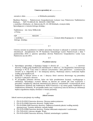 1 Umowa sprzedaży nr …………… zawarta w dniu ………………. w Kłobucku pomiędzy: Skarbem Państwa - Państwowym Gospodarstwem Leśnym Lasy Państwowe Nadleśnictwo Kłobuck , NIP 574-000-69-30, REGON 150027008 z siedzibą w Kłobucku ul. Zakrzewska 85, 42-100 Kłobuck, zwanym dalej Sprzedającym w imieniu którego działają : Nadleśniczy – inż. Jerzy Miłkowski a Firmą : …………………………………….. NIP ………………… , REGON ……………………… z siedzibą w ………………………………………., zwanym dalej Kupującym, w imieniu którego działają : ……………………………………. §1 Umowę zawarto na podstawie wyników procedury licytacji w aukcjach w systemie e-drewno określonych Zarządzeniem Nr 49 Dyrektora Generalnego Lasów Państwowych z dnia 7 października 2010 w sprawie sprzedaży drewna Państwowe Gospodarstwo Leśne Lasy Państwowe na rok 2011. §2 Przedmiot umowy 1. Sprzedający sprzedaje, a Kupujący kupuje w okresie od ……….. do ……….. r. surowiec drzewny według grup handlowych określonych w tabeli nr 1 do Regulaminu internetowego przetargu w PL-D. Ceny netto w zakresie sortymentów i klas jakościowo - wymiarowych zawarte są w załączniku nr 1 do niniejszej umowy. Realizacja umowy rozliczana będzie według grup handlowych. 2. Załącznik, o którym mowa w ust. 1 dotyczy ilości surowca drzewnego wg procedury licytacji w aukcjach e-drewno. 3. W przypadku pobrania drewna, które nie było przedmiotem licytacji, wynikającego z reklamacji, Sprzedający wystawi fakturę za drewno po cenach jak cena wyjściowa z procedury zasadniczej rokowań internetowych (dotyczy sortymentów wystawionych przez Nadleśnictwo Kłobuck lub Nadleśnictw RDLP Katowice z tej samej grupy Nadleśnictw co Nadleśnictwo Kłobuck). W przypadku braku ceny wyjściowej cena na drewno po reklamacji będzie uzgodniona między stronami w formie pisemnej. §3 Jakość towaru Jakość surowca przyjmuje się według: 1. PN-91/D-95019 Surowiec drzewny. Drewno małowymiarowe 2. PN-91/D-95009 Surowiec drzewny. Zrębki leśne 3. PN-D-02006:2000 Surowiec drzewny. Odbiorcza kontrola jakości według metody alternatywnej. Terminy definicje, metody badań. 4. PN-93/D-95000 Surowiec drzewny. Pomiar obliczanie miąższości i cechowanie. 5. PN-79/D-01011 drewno okrągłe. Wady. 6. PN-93/D-02002 Surowiec drzewny. Podział, terminologia i symbole. 2 7. Zarządzenie DGLP o obmiarze drewna M2Z. Przedmiotem sprzedaży jest całość drewna (M2Z) w postaci całych drzewek so ( z domieszką innych iglastych i liściastych) z młodników zniszczonych okiścią w leśnictwie …………………..oddz. ……………. Młodniki- z uwagi na rozmiar uszkodzeń - przeznaczone zostały do odnowienia. Uprzątnięcie całości drewna i wyrób zrębków na cele energetyczne odbędzie się kosztem i staraniem nabywcy. Po podpisaniu umowy sprzedaży nastąpi protokolarne przekazanie powierzchni firmie, która wygrała aukcję, w celu rozpoczęcia prac. Po zakończeniu prac nastąpi komisyjny odbiór powierzchni, która powinna być w stanie pozwalającym na wykonanie przez Nadleśnictwo dalszych prac związanych z odnowieniem powierzchni (orka pługiem lesnym) . Obmiar i sprzedaż przez Nadleśnictwo surowca będą się odbywać na kontenerze (środku transportowym), sukcesywnie, przy zastosowaniu zamiennika 1mp = 0,46 m3 . Termin zakończenia prac ustala się na ………………… roku. Wystawiona na sprzedaż masa łączna ………. m3 jest masą szacunkową i może ulec zmianie (planuje się odchyłkę +/- 30 %) . a) b) c) d) §4 Baza sprzedaży Ceny sprzedaży ustalono na warunkach „Ex Works” (loco las po zrywce). Kupujący wyraża zgodę na odbiór drewna z miejsca (leśnictwa) wskazanego przez Sprzedającego Koszty transportu obciążają Kupującego. Ceny za surowiec nie zawierają podatku VAT. §5 Realizacja harmonogramu sprzedaży, kary umowne za niedotrzymanie harmonogramu sprzedaży/ zakupu 1. Odbiór i przygotowanie drewna powinno następować zgodnie z harmonogramami ustalonymi przez strony. Zmiany do ustalonego harmonogramu wymagają formy pisemnej i są możliwe do wprowadzenia za zgodą stron. Umowę uważa się za zrealizowaną przyjmując tolerancję + / - 30% masy drewna. 2. Sprzedający i Kupujący zobowiązują się do właściwej realizacji harmonogramów sprzedaży/zakupów. Nieodebranie surowca drzewnego przez Kupującego, zgodnie z harmonogramem, z jego winy, może spowodować zmniejszenie przez Sprzedającego masy drewna do sprzedaży o wielkość jaka nie została odebrana. 3 W przypadku nie wykonania umowy zgodnie z opisem aukcji Kupujący zapłaci Sprzedającemu 1% wartości umowy za każdy 1% niewykonanej powierzchni. Klauzula transportowa 1. Transport surowca drzewnego organizowany jest przez Kupującego. 2. Odbioru drewna Kupujący lub upoważniony przez Kupującego przewoźnik dokonuje własnym środkiem transportowym i na własny koszt w terminie ustalonym zgodnie z przedmiotową umową. Potwierdzeniem odbioru drewna przez Kupującego jest jego podpis lub podpis pisemnie upoważnionego (oryginał) przez Kupującego przewoźnika na kwicie wywozowym, który jest jedynym dokumentem wydania drewna z lasu. Załadunek odbywa się środkami i na koszt Kupującego. 3. Strony ustalają, że wszystkie sprawy związane z przepisami Prawa o Ruchu Drogowym, Bezpieczeństwem i Higieną Pracy oraz Ochroną Przeciwpożarową Lasu, przy wykonywaniu prac wynikających z Umowy spoczywają na Kupującym. 4. 3 Kupujący odpowiada wobec Sprzedającego jak i osób trzecich za wszelkie szkody spowodowane na ich mieniu i osobach, w tym jest odpowiedzialny za nadmierne niszczenie dróg publicznych i wewnętrznych z tytułu wywozu drewna w okresach dużego uwilgotnienia terenu oraz odpowiada za zanieczyszczenie w/w dróg ziemia lub błotem nawożonym przez samochody przewoźników lub własne wyjeżdżające z dróg leśnych na 