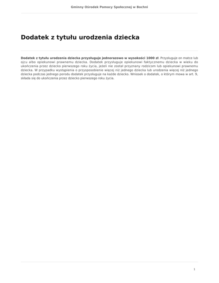 Gminny Ośrodek Pomocy Społecznej w Bochni Dodatek z tytułu urodzenia dziecka Dodatek z tytułu urodzenia dziecka przysługuje jednorazowo w wysokości 1000 zł. Przysługuje on matce lub ojcu albo opiekunowi prawnemu dziecka. Dodatek przysługuje opiekunowi faktycznemu dziecka w wieku do ukończenia przez dziecko pierwszego roku życia, jeżeli nie został przyznany rodzicom lub opiekunowi prawnemu dziecka. W przypadku wystąpienia o przysposobienie więcej niż jednego dziecka lub urodzenia więcej niż jednego dziecka podczas jednego porodu dodatek przysługuje na każde dziecko. Wniosek o dodatek, o którym mowa w art. 9, składa się do ukończenia przez dziecko pierwszego roku życia. 1