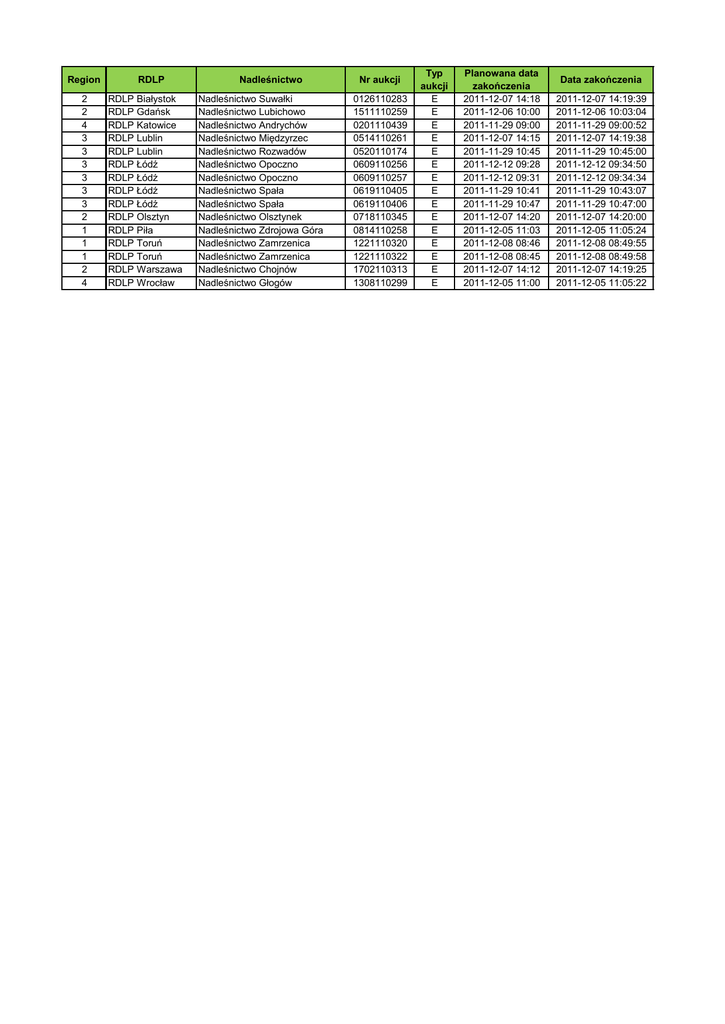 Region 2 2 4 3 3 3 3 3 3 2 1 1 1 2 4 RDLP RDLP Białystok RDLP Gdańsk RDLP Katowice RDLP Lublin RDLP Lublin RDLP Łódź RDLP Łódź RDLP Łódź RDLP Łódź RDLP Olsztyn RDLP Piła RDLP Toruń RDLP Toruń RDLP Warszawa RDLP Wrocław Nadleśnictwo Nadleśnictwo Suwałki Nadleśnictwo Lubichowo Nadleśnictwo Andrychów Nadleśnictwo Międzyrzec Nadleśnictwo Rozwadów Nadleśnictwo Opoczno Nadleśnictwo Opoczno Nadleśnictwo Spała Nadleśnictwo Spała Nadleśnictwo Olsztynek Nadleśnictwo Zdrojowa Góra Nadleśnictwo Zamrzenica Nadleśnictwo Zamrzenica Nadleśnictwo Chojnów Nadleśnictwo Głogów Nr aukcji 0126110283 1511110259 0201110439 0514110261 0520110174 0609110256 0609110257 0619110405 0619110406 0718110345 0814110258 1221110320 1221110322 1702110313 1308110299 Typ aukcji E E E E E E E E E E E E E E E Planowana data zakończenia 2011-12-07 14:18 2011-12-06 10:00 2011-11-29 09:00 2011-12-07 14:15 2011-11-29 10:45 2011-12-12 09:28 2011-12-12 09:31 2011-11-29 10:41 2011-11-29 10:47 2011-12-07 14:20 2011-12-05 11:03 2011-12-08 08:46 2011-12-08 08:45 2011-12-07 14:12 2011-12-05 11:00 Data zakończenia 2011-12-07 14:19:39 2011-12-06 10:03:04 2011-11-29 09:00:52 2011-12-07 14:19:38 2011-11-29 10:45:00 2011-12-12 09:34:50 2011-12-12 09:34:34 2011-11-29 10:43:07 2011-11-29 10:47:00 2011-12-07 14:20:00 2011-12-05 11:05:24 2011-12-08 08:49:55 2011-12-08 08:49:58 2011-12-07 14:19:25 2011-12-05 11:05:22