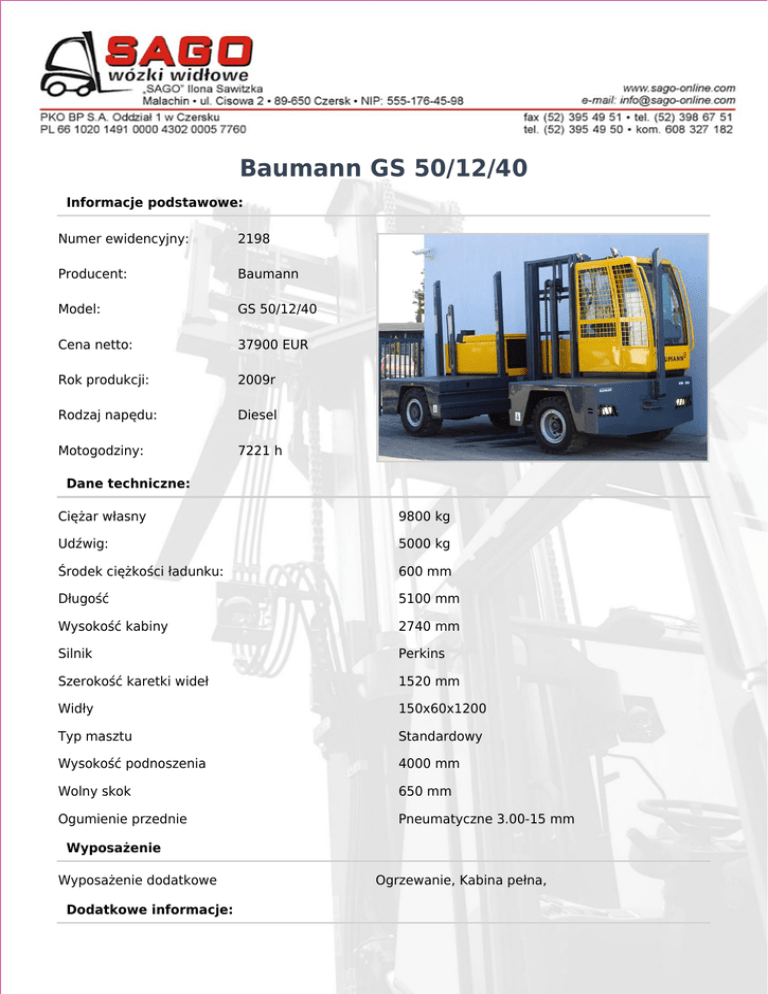 Baumann GS 50/12/40 Informacje podstawowe: Numer ewidencyjny: 2198 Producent: Baumann Model: GS 50/12/40 Cena netto: 37900 EUR Rok produkcji: 2009r Rodzaj napędu: Diesel Motogodziny: 7221 h Dane techniczne: Ciężar własny 9800 kg Udźwig: 5000 kg Środek ciężkości ładunku: 600 mm Długość 5100 mm Wysokość kabiny 2740 mm Silnik Perkins Szerokość karetki wideł 1520 mm Widły 150x60x1200 Typ masztu Standardowy Wysokość podnoszenia 4000 mm Wolny skok 650 mm Ogumienie przednie Pneumatyczne 3.00-15 mm Wyposażenie Wyposażenie dodatkowe Dodatkowe informacje: Ogrzewanie, Kabina pełna, Uwagi: Wysokość platform: 960 mm Szerokość platform: 1 200 mm