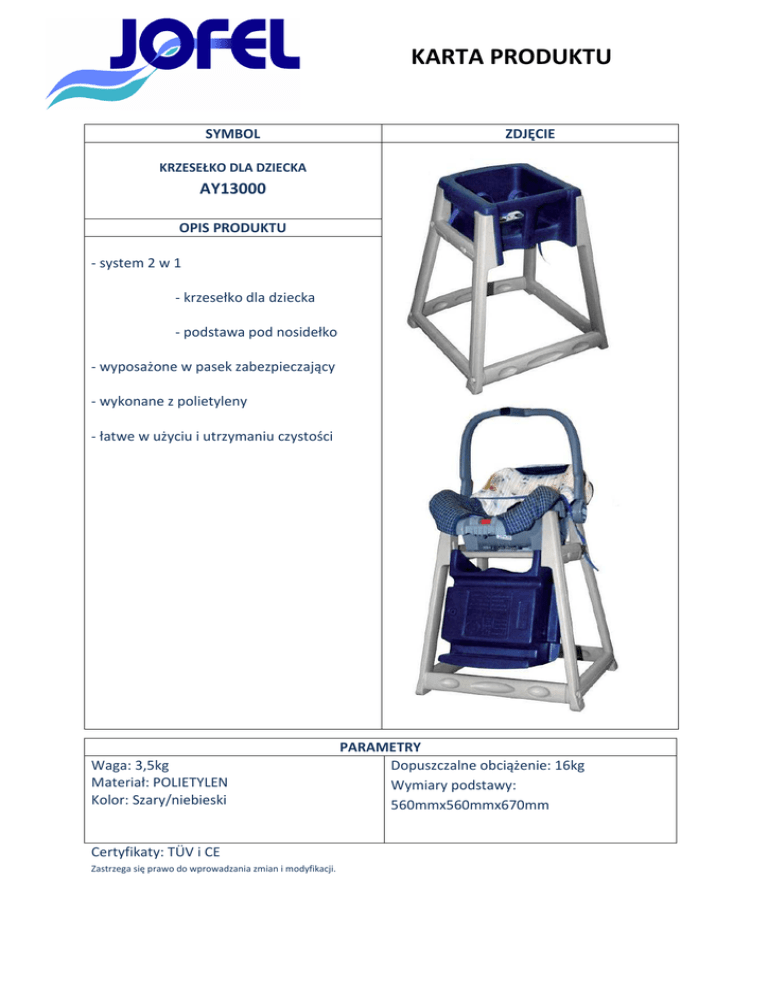 KARTA PRODUKTU SYMBOL ZDJĘCIE KRZESEŁKO DLA DZIECKA AY13000 OPIS PRODUKTU - system 2 w 1 - krzesełko dla dziecka - podstawa pod nosidełko - wyposażone w pasek zabezpieczający - wykonane z polietyleny - łatwe w użyciu i utrzymaniu czystości Waga: 3,5kg Materiał: POLIETYLEN Kolor: Szary/niebieski Certyfikaty: TÜV i CE Zastrzega się prawo do wprowadzania zmian i modyfikacji. PARAMETRY Dopuszczalne obciążenie: 16kg Wymiary podstawy: 560mmx560mmx670mm