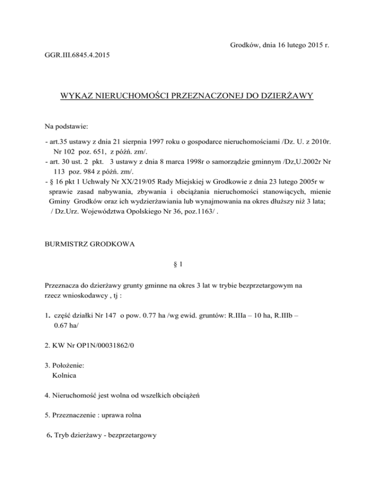 Grodków, dnia 16 lutego 2015 r. GGR.III.6845.4.2015 WYKAZ NIERUCHOMOŚCI PRZEZNACZONEJ DO DZIERŻAWY Na podstawie: - art.35 ustawy z dnia 21 sierpnia 1997 roku o gospodarce nieruchomościami /Dz. U. z 2010r. Nr 102 poz. 651, z późń. zm/. - art. 30 ust. 2 pkt. 3 ustawy z dnia 8 marca 1998r o samorządzie gminnym /Dz,U.2002r Nr 113 poz. 984 z póżń. zm/. - § 16 pkt 1 Uchwały Nr XX/219/05 Rady Miejskiej w Grodkowie z dnia 23 lutego 2005r w sprawie zasad nabywania, zbywania i obciążania nieruchomości stanowiących, mienie Gminy Grodków oraz ich wydzierżawiania lub wynajmowania na okres dłuższy niż 3 lata; / Dz.Urz. Województwa Opolskiego Nr 36, poz.1163/ . BURMISTRZ GRODKOWA §1 Przeznacza do dzierżawy grunty gminne na okres 3 lat w trybie bezprzetargowym na rzecz wnioskodawcy , tj : 1. część działki Nr 147 o pow. 0.77 ha /wg ewid. gruntów: R.IIIa – 10 ha, R.IIIb – 0.67 ha/ 2. KW Nr OP1N/00031862/0 3. Położenie: Kolnica 4. Nieruchomość jest wolna od wszelkich obciążeń 5. Przeznaczenie : uprawa rolna 6. Tryb dzierżawy - bezprzetargowy -2- 7.Czynsz dzierżawny gminnej nieruchomości opisanej w pkt l na podstawie; Zarządzenia Nr BR-0050.111.2011 Burmistrza Grodkowa z dnia 14 października 2011r w sprawie określenia wysokości stawek czynszu najmu i dzierżawy za lokale i inne mienie stanowiące własność Gminy Grodków wynosi w stosunku rocznym : 169,40 zł / słownie złotych: sto sześćdziesiąt dziewięć, 40/100 /. §2 Wykaz ten zostaje wywieszony na okres 21 dni na tablicy ogłoszeń Urzędu Miejskiego, w Grodkowie oraz sołectwa na terenie, którego położona jest ww. nieruchomość oraz na stronie internetowej – Biuletyn Informacji Publicznej Urzędu Miejskiego w Grodkowie. Ponadto informacja o niniejszym Wykazie zostaje podana w prasie lokalnej – Panorama Powiatu Brzeskiego Po upływie tego terminu powyższa nieruchomość zostanie wydzierżawiona w oparciu o § 1. pkt 6 na rzecz wnioskodawcy. §3 Niniejszy wykaz podano do publicznej wiadomości od dnia 17 lutego 2015 r. do dnia 09 marca 2015 r. Burmistrz Grodkowa Marek Antoniewicz