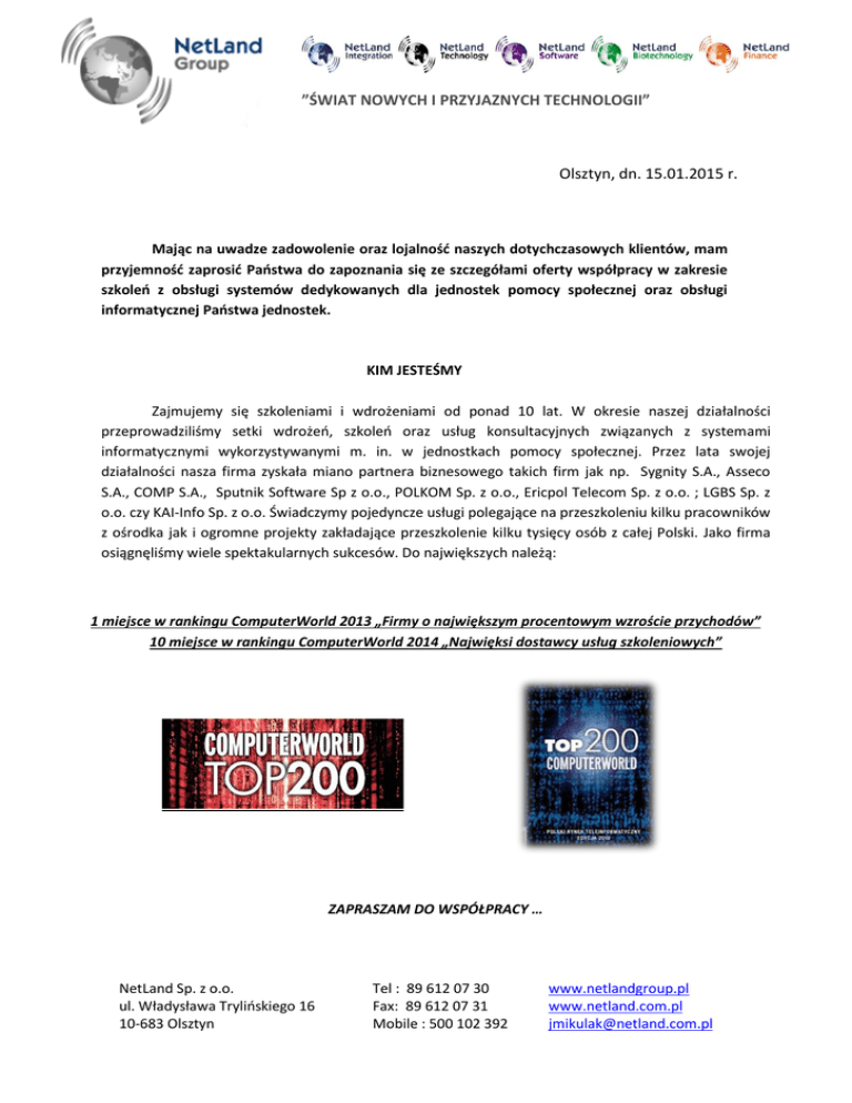 ”ŚWIAT NOWYCH I PRZYJAZNYCH TECHNOLOGII” Olsztyn, dn. 15.01.2015 r. Mając na uwadze zadowolenie oraz lojalność naszych dotychczasowych klientów, mam przyjemność zaprosić Państwa do zapoznania się ze szczegółami oferty współpracy w zakresie szkoleń z obsługi systemów dedykowanych dla jednostek pomocy społecznej oraz obsługi informatycznej Państwa jednostek. KIM JESTEŚMY Zajmujemy się szkoleniami i wdrożeniami od ponad 10 lat. W okresie naszej działalności przeprowadziliśmy setki wdrożeń, szkoleń oraz usług konsultacyjnych związanych z systemami informatycznymi wykorzystywanymi m. in. w jednostkach pomocy społecznej. Przez lata swojej działalności nasza firma zyskała miano partnera biznesowego takich firm jak np. Sygnity S.A., Asseco S.A., COMP S.A., Sputnik Software Sp z o.o., POLKOM Sp. z o.o., Ericpol Telecom Sp. z o.o. ; LGBS Sp. z o.o. czy KAI-Info Sp. z o.o. Świadczymy pojedyncze usługi polegające na przeszkoleniu kilku pracowników z ośrodka jak i ogromne projekty zakładające przeszkolenie kilku tysięcy osób z całej Polski. Jako firma osiągnęliśmy wiele spektakularnych sukcesów. Do największych należą: 1 miejsce w rankingu ComputerWorld 2013 „Firmy o największym procentowym wzroście przychodów” 10 miejsce w rankingu ComputerWorld 2014 „Najwięksi dostawcy usług szkoleniowych” ZAPRASZAM DO WSPÓŁPRACY … NetLand Sp. z o.o. ul. Władysława Trylińskiego 16 10-683 Olsztyn Tel : 89 612 07 30 Fax: 89 612 07 31 Mobile : 500 102 392 www.netlandgroup.pl www.netland.com.pl [email protected] ”ŚWIAT NOWYCH I PRZYJAZNYCH TECHNOLOGII” OFERTA Niniejsza oferta zakłada podział na cztery warianty usług. Każdy z wariantów przedstawia odrębną usługę, z której możecie Państwo skorzystać w zależności od zaistniałych potrzeb. Wszystkie usługi dotyczą systemów przeznaczonych dla jednostek pomocy społecznej firmy Sygnity S.A., tj. : POMOST STD, WSPARCIE RODZINY, PIECZA ZASTĘPCZA, EMP@TIA, ZI ŚWIADCZENIA RODZINNE, FUNDUSZ ALIMENTACYJNY, MODUŁ WIDNYKACJE DODATKI MIESZKANIOWE, DODATEK ENERGETYCZNY STYPENDIA CENTRALNA APLIKACJA STATYSTYCZNA (CAS) SZKOLENIE PRZYSTANOWISKOWE W ramach usługi nasi inżynierowie przeprowadzą szkolenie przystnowiskowe (konsultacja) dla użytkowników ww. systemów. Wsparcie ma na celu wyjaśnienie problemów zgłaszanych przez użytkowników oraz weryfikację poprawności wprowadzanych do systemu danych. W ramach usługi nasi inżynierowie mogą wykonać konfigurację systemu, jego aktualizację lub usunięcie awarii w jego działaniu. Efektem szkolenia jest „pomoc doraźna” w sytuacjach niepożądanych. Pozwala ona również na wyeliminowanie kosztów związanych z koniecznością dojazdu do miejsca szkolenia. Koszt jednego dnia szkolenia przystanowiskowego wynosi 600, 00 zł brutto SZKOLENIE GRUPOWE W SIEDZIBIE JEDNOSTKI Usługa polegająca na przeprowadzeniu grupowego szkolenia w siedzibie Państwa jednostki. Zakres i tematyka zajęć jest indywidualnie uzgadniana w zależności od Państwa potrzeb. W ramach szkolenia zapewniamy niezbędny sprzęt (komputery dla uczestników oraz projektor), materiały szkoleniowe oraz wyżywienie w formie lunchu i przerwy kawowej. Każde szkolenie kończy się egzaminem oraz uzyskaniem zaświadczenia o ukończeniu szkolenia. Do uruchomienia cyklu szkoleniowego niezbędne jest zebranie grupy co najmniej 8 osób oraz udostępnienie sali szkoleniowej. Rozwiązanie idealne w sytuacji gdy zaszła potrzeba przeszkolenia większej ilości osób z jednej tematyki. Koszt przeszkolenia jednej osoby wynosi 160, 00 zł brutto / dzień NetLand Sp. z o.o. ul. Władysława Trylińskiego 16 10-683 Olsztyn Tel : 89 612 07 30 Fax: 89 612 07 31 Mobile : 500 102 392 www.netlandgroup.pl www.netland.com.pl [email protected] ”ŚWIAT NOWYCH I PRZYJAZNYCH TECHNOLOGII” POMOC ZDALNA Stworzyliśmy nowy typ usługi pozwalającej na usprawnienie komunikacji pomiędzy klientem a naszymi konsultantami. Polega ona na wprowadzeniu możliwości bezpośredniego zdalnego połączenia z komputerem znajdującym się w Państwa jednostce. Dzięki połączeniu konsultant ma możliwość sterowania komputerem tak jakby przy nim siedział. Usługa pozwoli Państwu na naszą natychmiastową reakcję w sytuacjach awaryjnych, wesprze w problemach z systemami informatycznymi oraz co najważniejsze maksymalnie minimalizuje koszty związane z utrzymaniem niezawodności informatycznej w Państwa jednostce. Znaczącym atutem rozwiązania jest jego prostota i najwyższe bezpieczeństwo. Zezwolenie na dostęp do komputera nie wymaga konfiguracji urządzeń sieciowych oraz innych zabezpieczeń. Po zainstalowaniu programu na komputerze do którego chcemy się podłączyć, otrzymujecie Państwo specjalny identyfikator i hasło, które należy przekazać konsultantowi w celu zestawienia połączenia. Bezproblemowa praca, optymalna wydajność, najwyższy poziom bezpieczeństwa oraz zmniejszenie kosztów to tylko niektóre z oferowanych korzyści. Koszt usługi ustalany jest indywidualnie w zależności od zdeklarowanej ilości godzin jej dostępności NADZÓR INFORMATYCZNY Usługa zapewniająca Państwu płynność i niezawodność pracy. Zakłada ona podpisanie rocznej, półrocznej lub kwartalnej umowy, która gwarantuje opiekę informatyczną w określonej liczbie dni w miesiącu, w terminie dowolnie przez Państwa wyznaczonym. W ramach umowy nasi inżynierowie zobligowani są do prowadzenia następujących działań : prowadzenia konsultacji i szkoleń z zakresu obsługi systemów przeznaczonych dla jednostek pomocy społecznej pomoc przy wprowadzaniu danych do systemów, generowaniu sprawozdań w formie elektronicznej, archiwizacji danych, itp. budowa serwisów WWW i ich aktualizacja. administrowanie siecią informatyczną, bieżące usuwanie problemów ze sprzętem komputerowym, fachowe doradztwo i oferta cenowa w przypadku potrzeby zakupu dodatkowego sprzętu komputerowego i oprogramowan