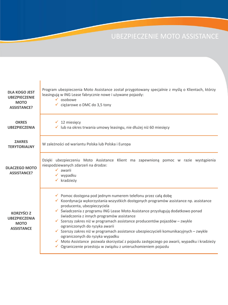 UBEZPIECZENIE MOTO ASSISTANCE DLA KOGO JEST UBEZPIECZENIE MOTO ASSISTANCE? OKRES UBEZPIECZENIA ZAKRES TERYTORIALNY DLACZEGO MOTO ASSISTANCE? KORZYŚCI Z UBEZPIECZENIA MOTO ASSISTANCE Program ubezpieczenia Moto Assistance został przygotowany specjalnie z myślą o Klientach, którzy leasingują w ING Lease fabrycznie nowe i używane pojazdy: osobowe ciężarowe o DMC do 3,5 tony 12 miesięcy lub na okres trwania umowy leasingu, nie dłużej niż 60 miesięcy W zależności od wariantu Polska lub Polska i Europa Dzięki ubezpieczeniu Moto Assistance Klient ma zapewnioną pomoc w razie wystąpienia niespodziewanych zdarzeń na drodze: awarii wypadku kradzieży Pomoc dostępna pod jednym numerem telefonu przez całą dobę Koordynacja wykorzystania wszystkich dostępnych programów assistance np. assistance producenta, ubezpieczyciela Świadczenia z programu ING Lease Moto Assistance przysługują dodatkowo ponad świadczenia z innych programów assistance Szerszy zakres niż w programach assistance producentów pojazdów – zwykle ograniczonych do ryzyka awarii Szerszy zakres niż w programach assistance ubezpieczycieli komunikacyjnych – zwykle ograniczonych do ryzyka wypadku Moto Assistance pozwala skorzystać z pojazdu zastępczego po awarii, wypadku i kradzieży Ograniczenie przestoju w związku z unieruchomieniem pojazdu UBEZPIECZENIE MOTO ASSISTANCE ZAKRES UBEZPIECZENIA SILVER GOLD PLATINIUM ZAKRES TERYTORIALNY Polska Europa Europa 25 km dla awarii zniesiony zniesiony POJAZD ZASTĘPCZY PO AWARII 2 dni 3 dni 3 dni POJAZD ZASTĘPCZY PO WYPADKU 3 dni 7 dni 10 dni POJAZD ZASTĘPCZY PO KRADZIEŻY 6 dni 14 dni 30 dni HOTEL 2 doby 3 doby 3 doby LIMIT ODLEGŁOŚCI MIEJSCA ZDARZENIA OD MIEJSCA ZAMIESZKANIA NAPRAWA POJAZDU NA MIEJSCU ZDARZENIA HOLOWANIE DO NAJBLIŻSZEGO ASO POWRÓT DO MIEJSCA ZAMIESZKANIA / KONTYNUACJA PODRÓŻY ODBIÓR NAPRAWIONEGO POJAZDU PARKING ZŁOMOWANIE POJAZDU DOSTARCZENIE ORYGINALNYCH CZĘŚCI (Świadczenie nie łączy się z pojazdem zastępczym) (jeśli organizowany był Powrót lub Kontynuacja podróży) 5 dni po awarii lub wypadku lub 1.000 PLN po szkodzie całkowitej 500 PLN